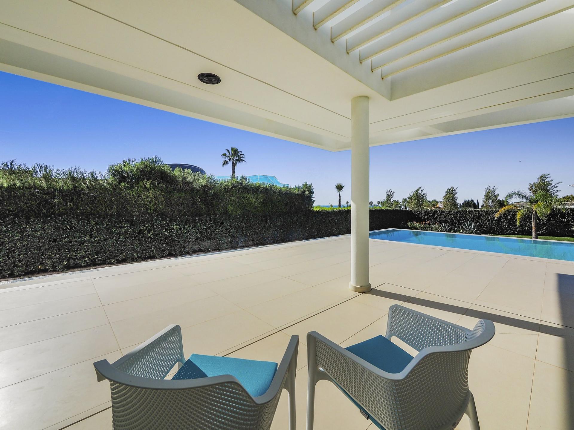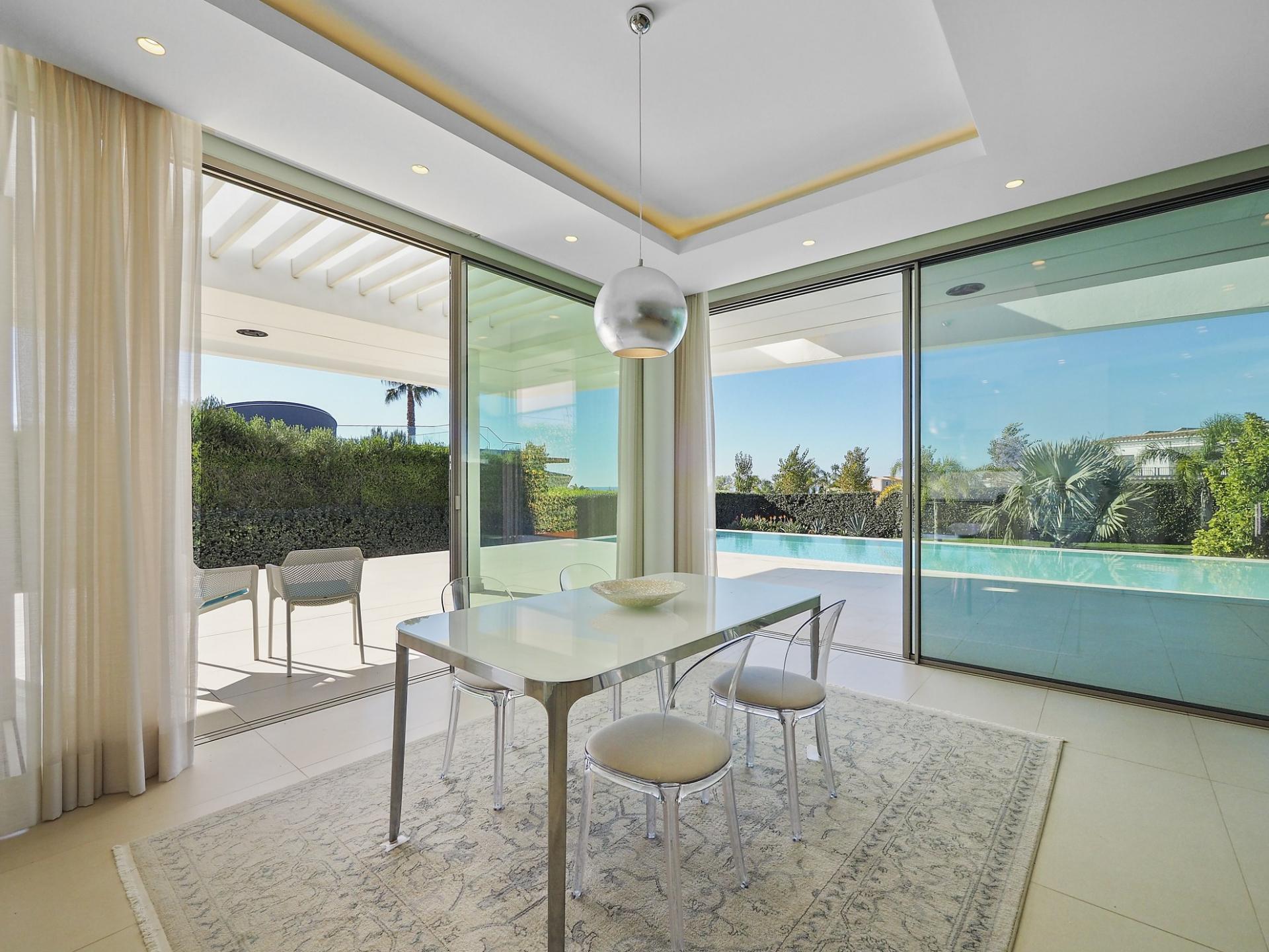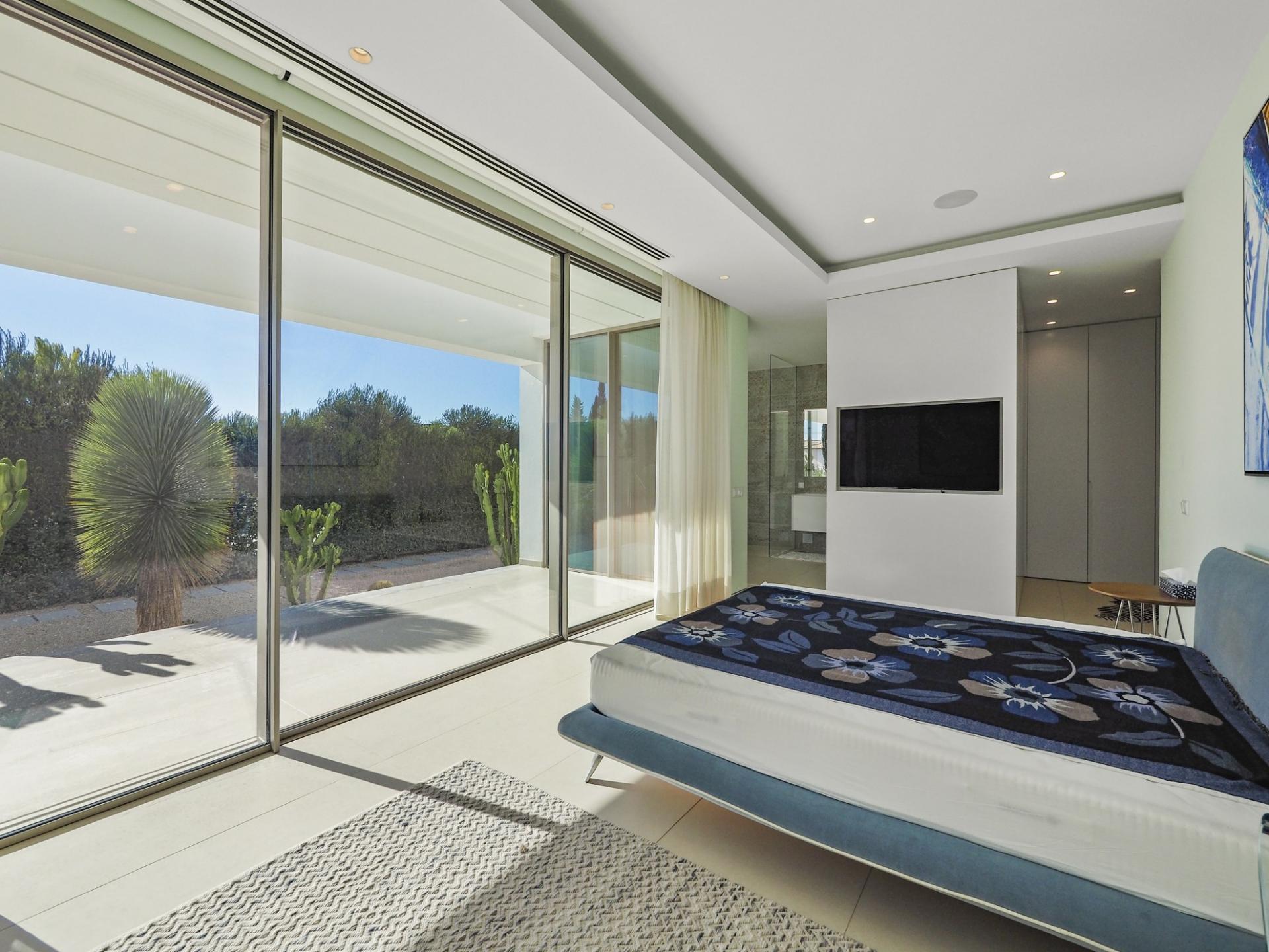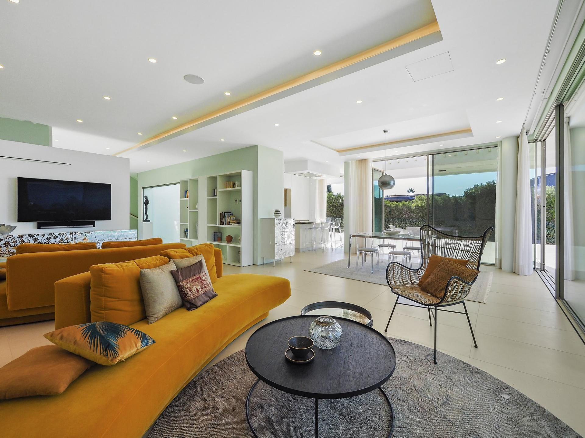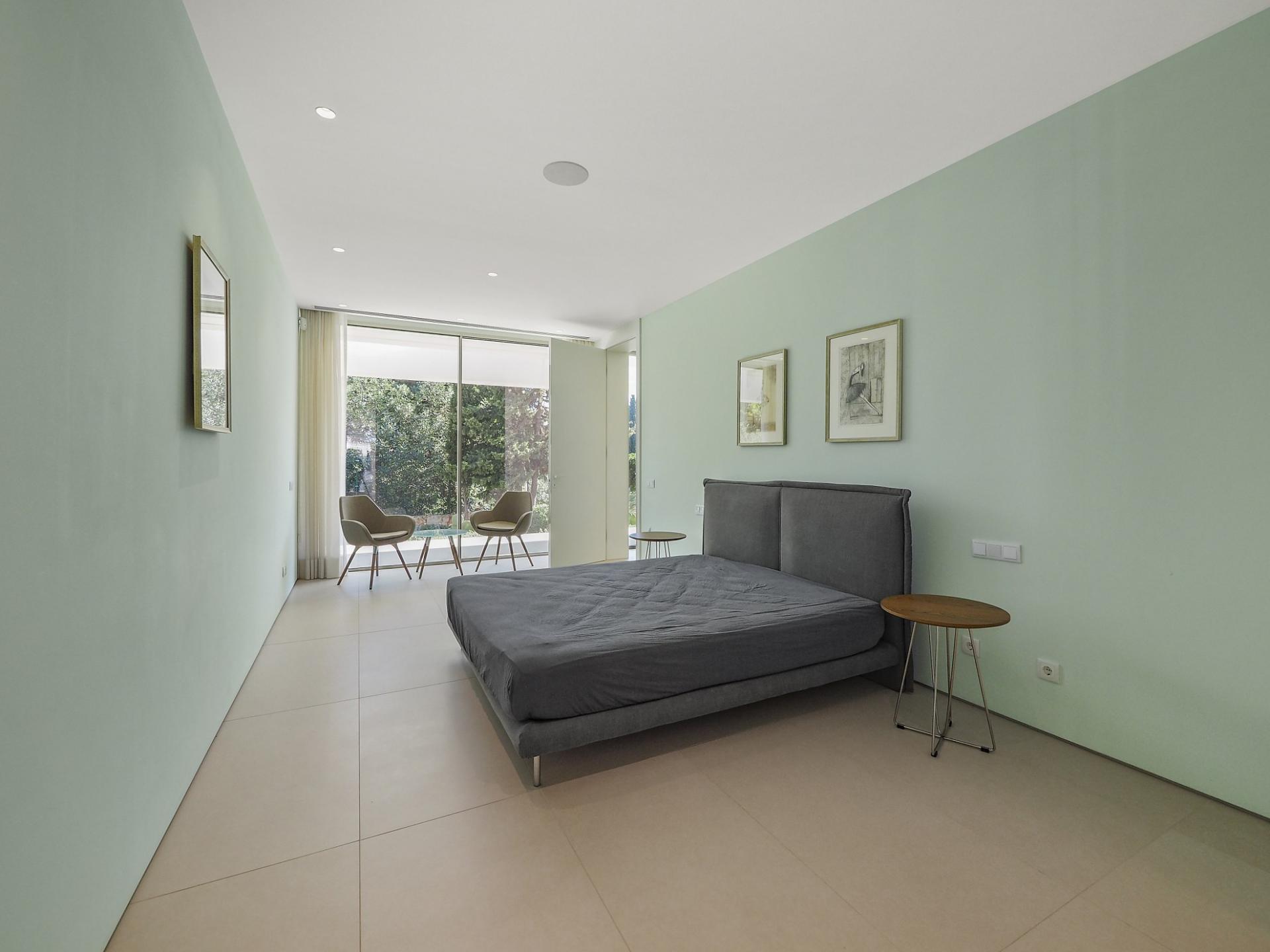 With a generous and well-distributed area, the villa has 4 bedrooms, all with en-suite, offering a peaceful and elegant environment. The spacious and bright living room features large picture windows offering views of the garden, pool and sea. The kitchen, fully equipped with high quality appliances, effuses the concept of the indoor/outdoor living with all windows folding back to expose the terrace and infinity pool. The property has underfloor heating and an integral air conditioning system.