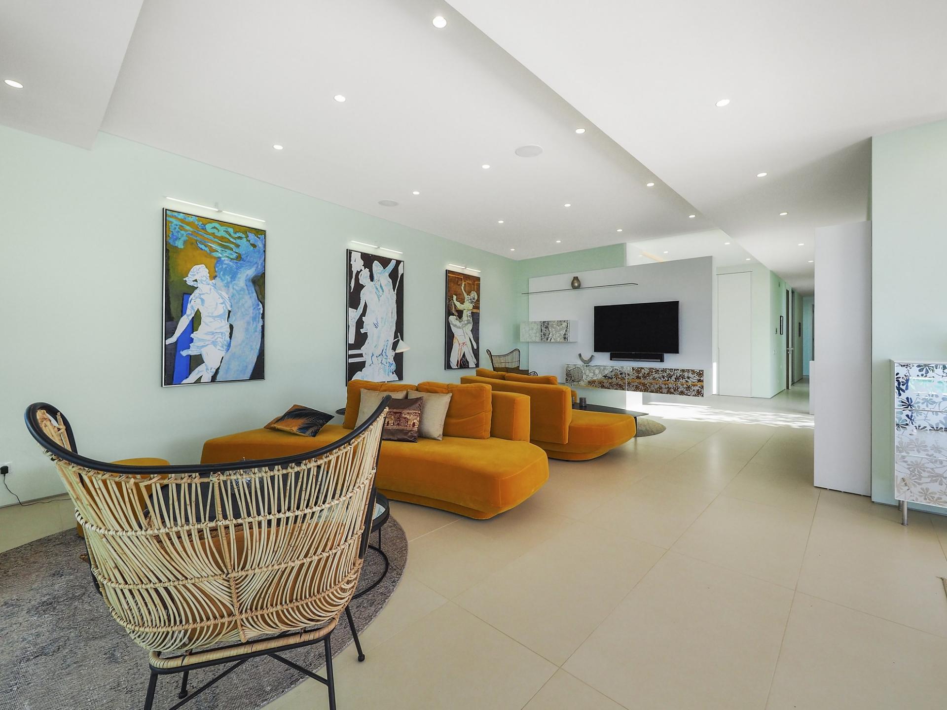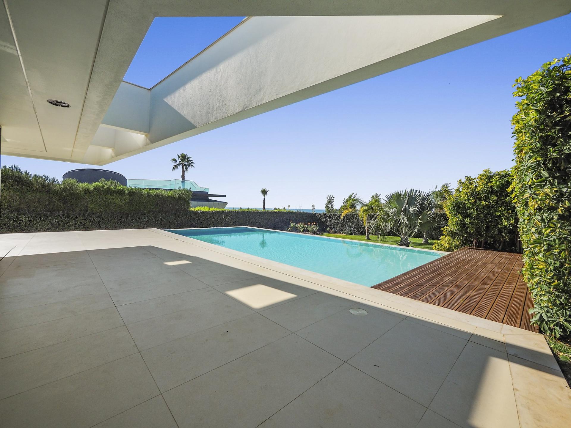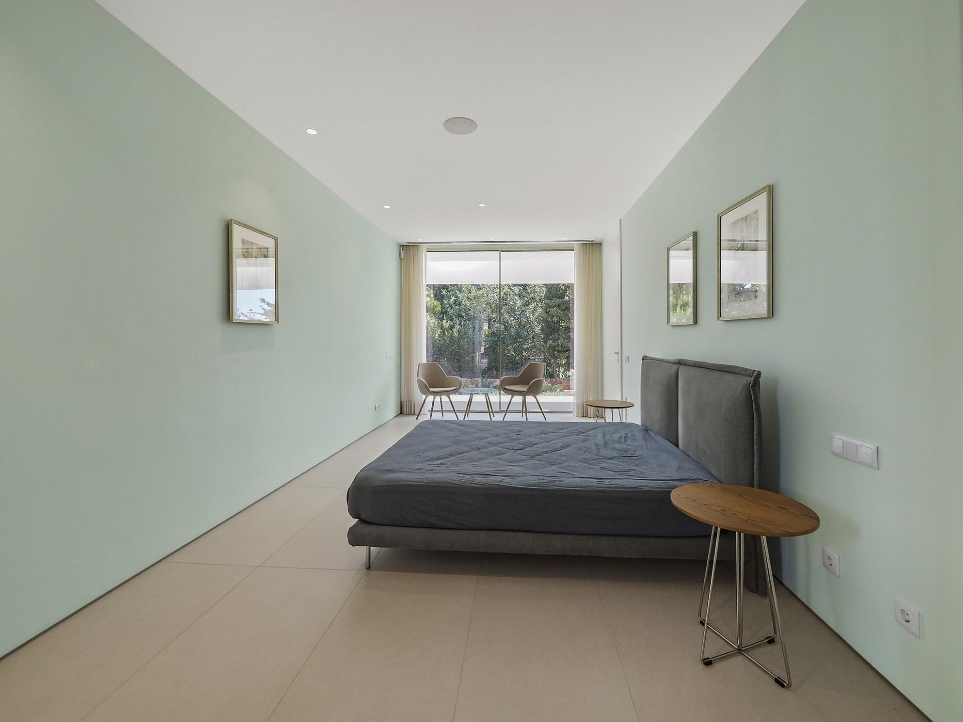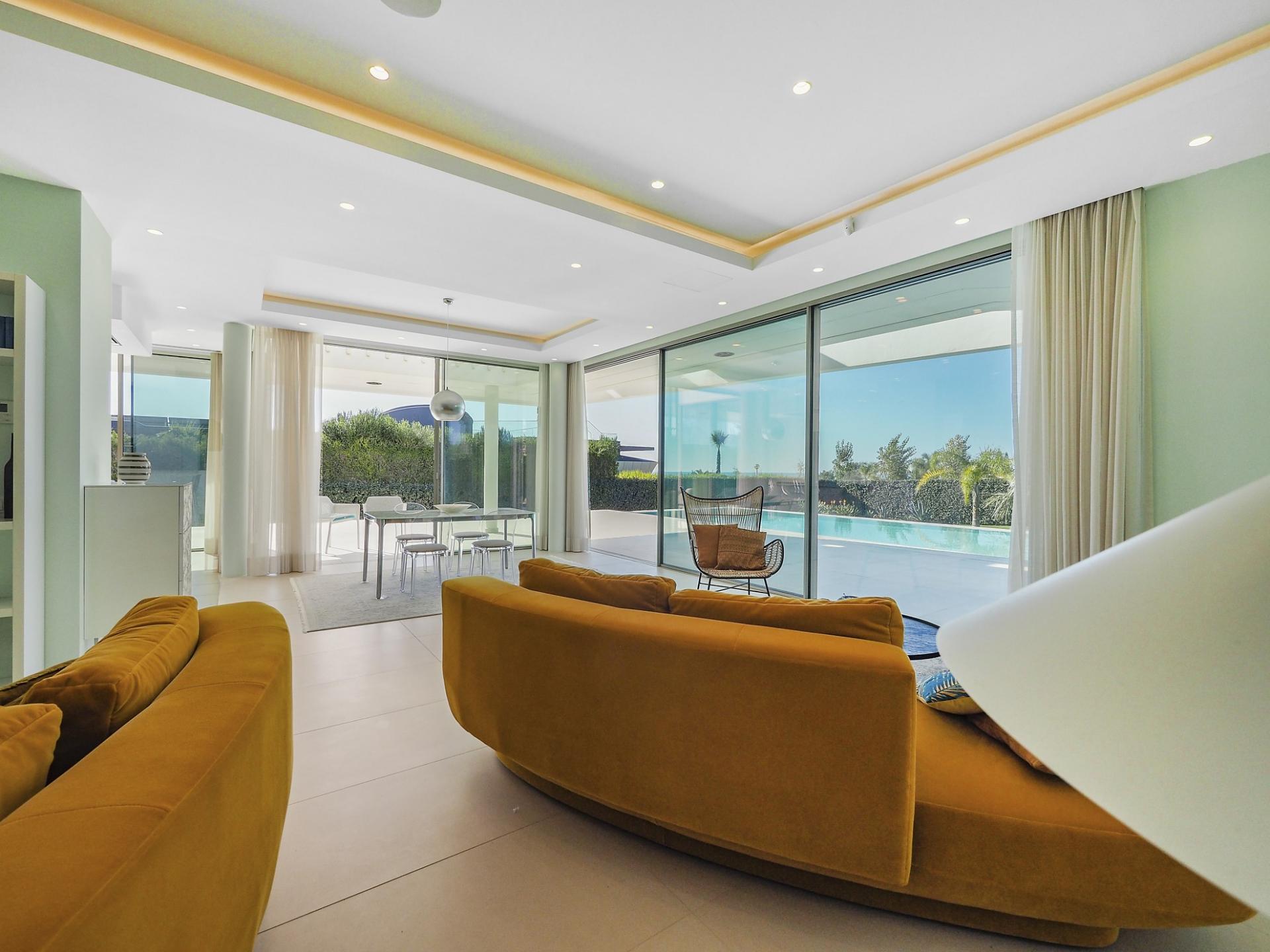 With a generous and well-distributed area, the villa has 4 bedrooms, all with en-suite, offering a peaceful and elegant environment. The spacious and bright living room features large picture windows offering views of the garden, pool and sea. The kitchen, fully equipped with high quality appliances, effuses the concept of the indoor/outdoor living with all windows folding back to expose the terrace and infinity pool. The property has underfloor heating and an integral air conditioning system.