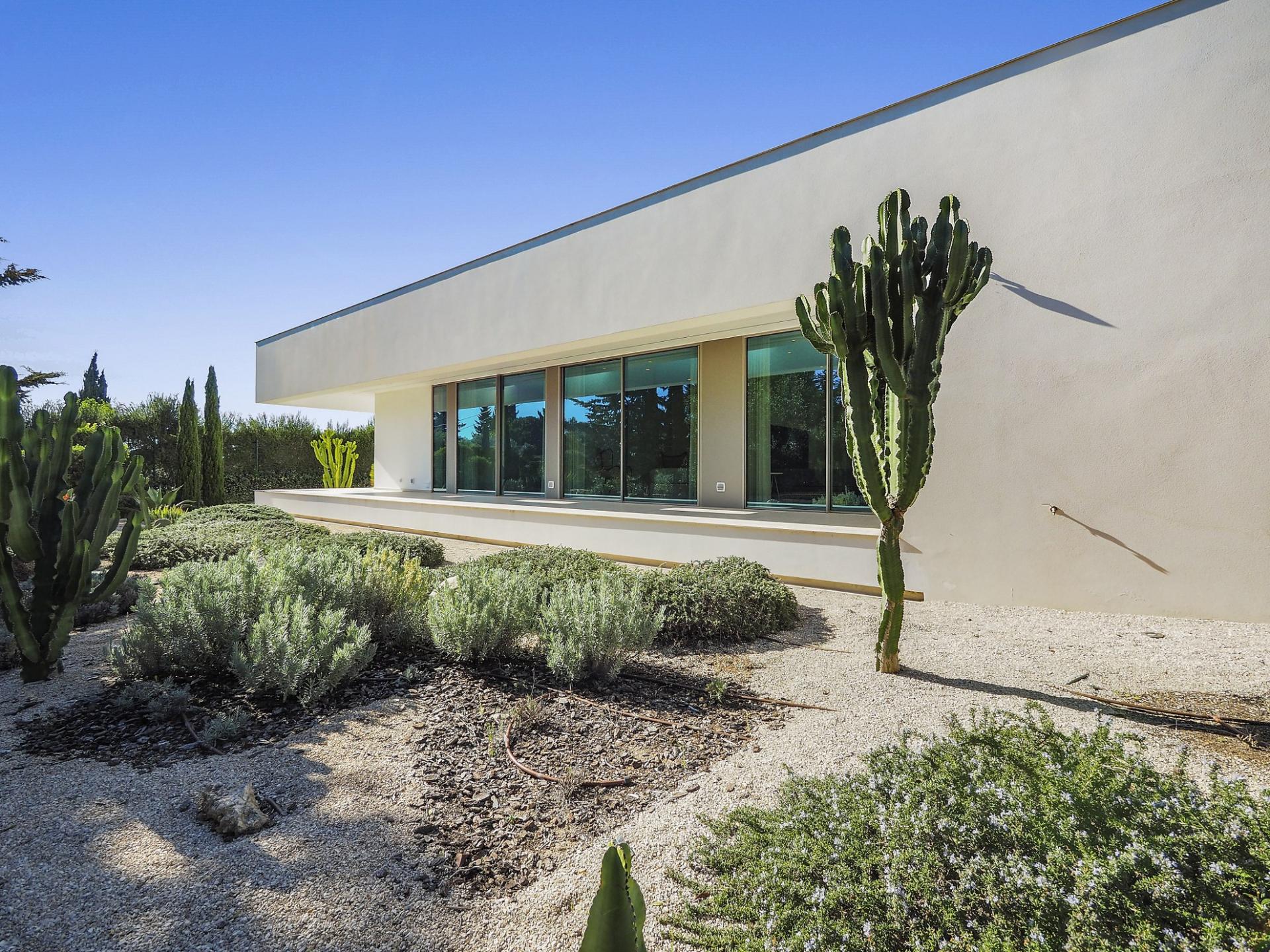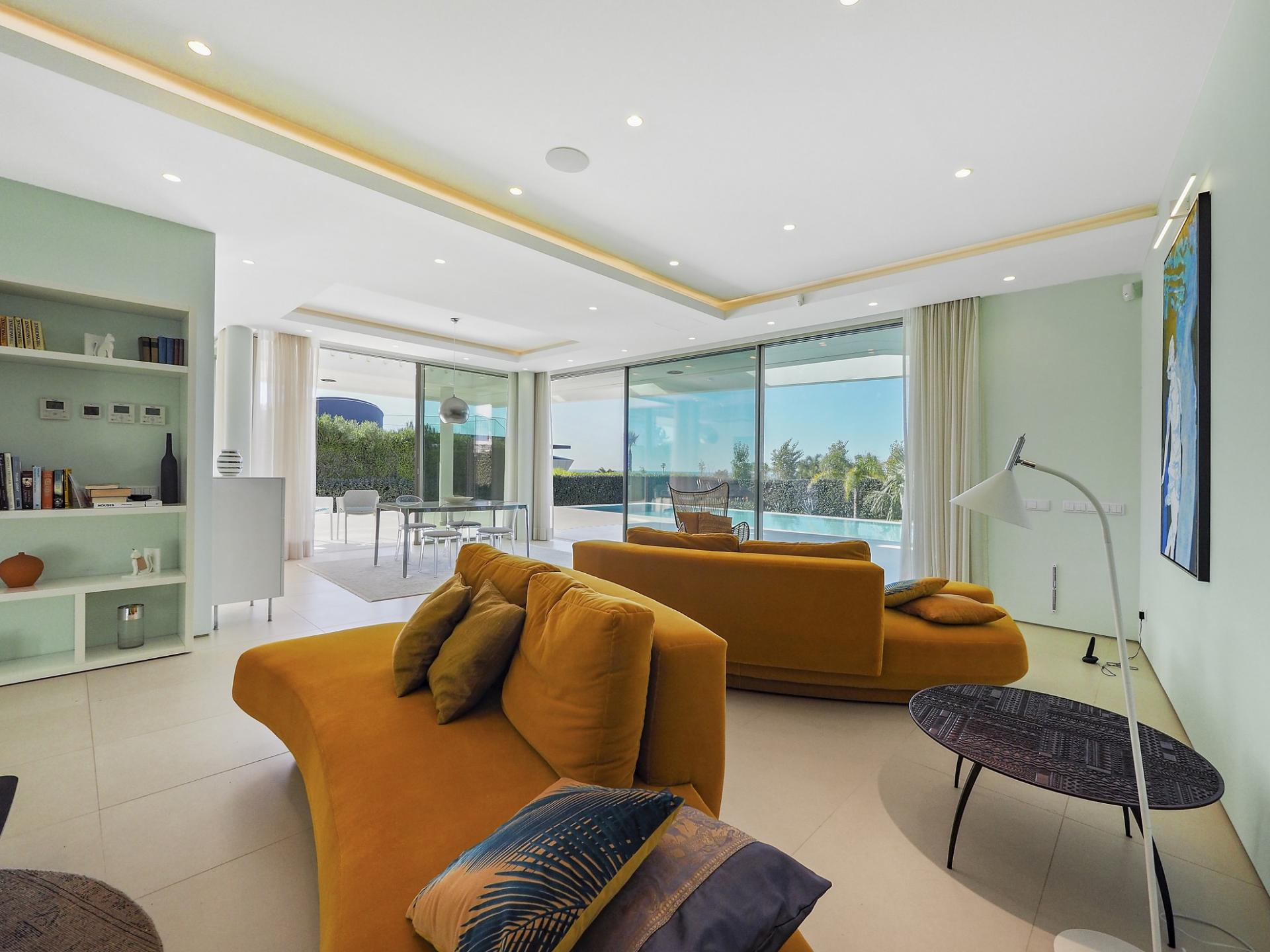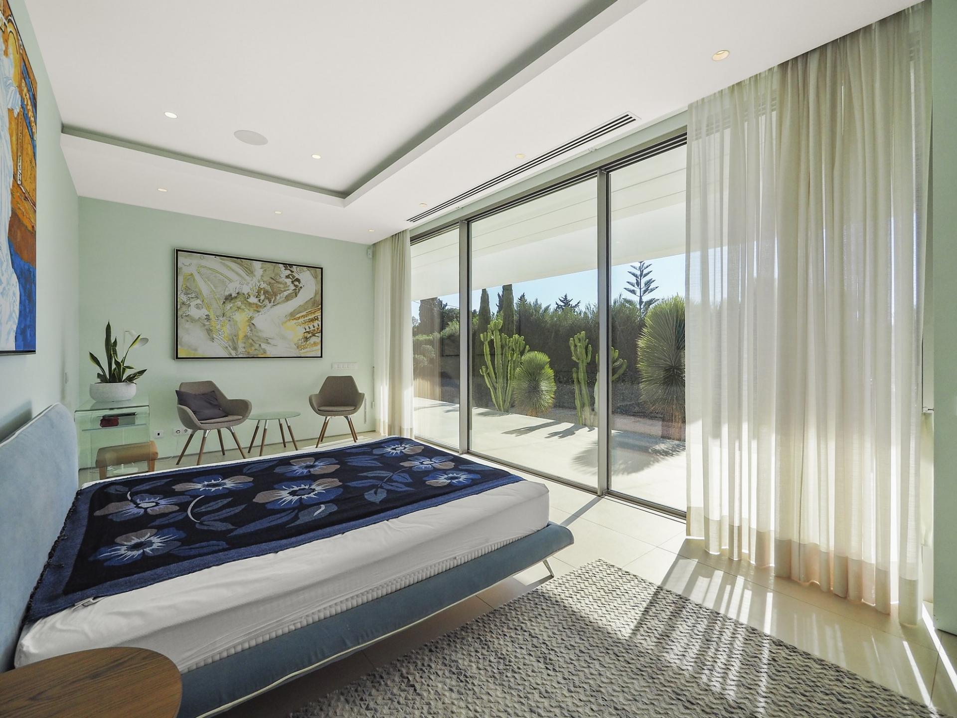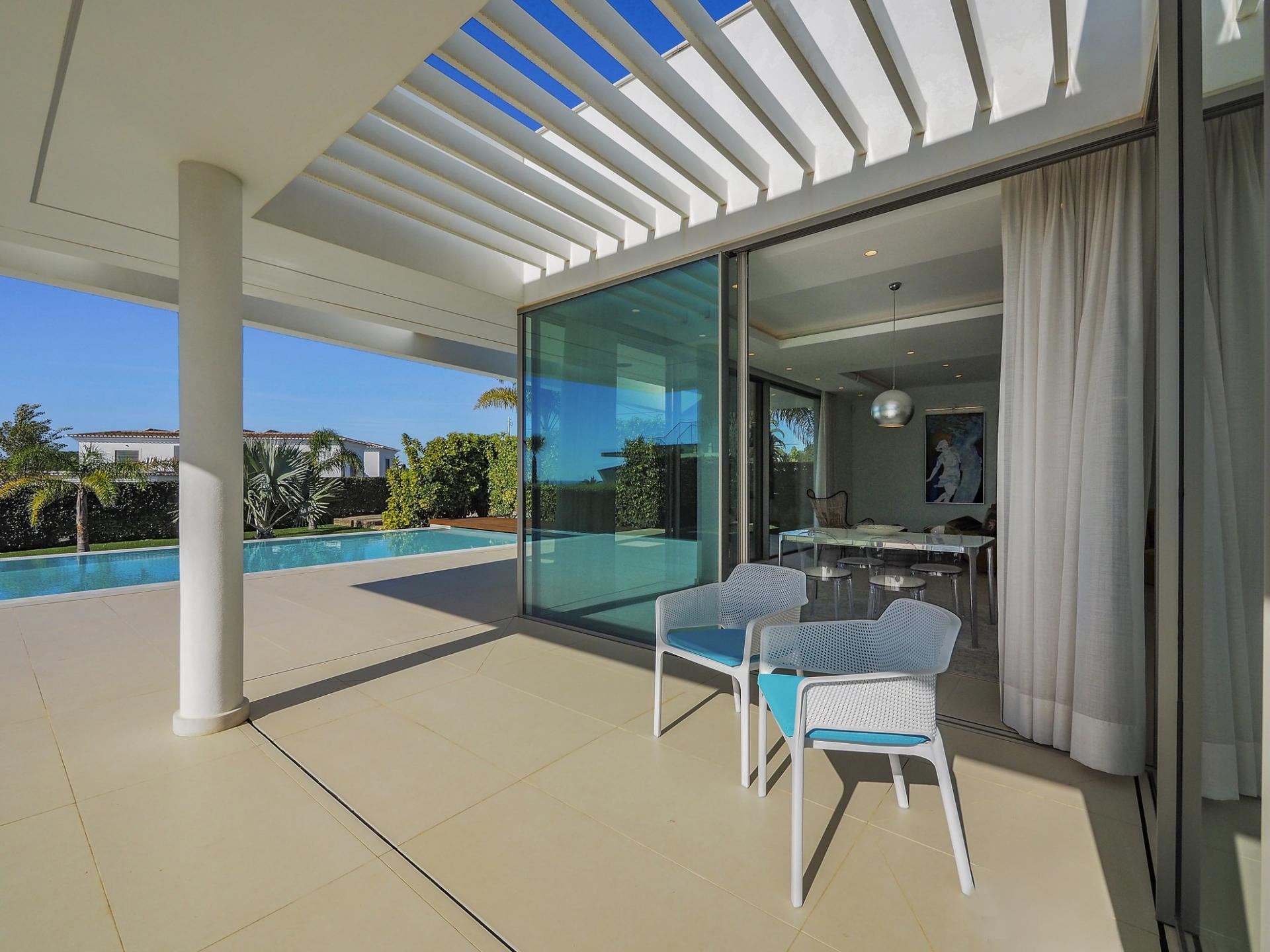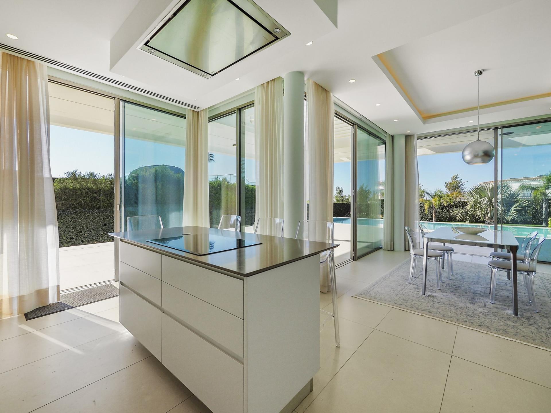 With a generous and well-distributed area, the villa has 4 bedrooms, all with en-suite, offering a peaceful and elegant environment. The spacious and bright living room features large picture windows offering views of the garden, pool and sea. The kitchen, fully equipped with high quality appliances, effuses the concept of the indoor/outdoor living with all windows folding back to expose the terrace and infinity pool. The property has underfloor heating and an integral air conditioning system.