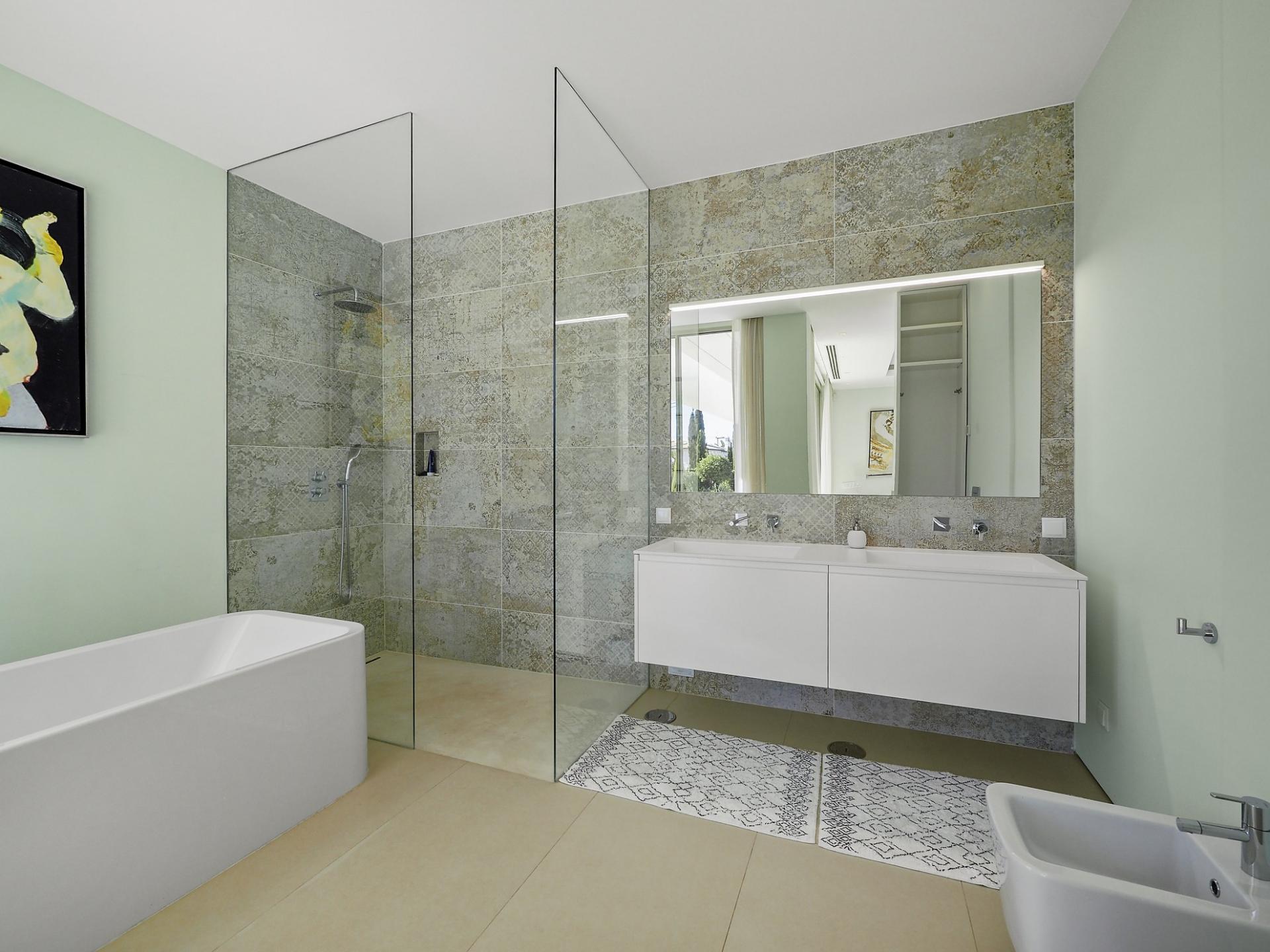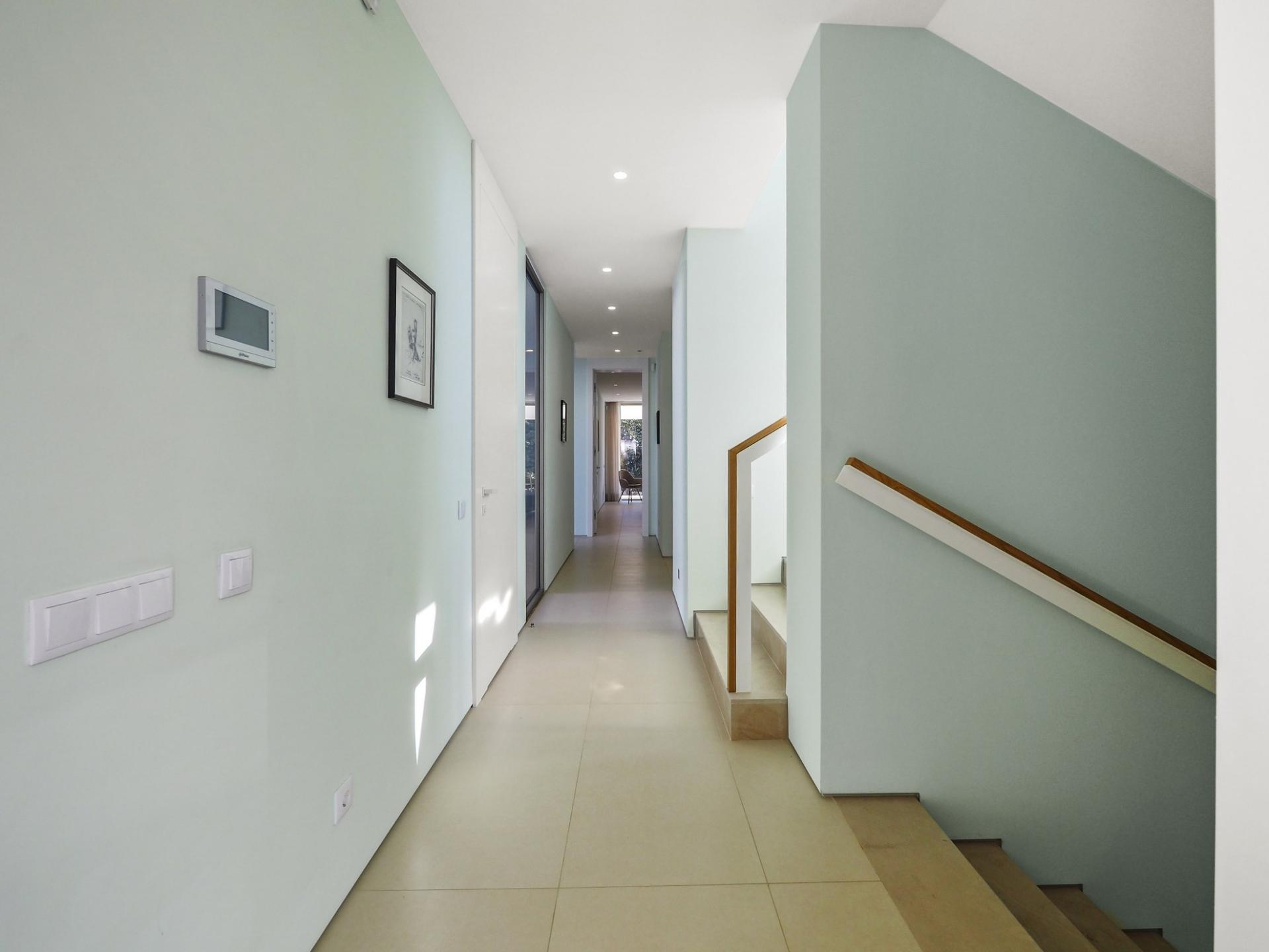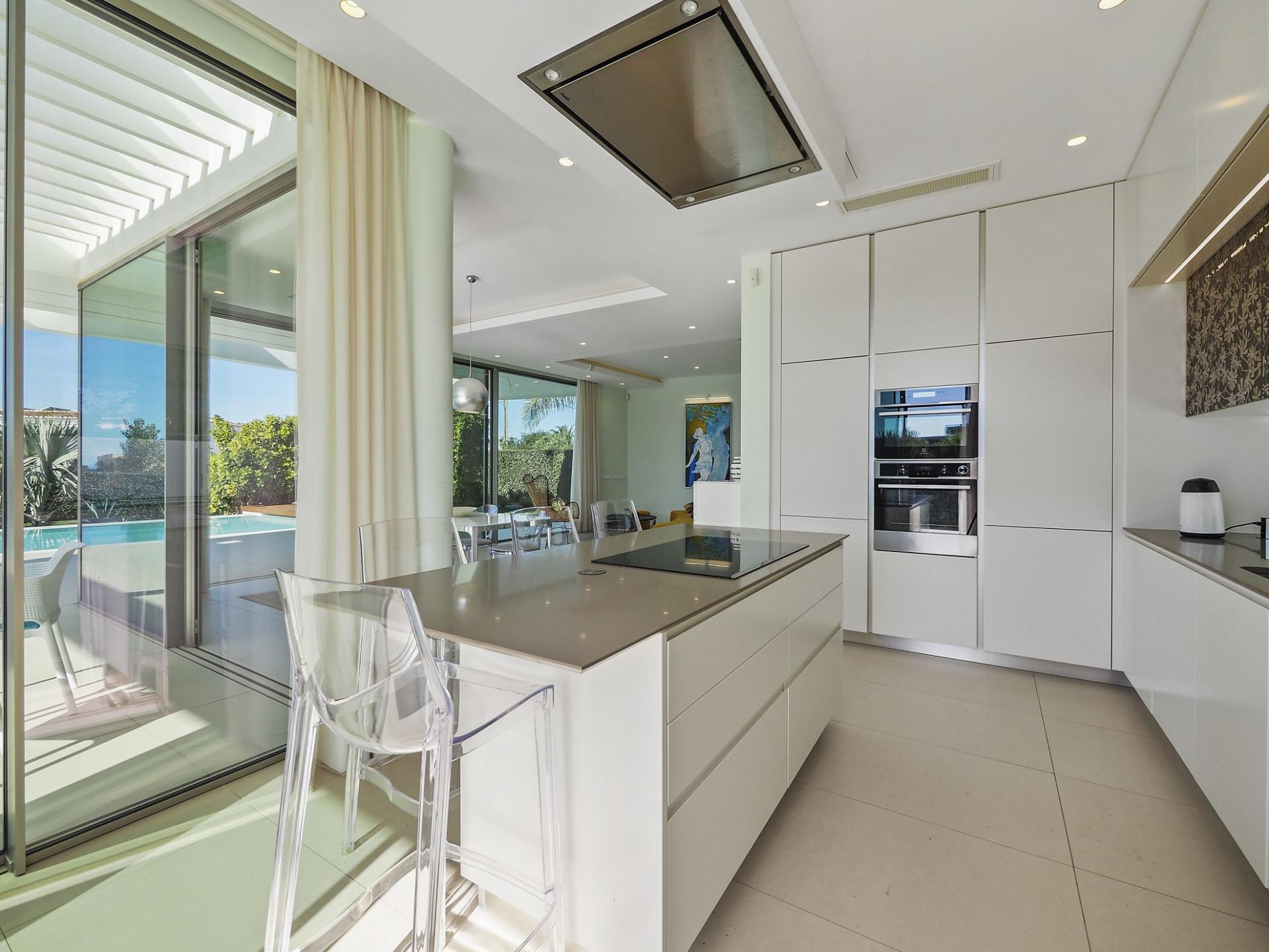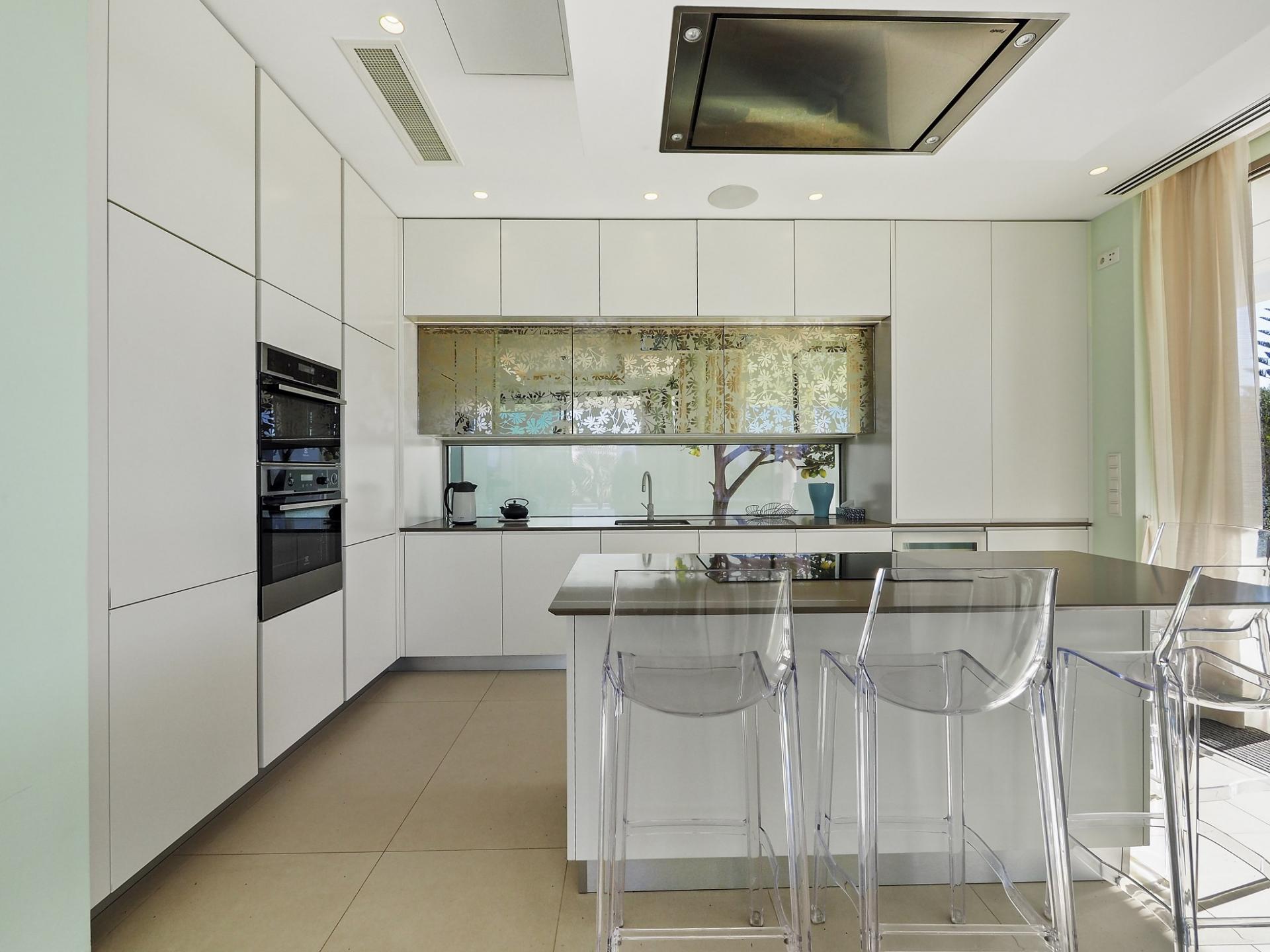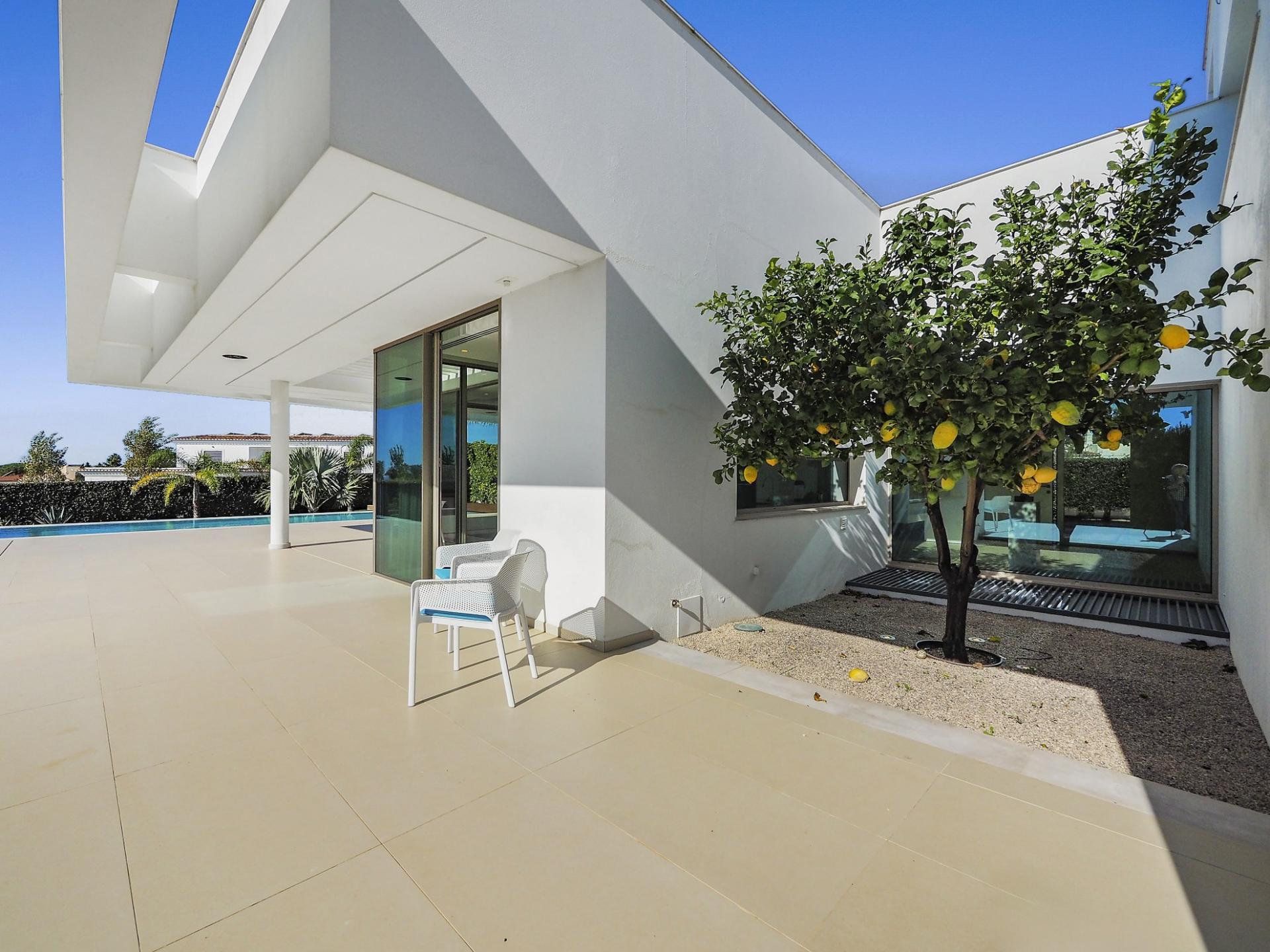 With a generous and well-distributed area, the villa has 4 bedrooms, all with en-suite, offering a peaceful and elegant environment. The spacious and bright living room features large picture windows offering views of the garden, pool and sea. The kitchen, fully equipped with high quality appliances, effuses the concept of the indoor/outdoor living with all windows folding back to expose the terrace and infinity pool. The property has underfloor heating and an integral air conditioning system.