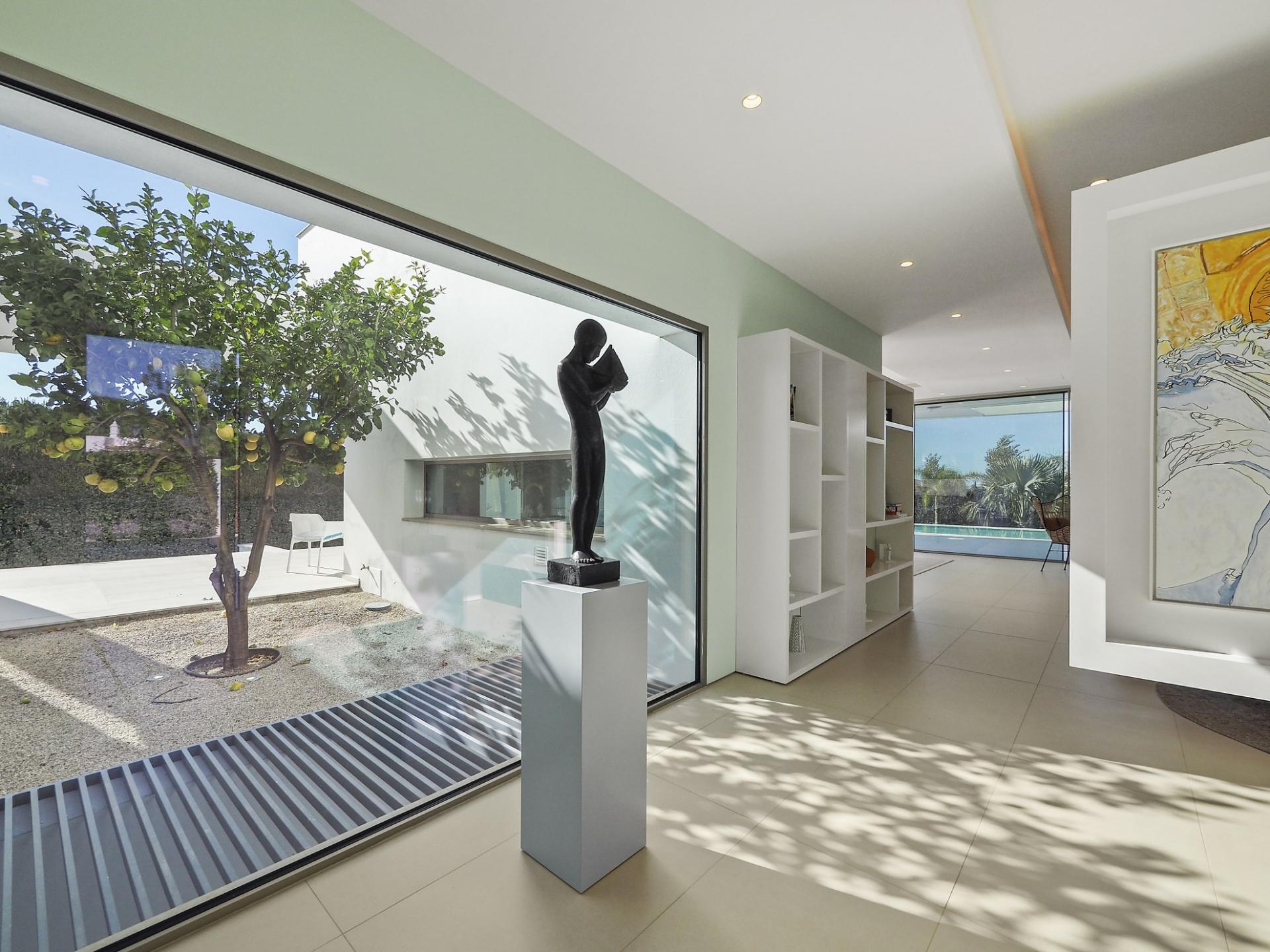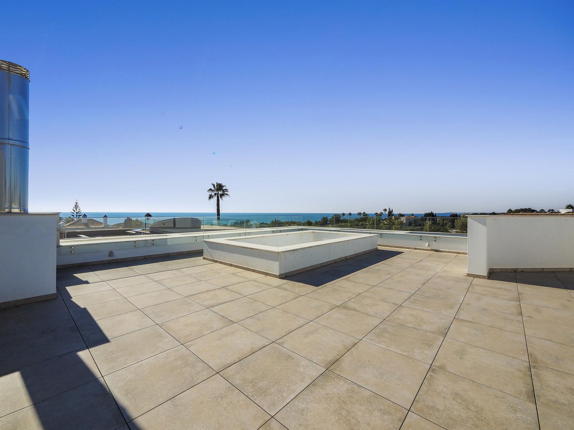 The exterior of the house is equally charming, with double car garage, a spacious terrace and infinity-style swimming pool with electric cover. The garden has been thoughtfully planned using lots of native plans and there are two large roof terraces taking in the panoramic views of the coastline to the south and the Monchique mountains to the north. There is also a large basement with plenty of room for a gym or cinema room.