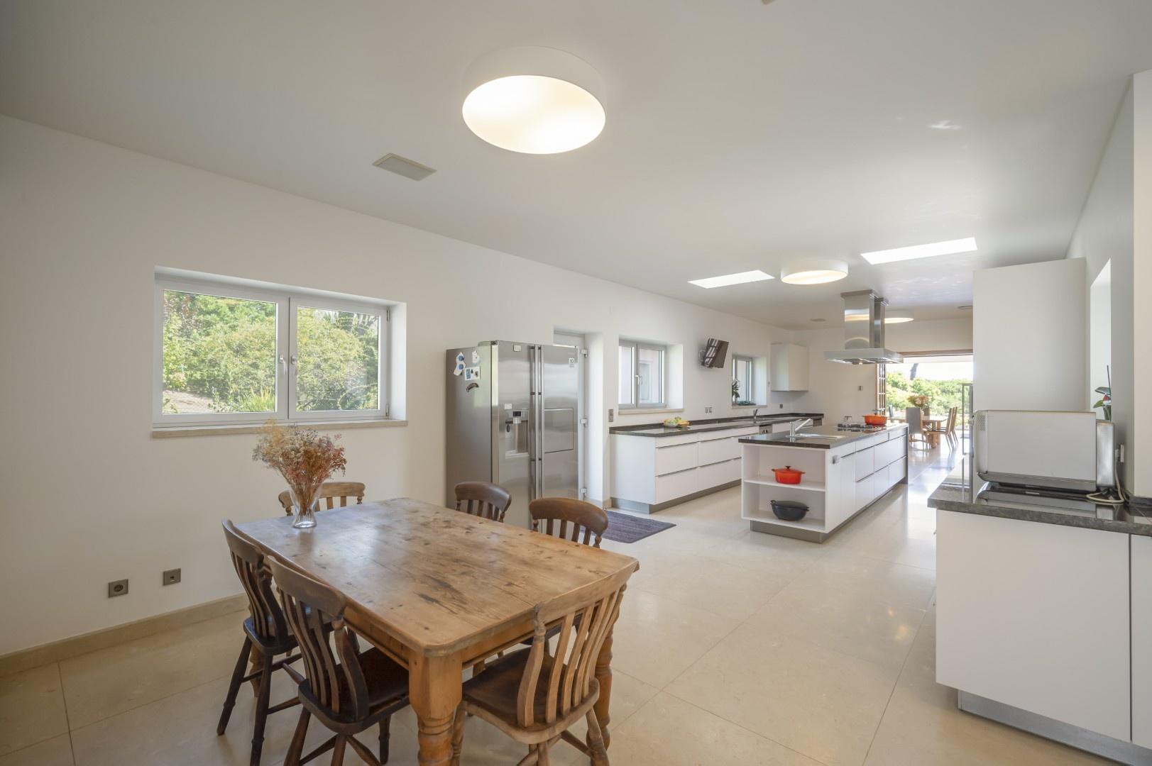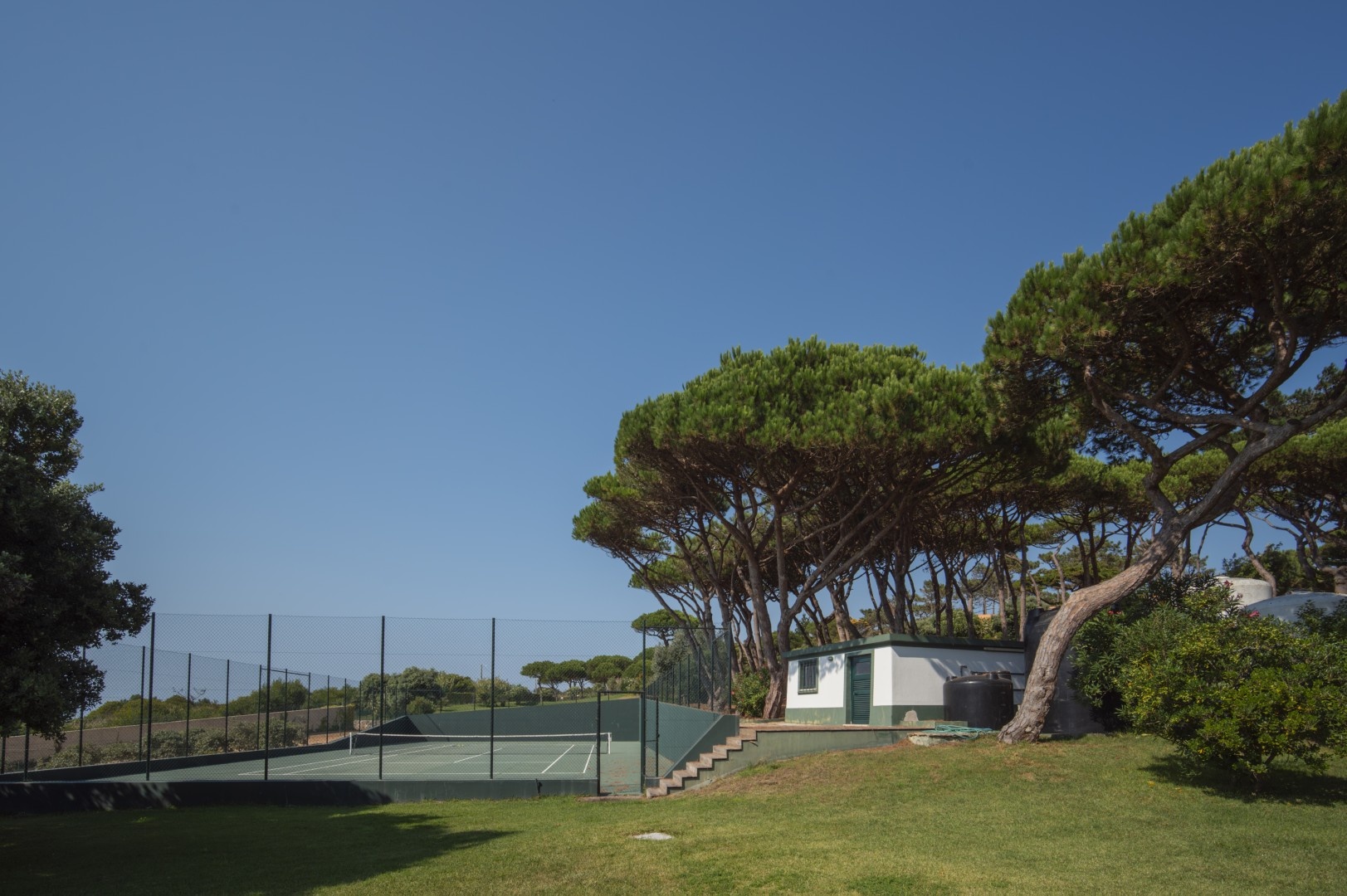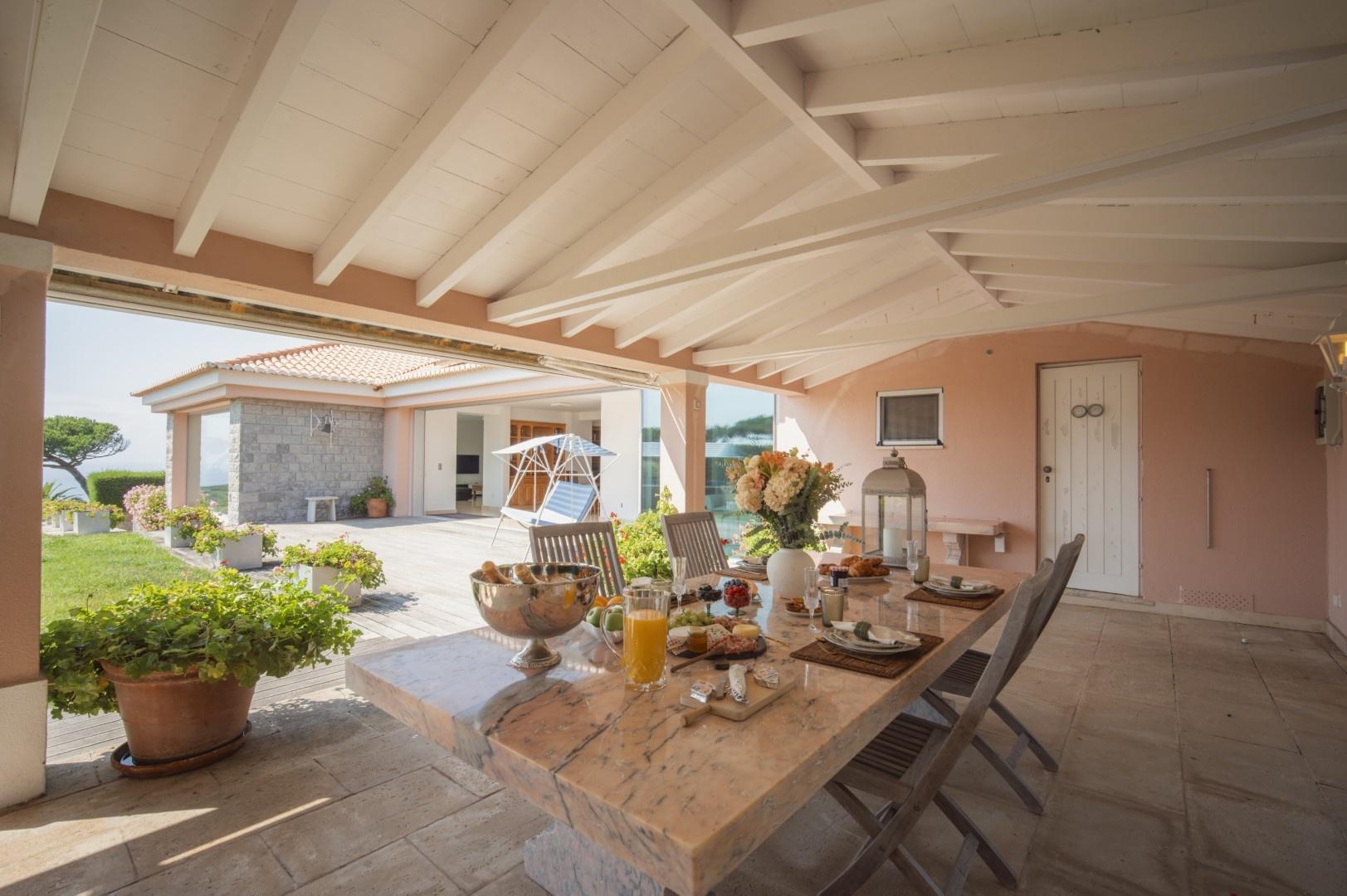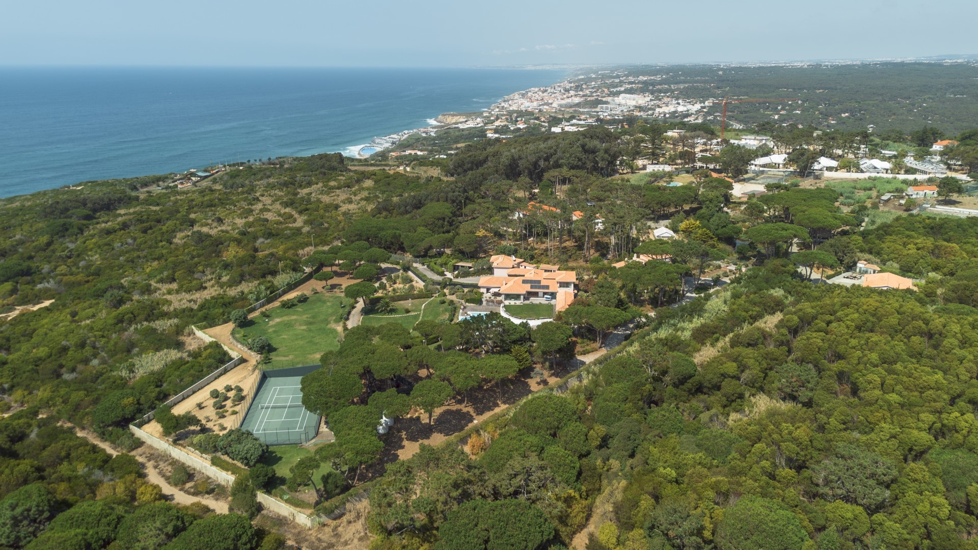 Additional features include a wine cellar, carport for four vehicles, tennis court, landscaped gardens with orchards and vegetable plots, a greenhouse, water wells and solar panels. The property is just a short walk from Praia Grande beach.