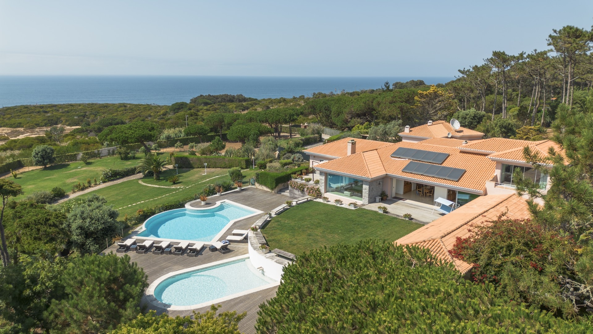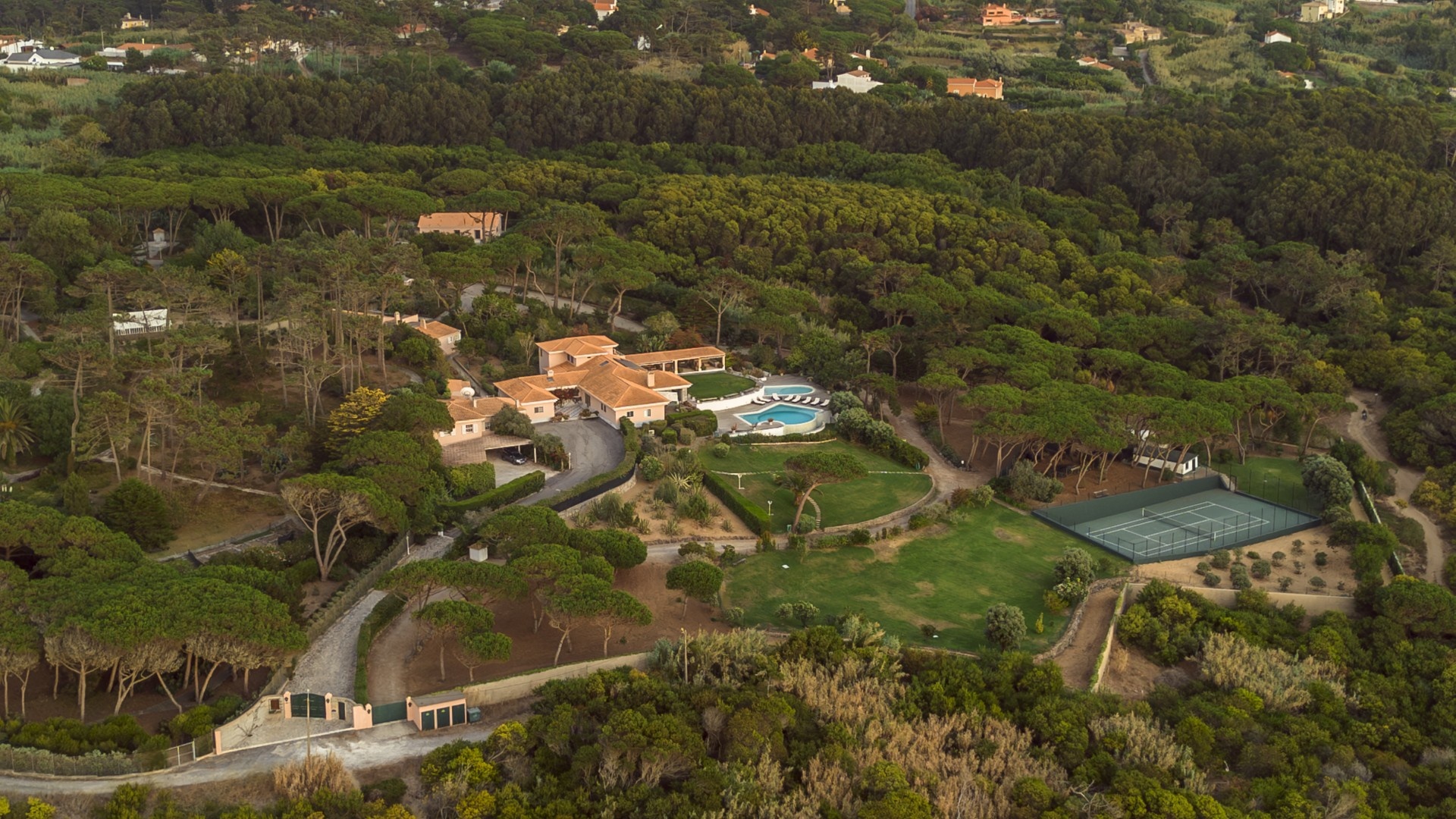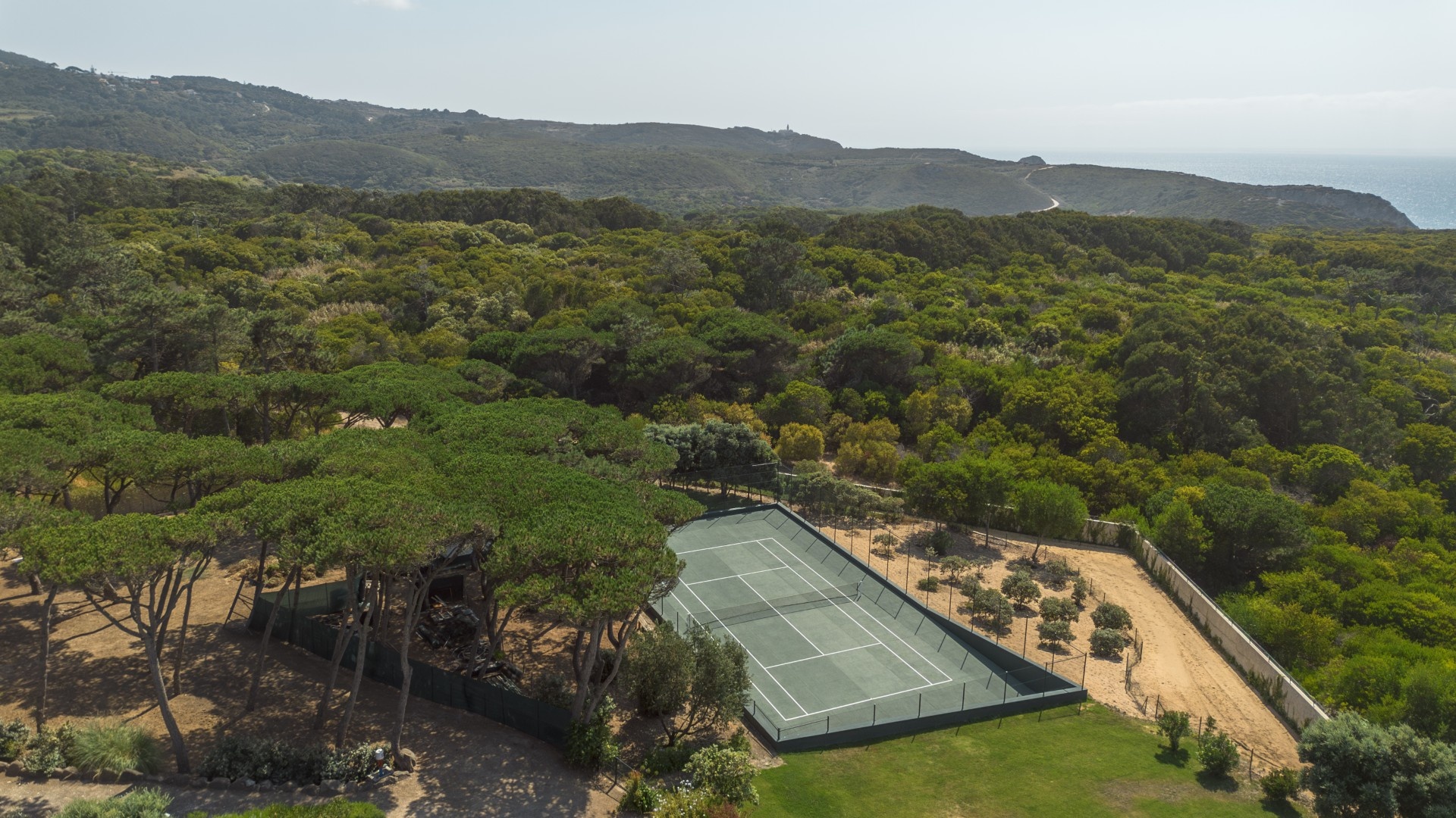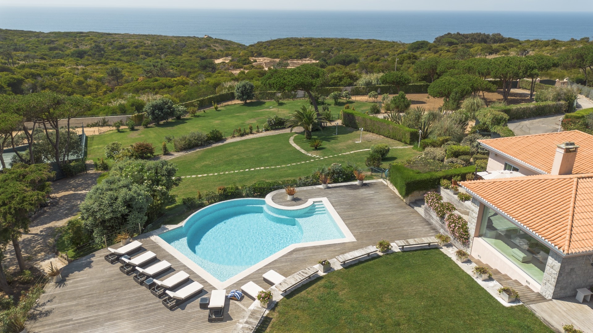 Additional features include a wine cellar, carport for four vehicles, tennis court, landscaped gardens with orchards and vegetable plots, a greenhouse, water wells and solar panels. The property is just a short walk from Praia Grande beach.