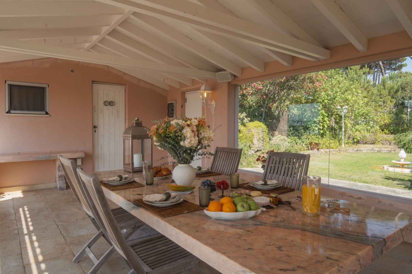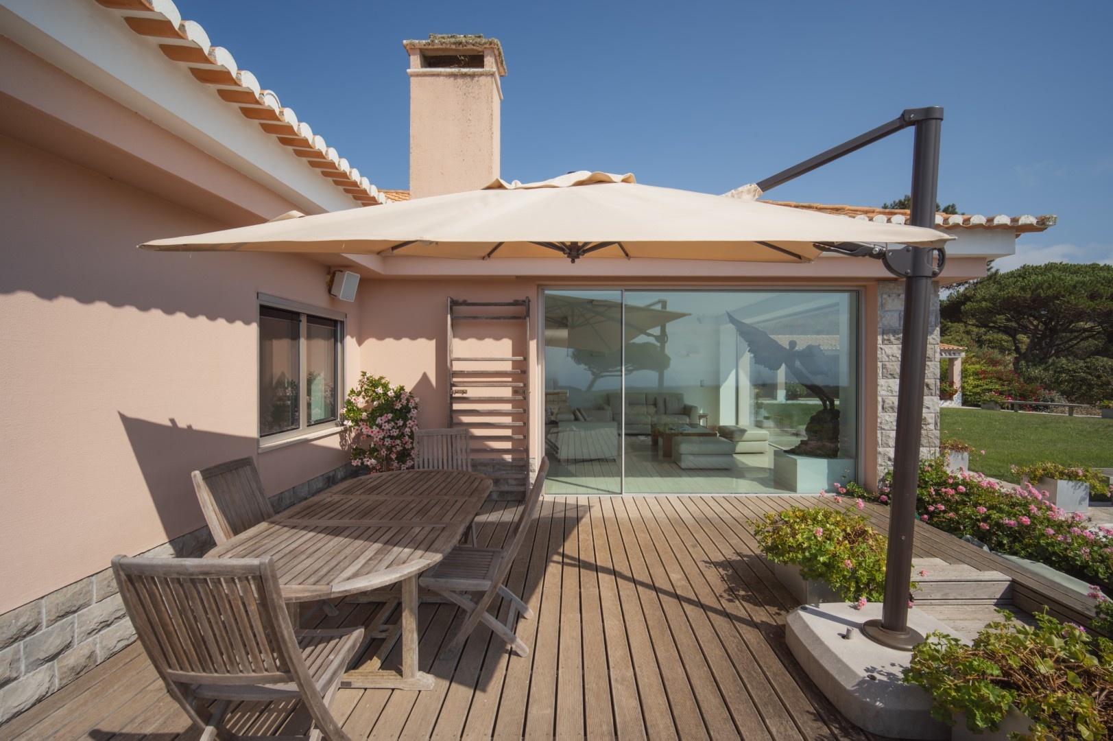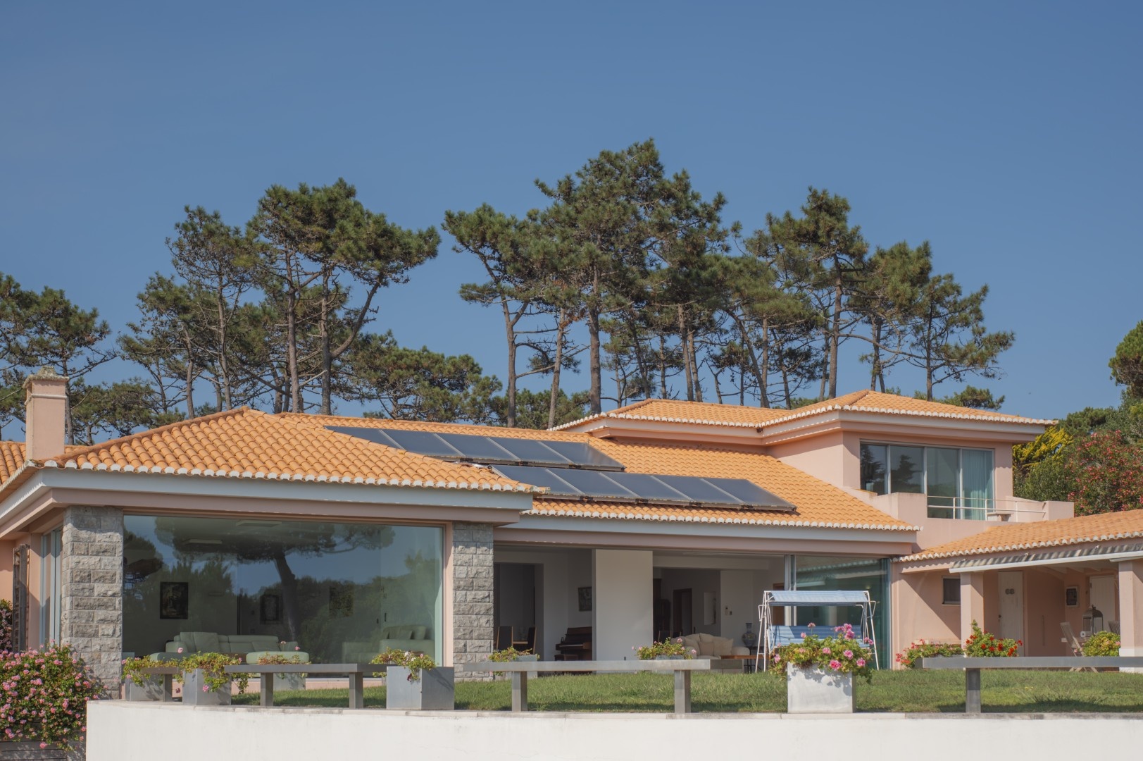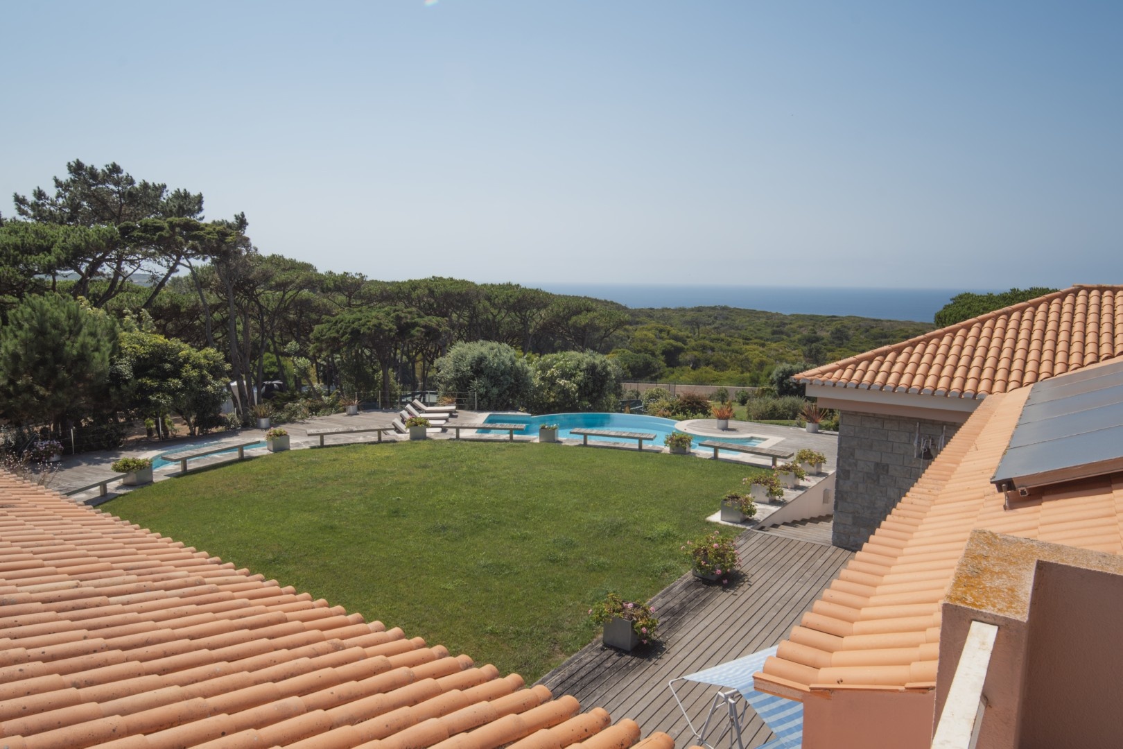 Additional features include a wine cellar, carport for four vehicles, tennis court, landscaped gardens with orchards and vegetable plots, a greenhouse, water wells and solar panels. The property is just a short walk from Praia Grande beach.
