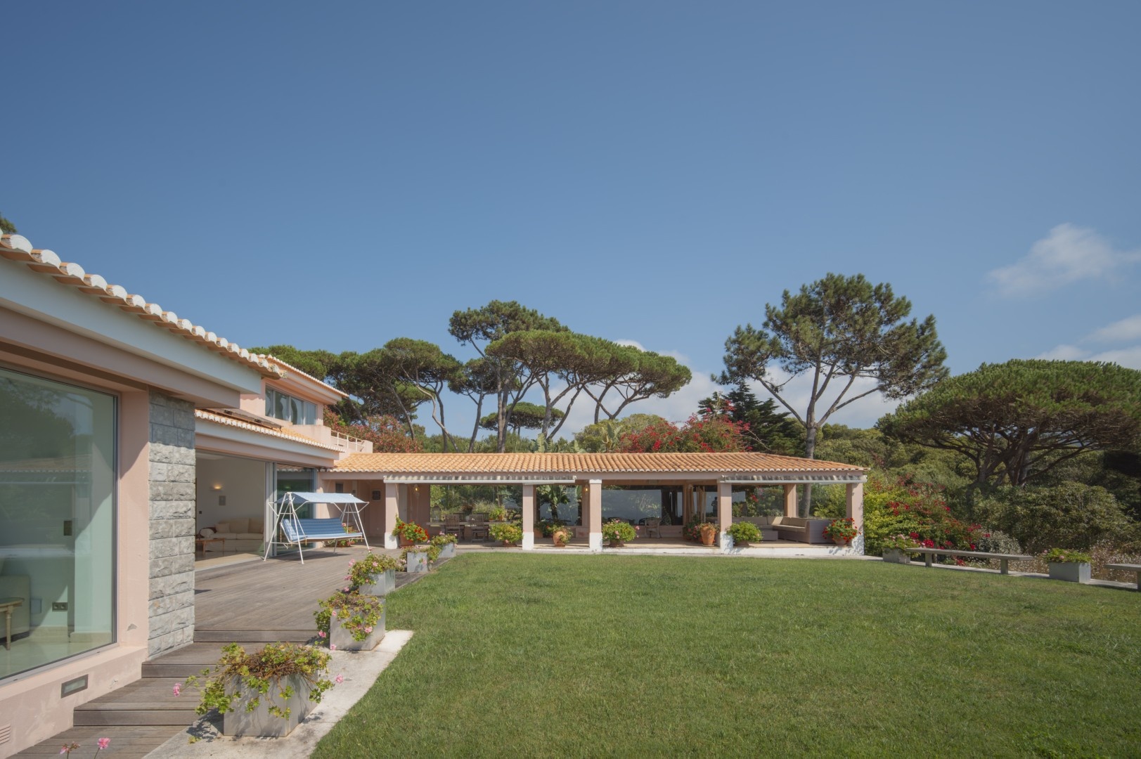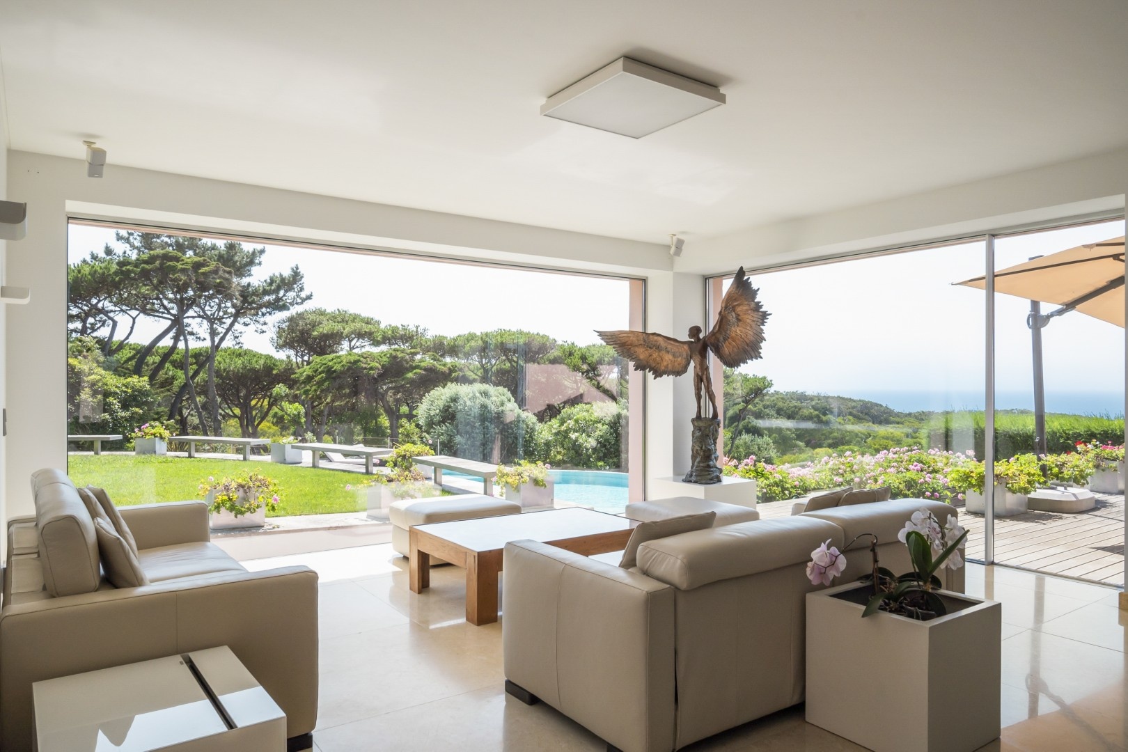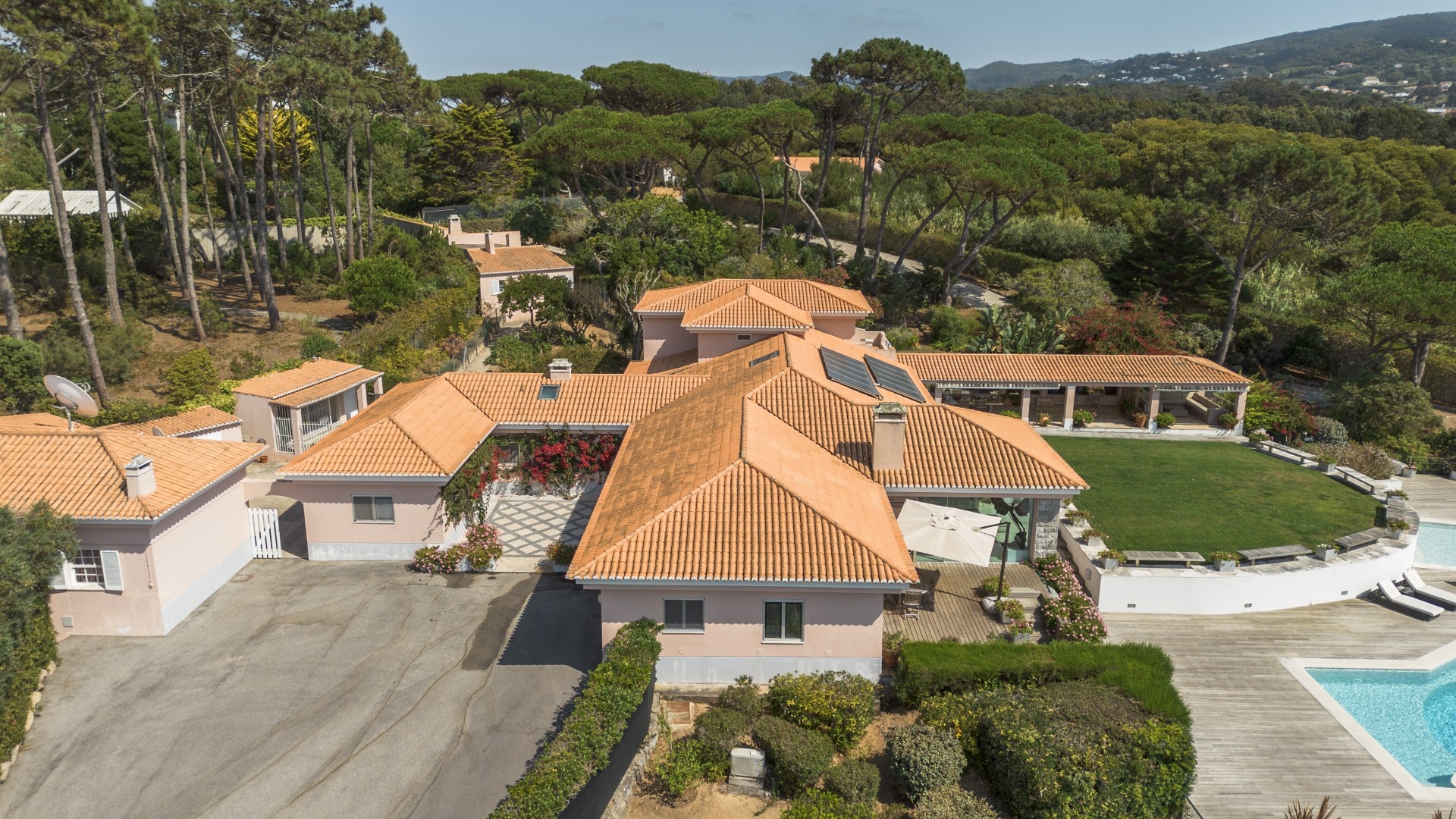 The Main Villa (600 m²): A refined two-level home with four en-suite bedrooms, grand living and dining spaces, a designer kitchen with premium appliances, extensive terraces, and both heated saltwater and freshwater swimming pools. Every detail is designed for comfort, from marble floors with underfloor heating to a Bose sound system and breathtaking views of the Atlantic and Cabo da Roca.