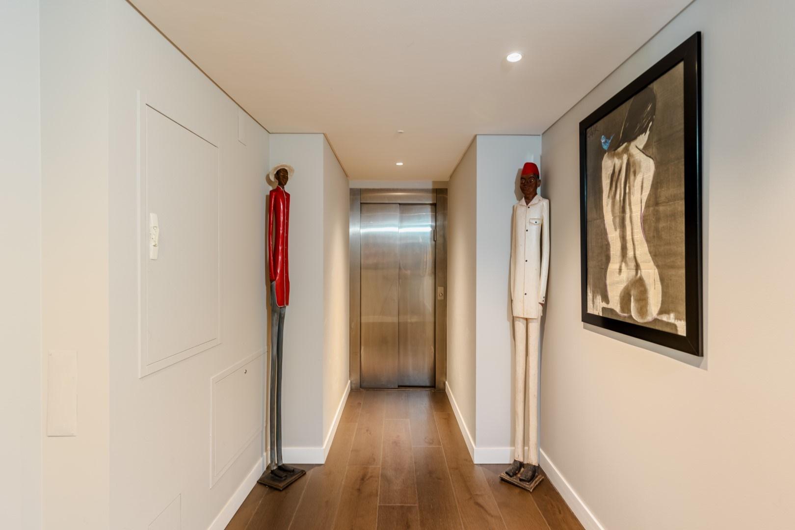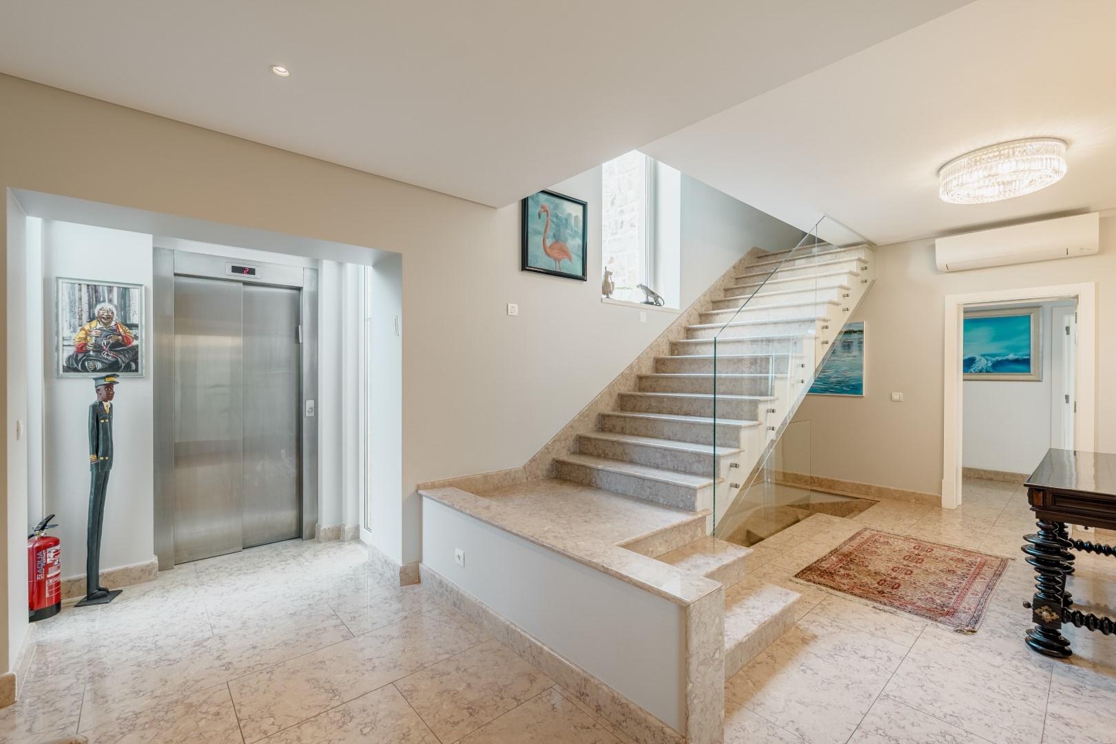 For outdoor living and entertaining, the property boasts a heated saltwater pool with a Jacuzzi, a first-class barbecue, and an outdoor kitchen, perfect for hosting guests. A second terrace and bar area in front of the pool enhance the entertainment options, while the lush Estoril landscape provides a stunning backdrop. The villa is designed for ultimate convenience, with an elevator connecting three of its four floors, and several storage rooms offering ample space for organization.