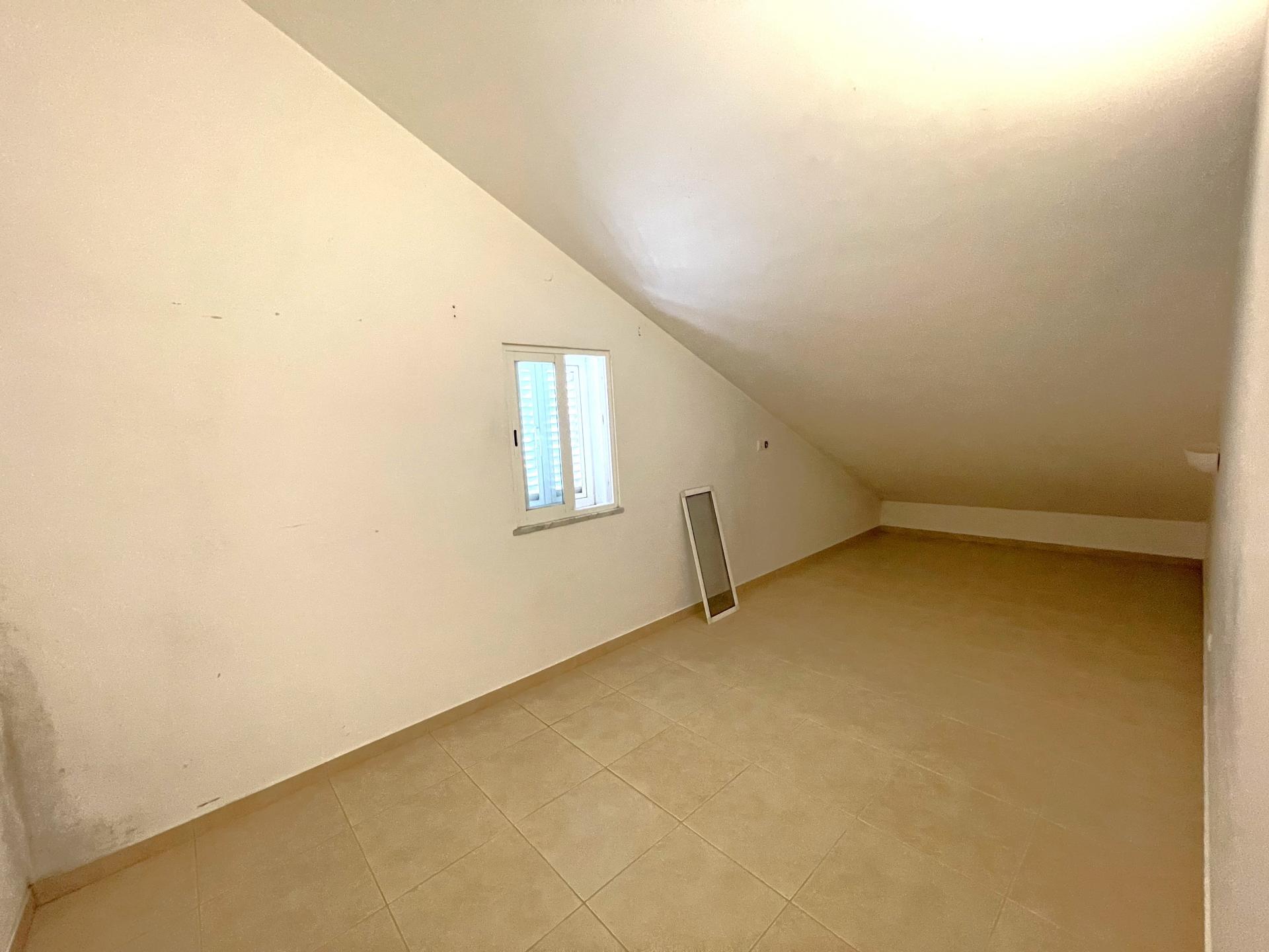 The house has an open-plan kitchen, living room with fireplace, two bedrooms, and a bathroom on the ground floor. The attic has two bedrooms and a bathroom.