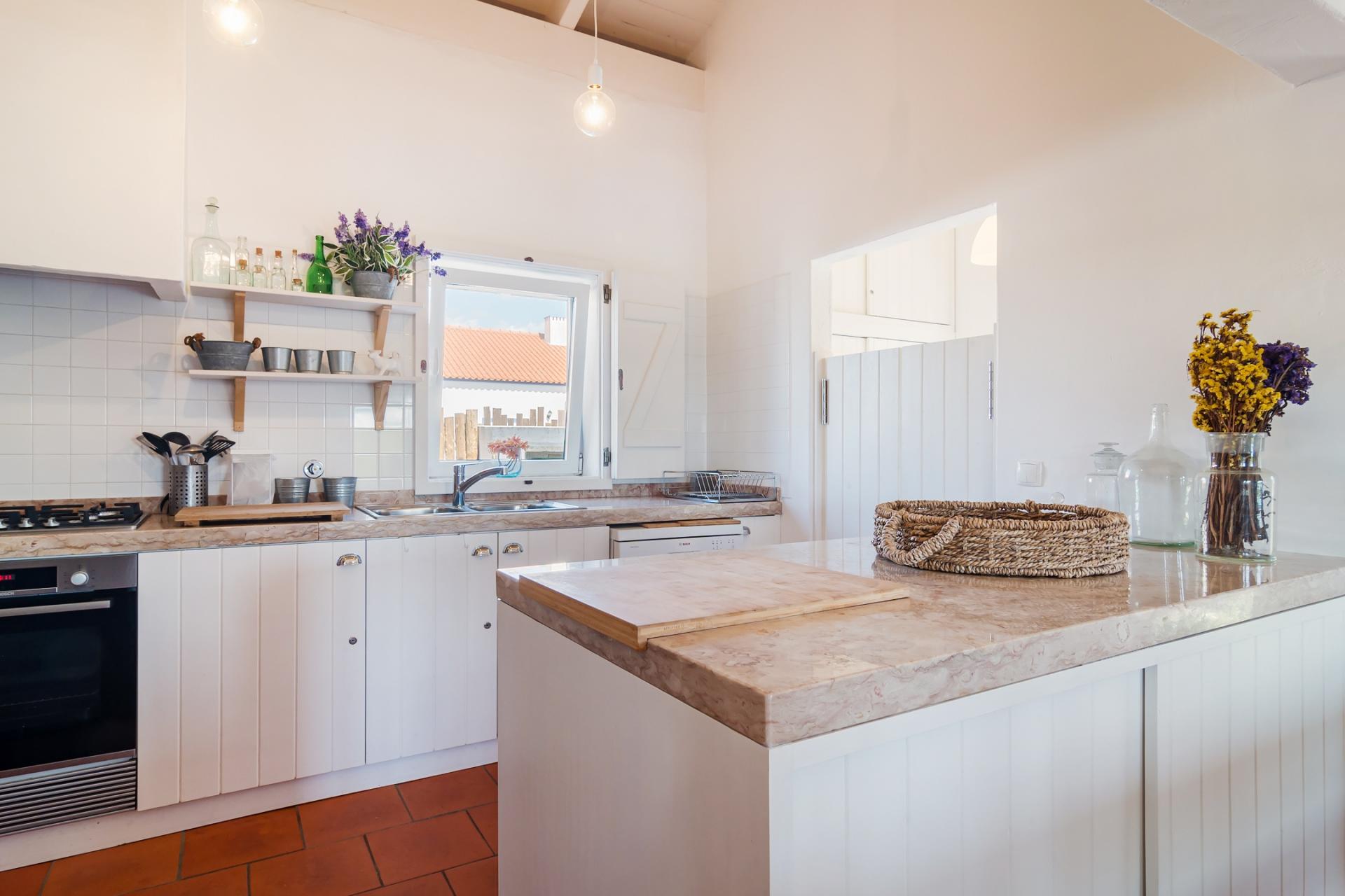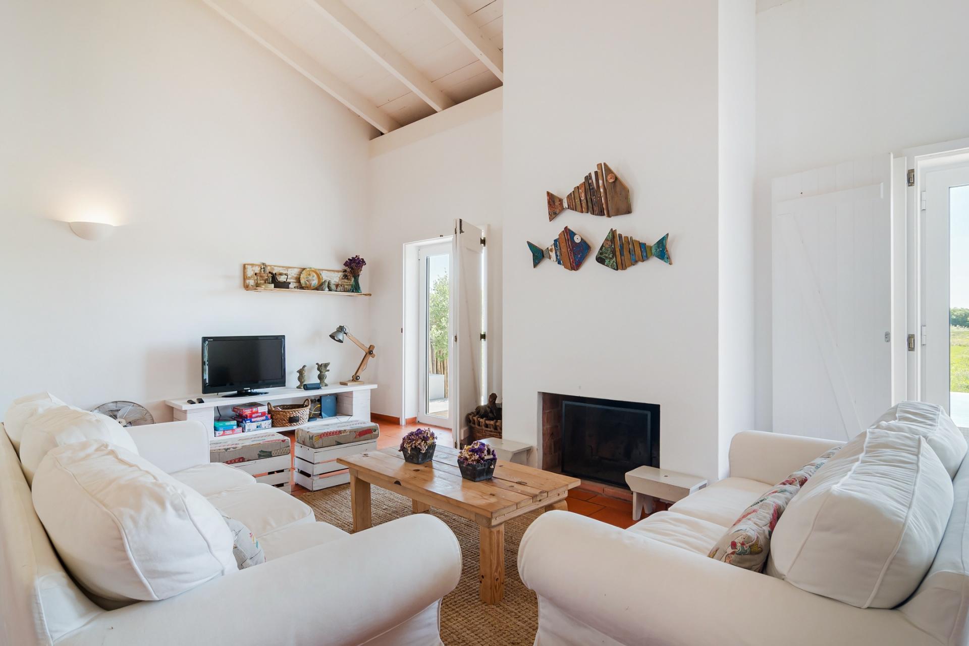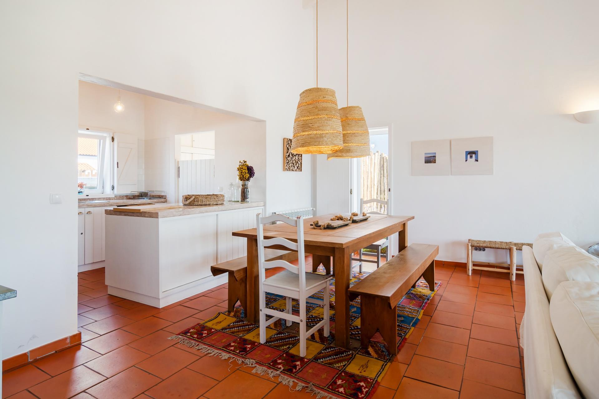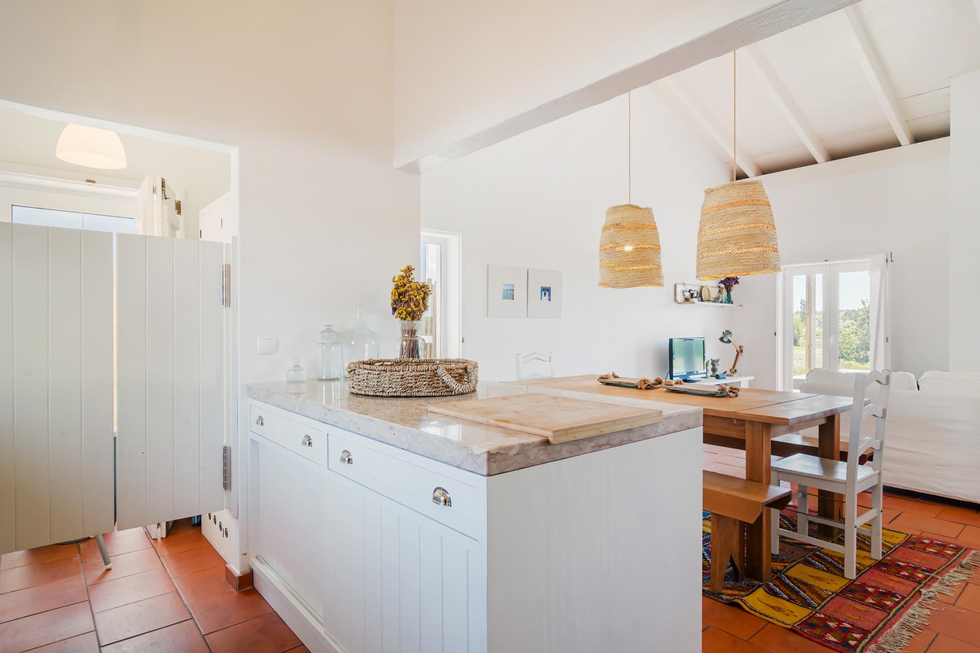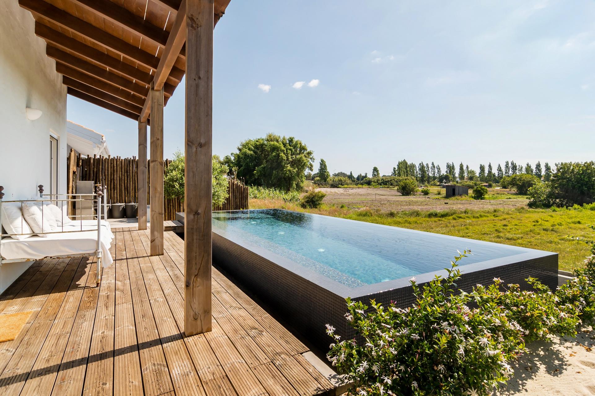 With wonderful views over the wild countryside, this villa is spread over a single floor. It has an open-concept kitchen with dining room and living room with fireplace, four bedrooms and two bathrooms. From the living room we have access to the charming and exclusive outdoor space comprising an infinity pool with views over the fields and the Serra da Arrábida, a leisure area with white sand sun loungers and a dining area with a barbecue.