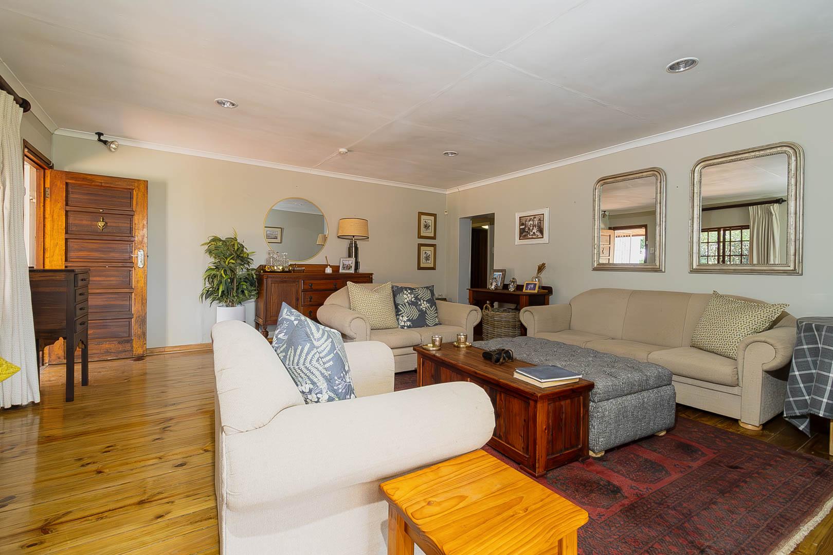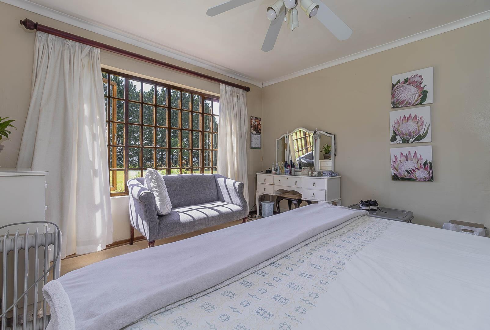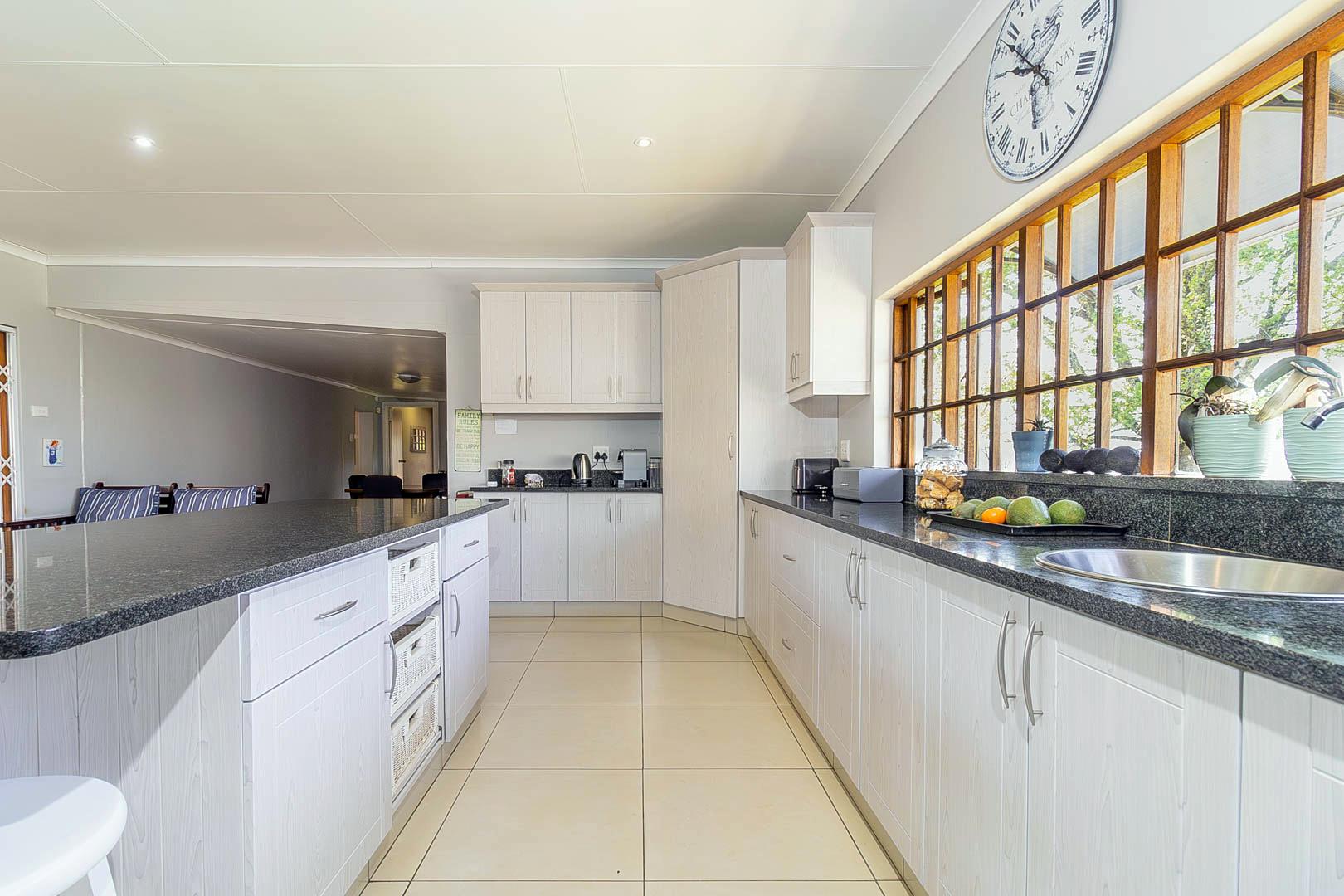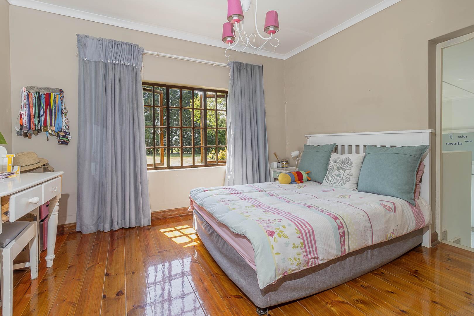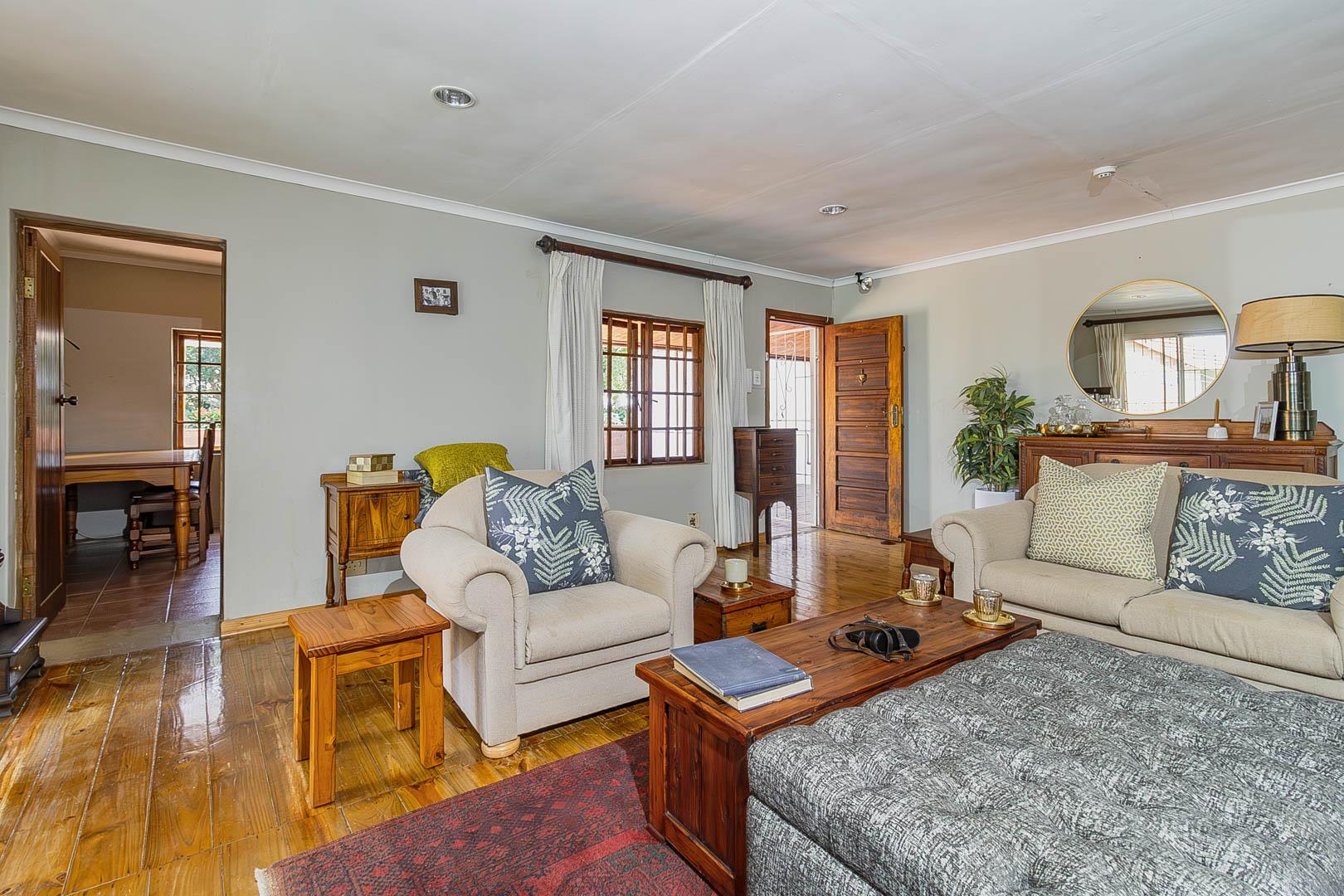 4 bedrooms; 3 bathrooms (2 ensuite); TV lounge; Dining; room; Modern kitchen; Scullery; Ironing room; Outside washroom; Generator connection with a manual switchover; Swimming pool; 1-bedroom cottage with an ensuite bathroom and open-plan lounge and kitchen.