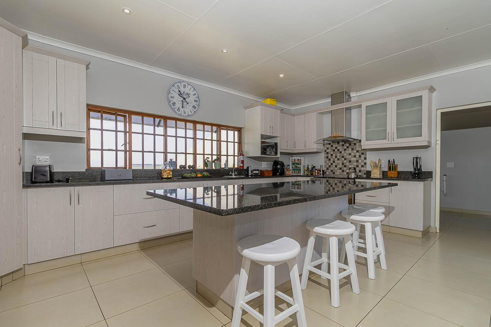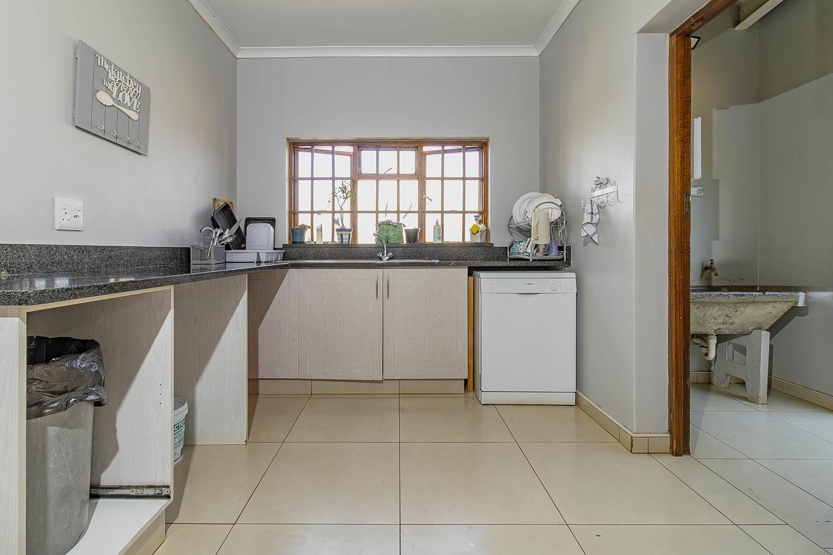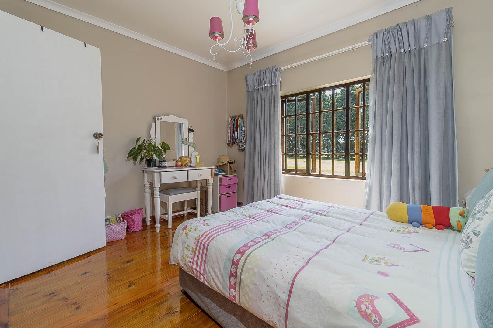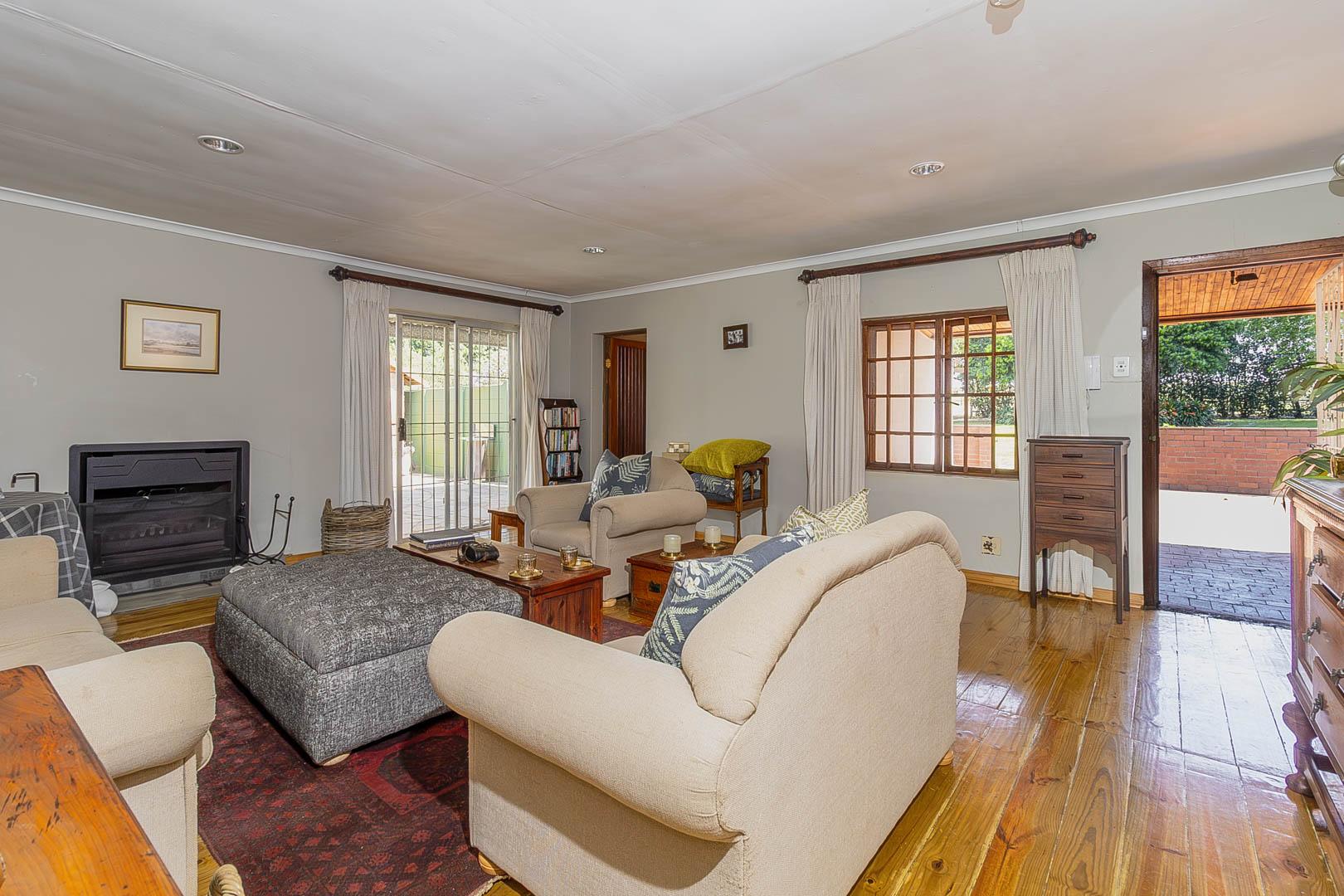 4 bedrooms; 3 bathrooms (2 ensuite); TV lounge; Dining; room; Modern kitchen; Scullery; Ironing room; Outside washroom; Generator connection with a manual switchover; Swimming pool; 1-bedroom cottage with an ensuite bathroom and open-plan lounge and kitchen.