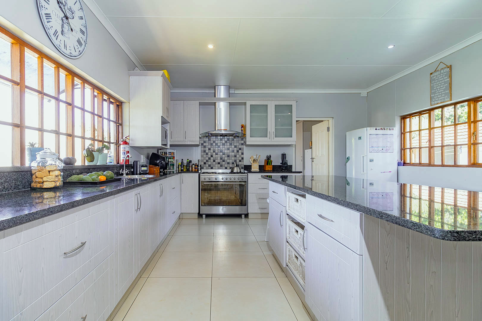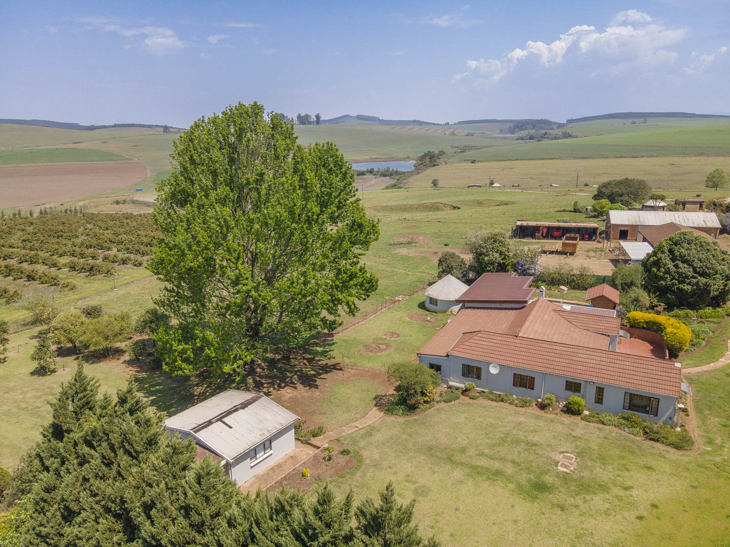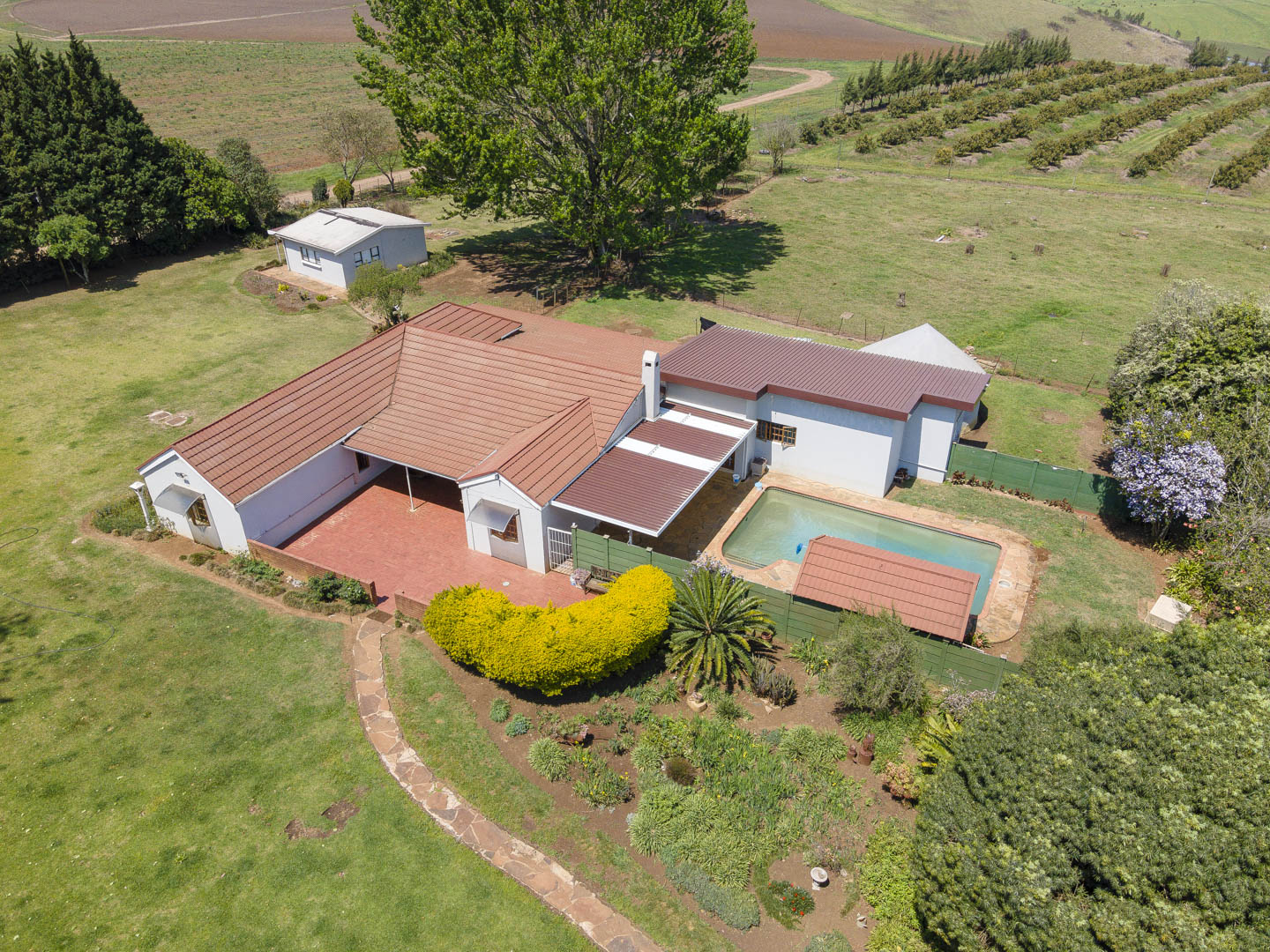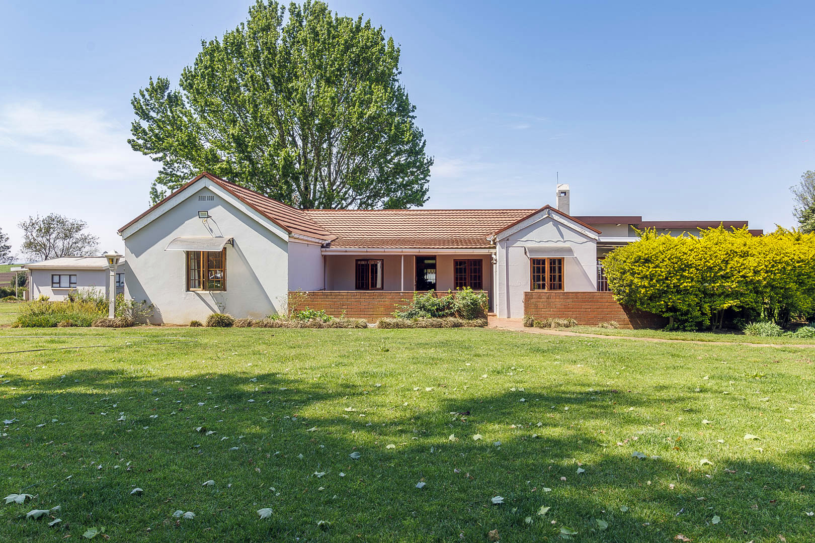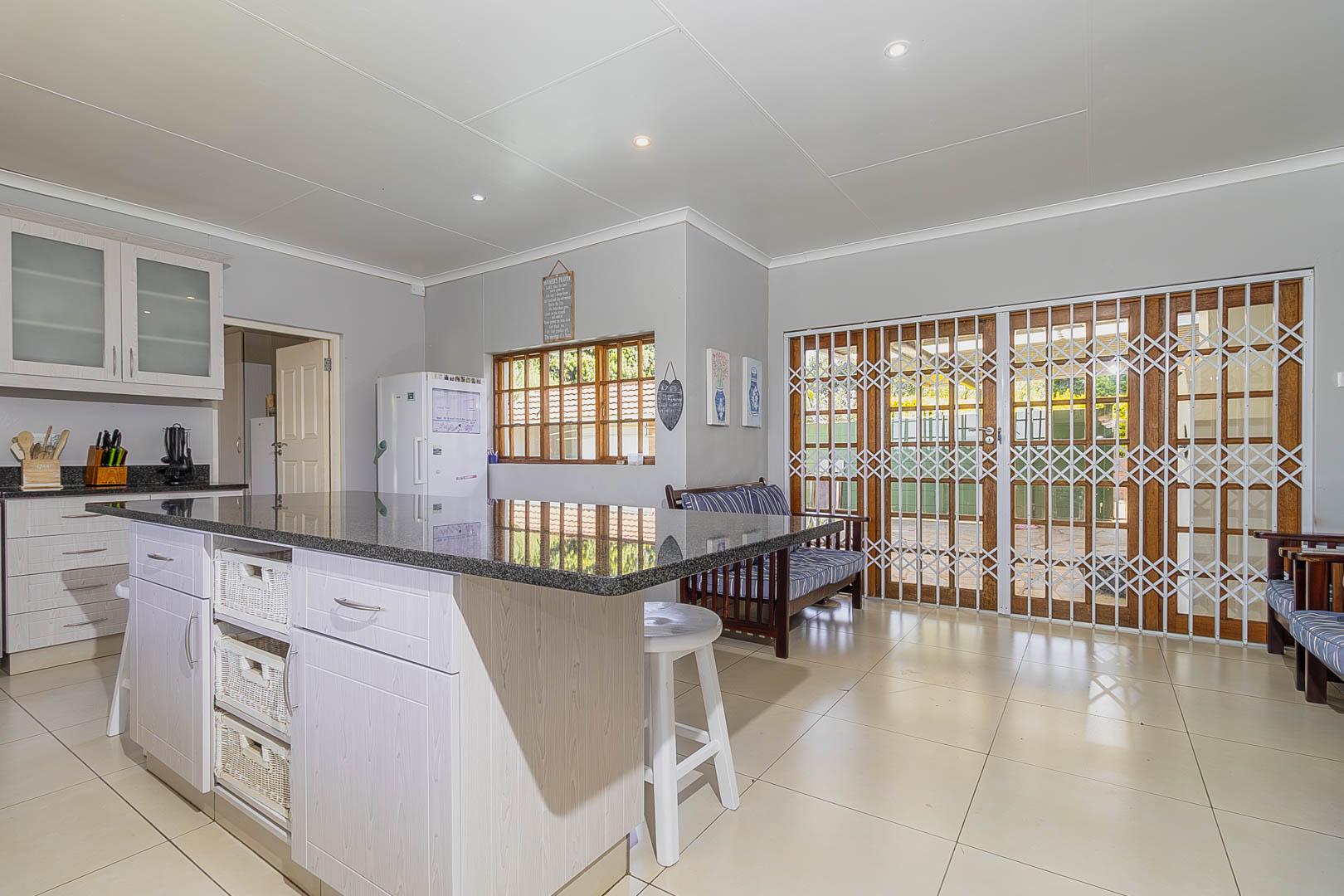 4 bedrooms; 3 bathrooms (2 ensuite); TV lounge; Dining; room; Modern kitchen; Scullery; Ironing room; Outside washroom; Generator connection with a manual switchover; Swimming pool; 1-bedroom cottage with an ensuite bathroom and open-plan lounge and kitchen.