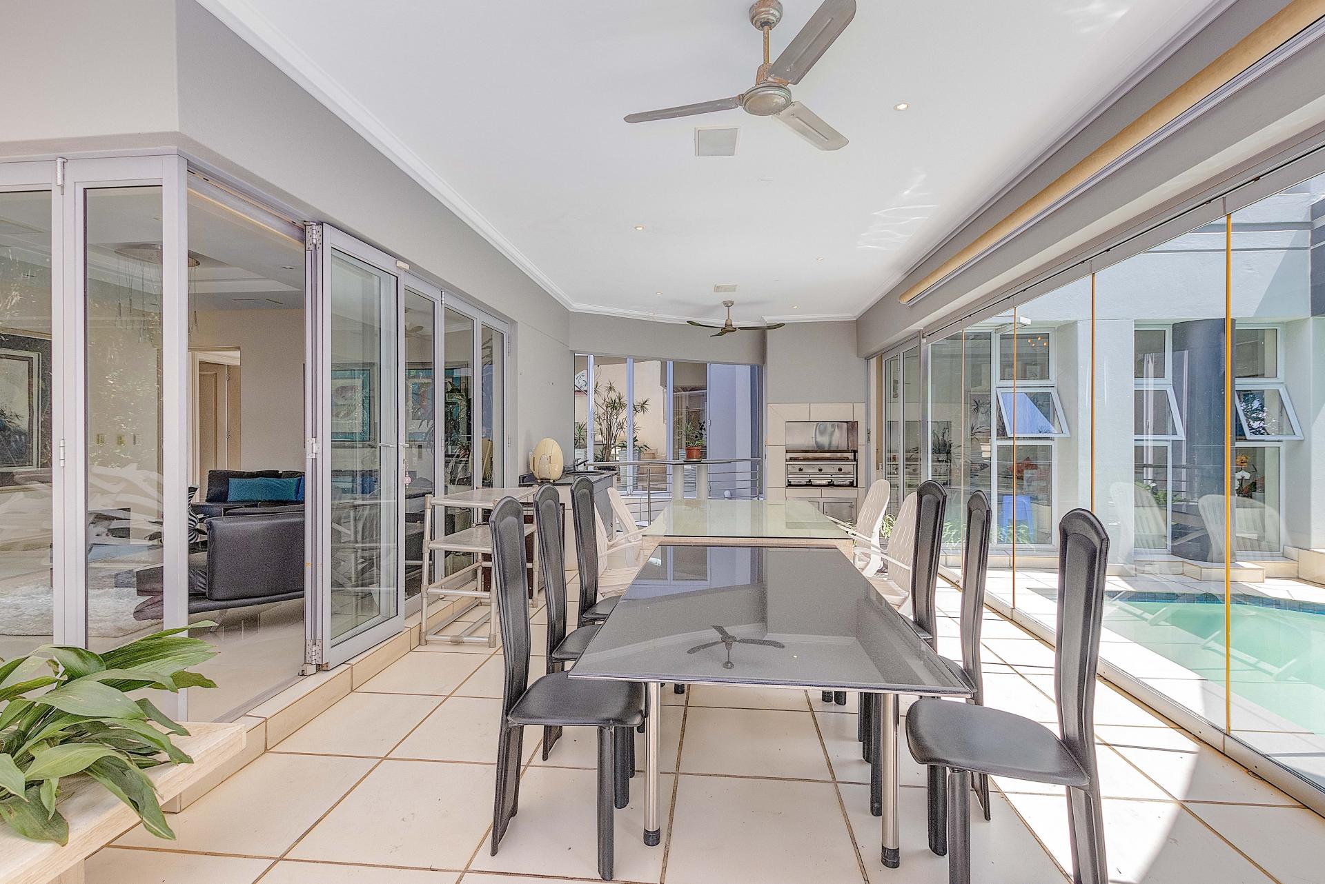 The open-plan living space is a showstopper—featuring a sophisticated lounge and dining area that flow effortlessly into a sleek gourmet kitchen, complete with top-of-the-line appliances, bespoke cabinetry, and a spacious scullery. Large aluminium stacking doors open onto a covered patio with a built-in braai, overlooking a glistening swimming pool—your perfect setting for weekend gatherings or relaxed alfresco dinners.