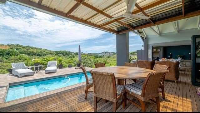 Enjoy a stylish open-plan kitchen with scullery, elegant dining and lounge areas, and an outdoor office, ideal for remote work. Entertain with ease around the ,sparkling pool, expansive patio, and manicured garden oasis, all while soaking up serene valley views into a lush coastal forest.