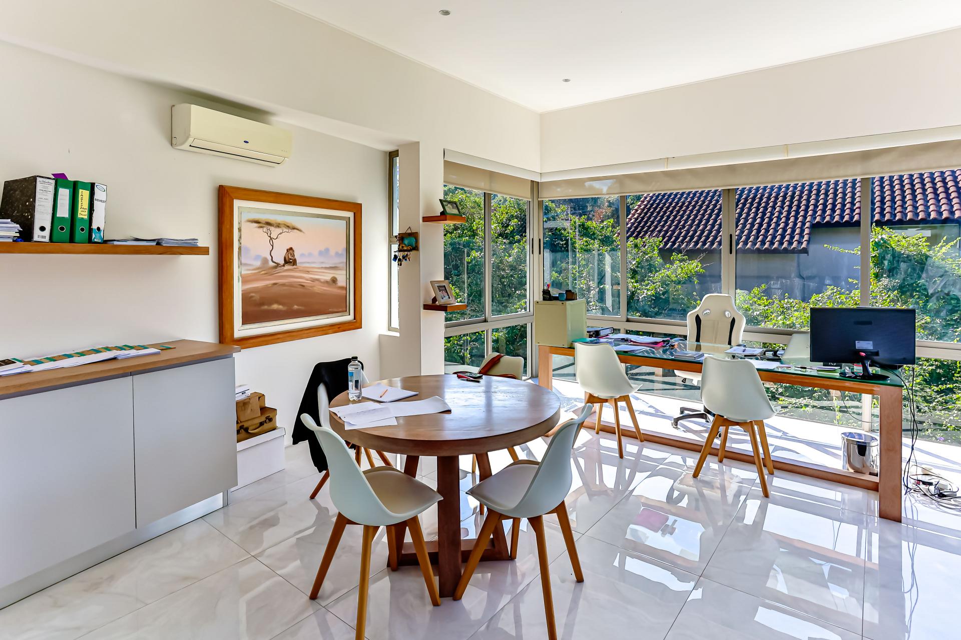 Step inside and be greeted by an impressive stone-clad entry, leading to a glass-enclosed office that perfectly blends productivity with inspiration.