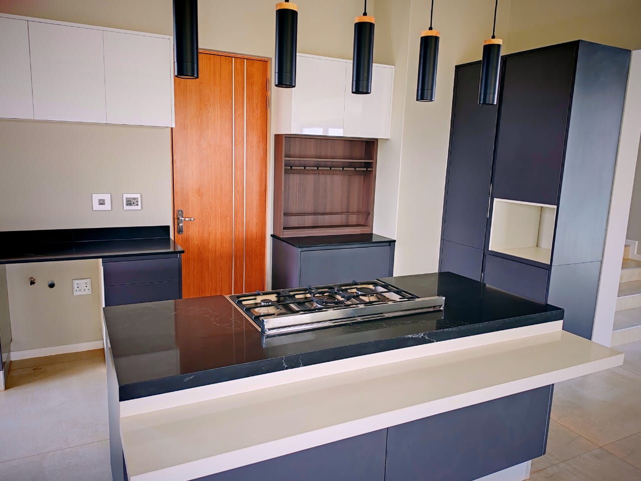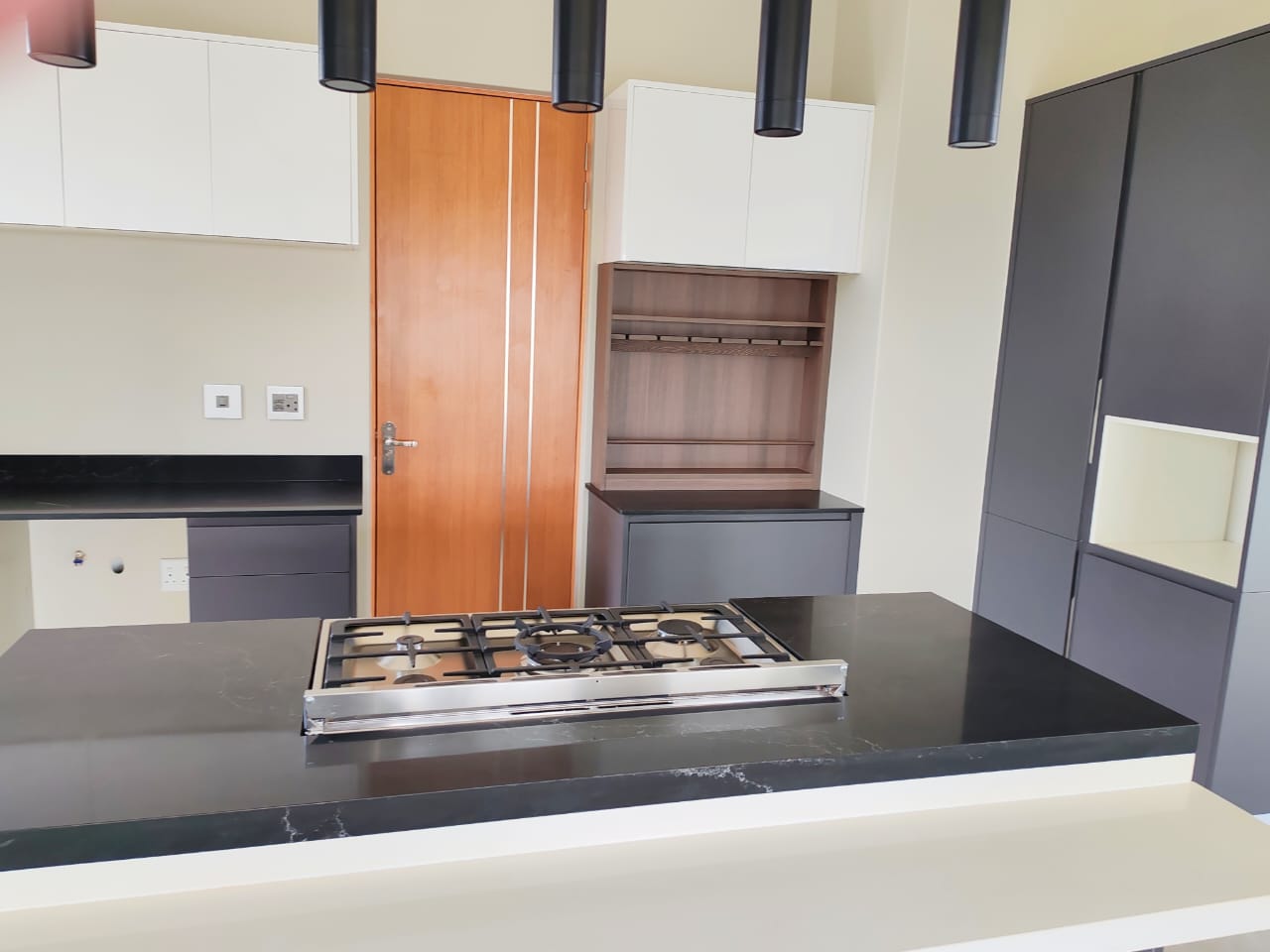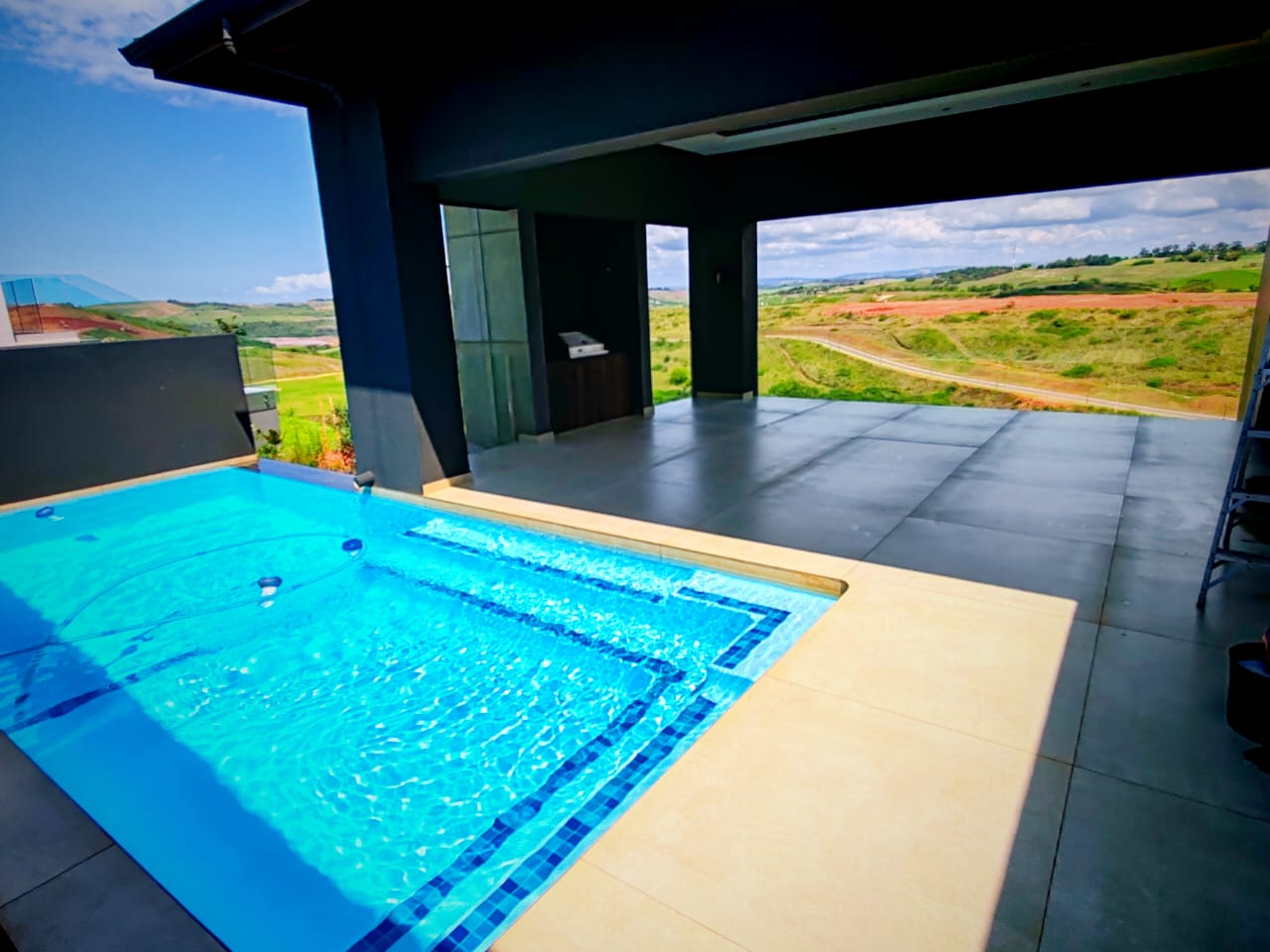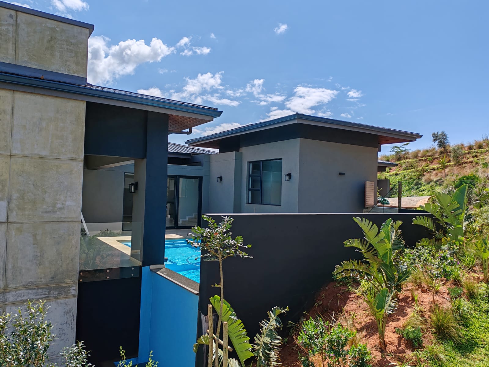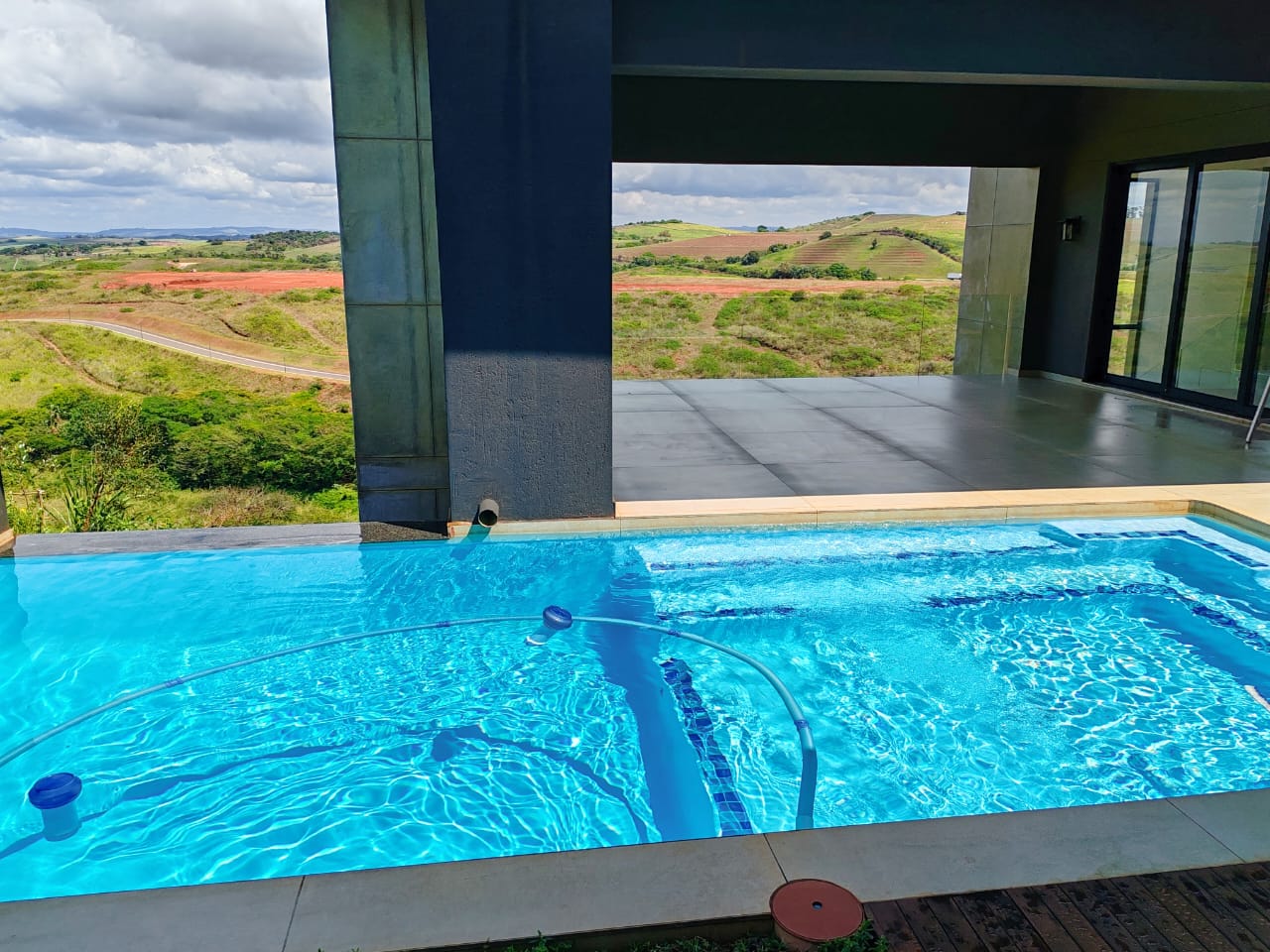 Built with very high end finishes throughout, the designer open plan kitchen flows into a living and dining area that extends onto a spacious covered patio, deck and a protected swimming pool with a boma area-ideal for entertaining or unwinding in the tranquil surroundings. This level also features a guest bedroom with an en-suite bathroom, a separate guest toilet, a scullery and drying area.