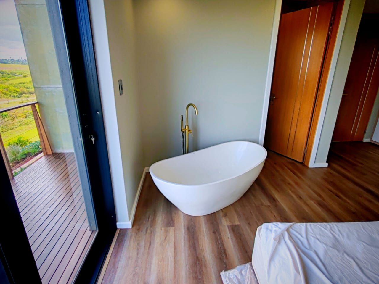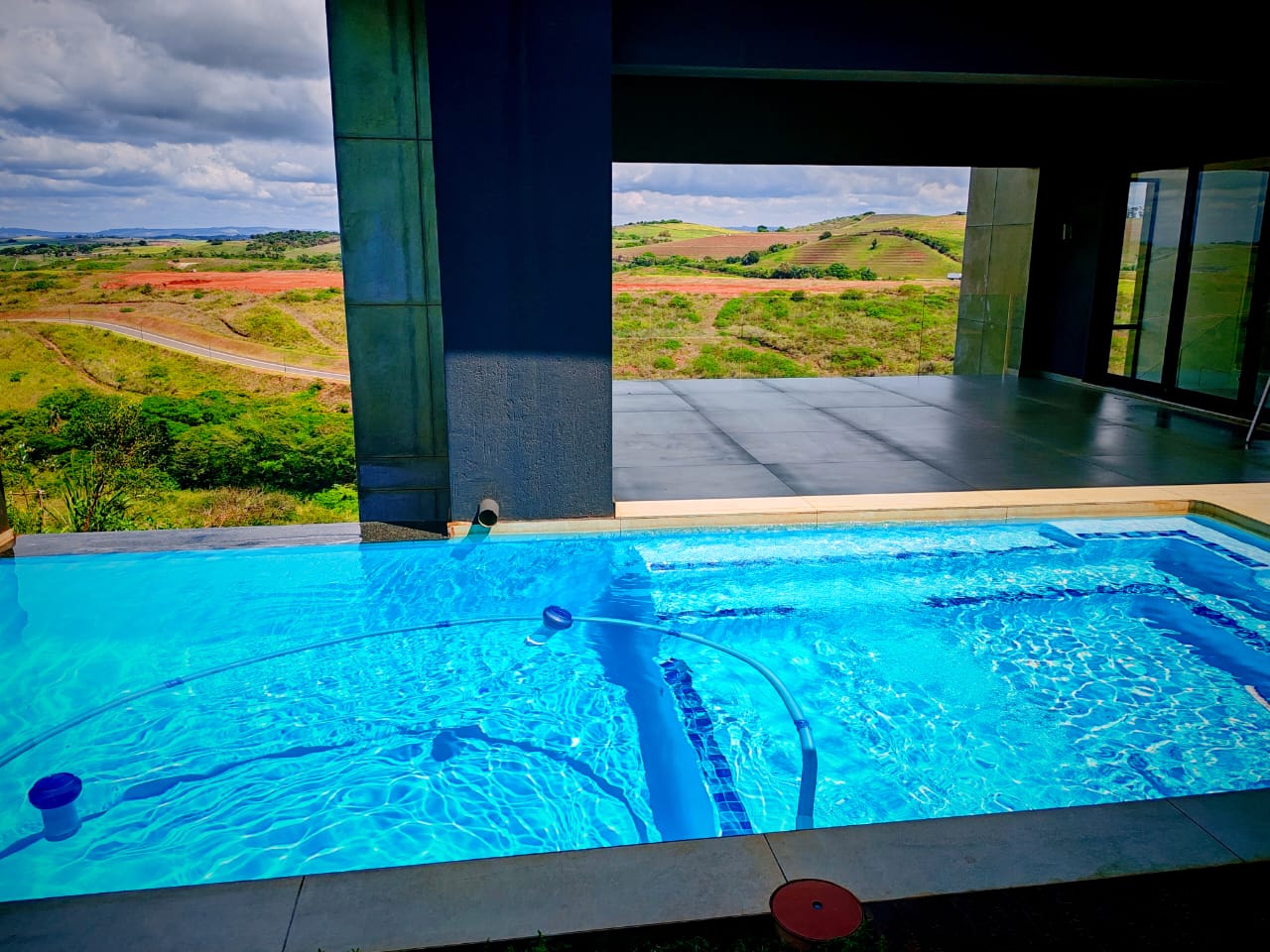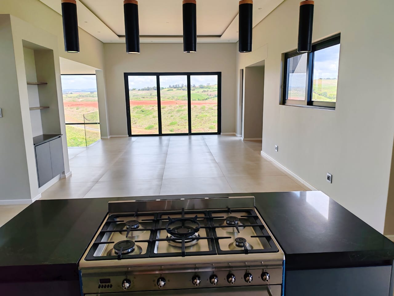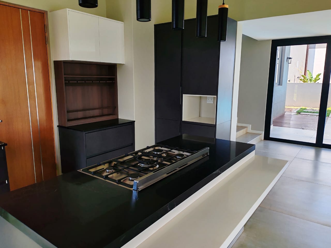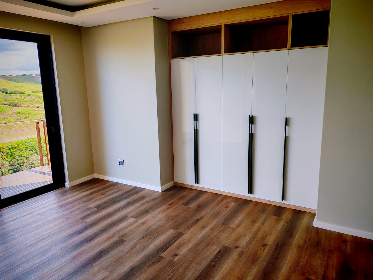 Built with very high end finishes throughout, the designer open plan kitchen flows into a living and dining area that extends onto a spacious covered patio, deck and a protected swimming pool with a boma area-ideal for entertaining or unwinding in the tranquil surroundings. This level also features a guest bedroom with an en-suite bathroom, a separate guest toilet, a scullery and drying area.