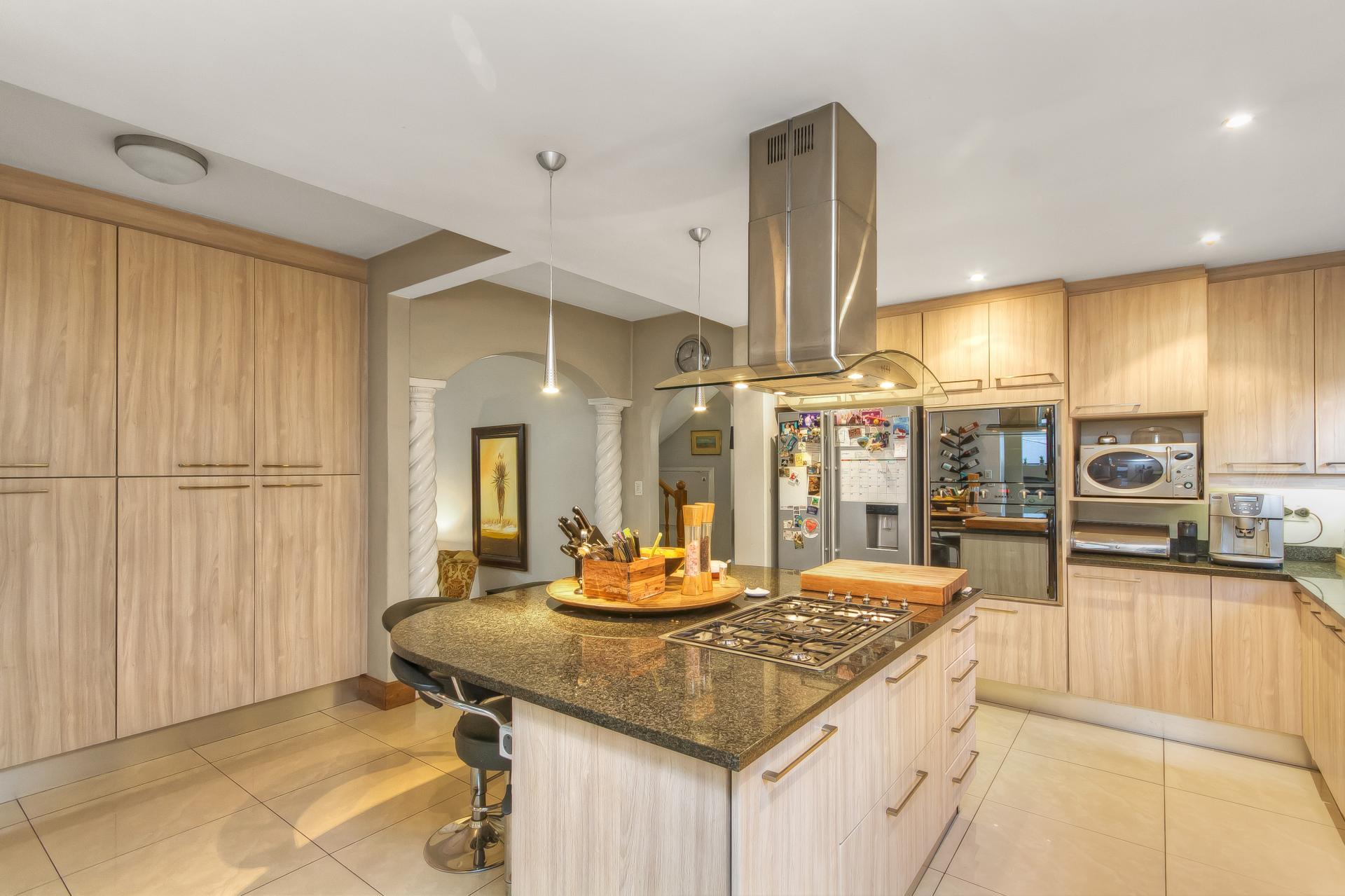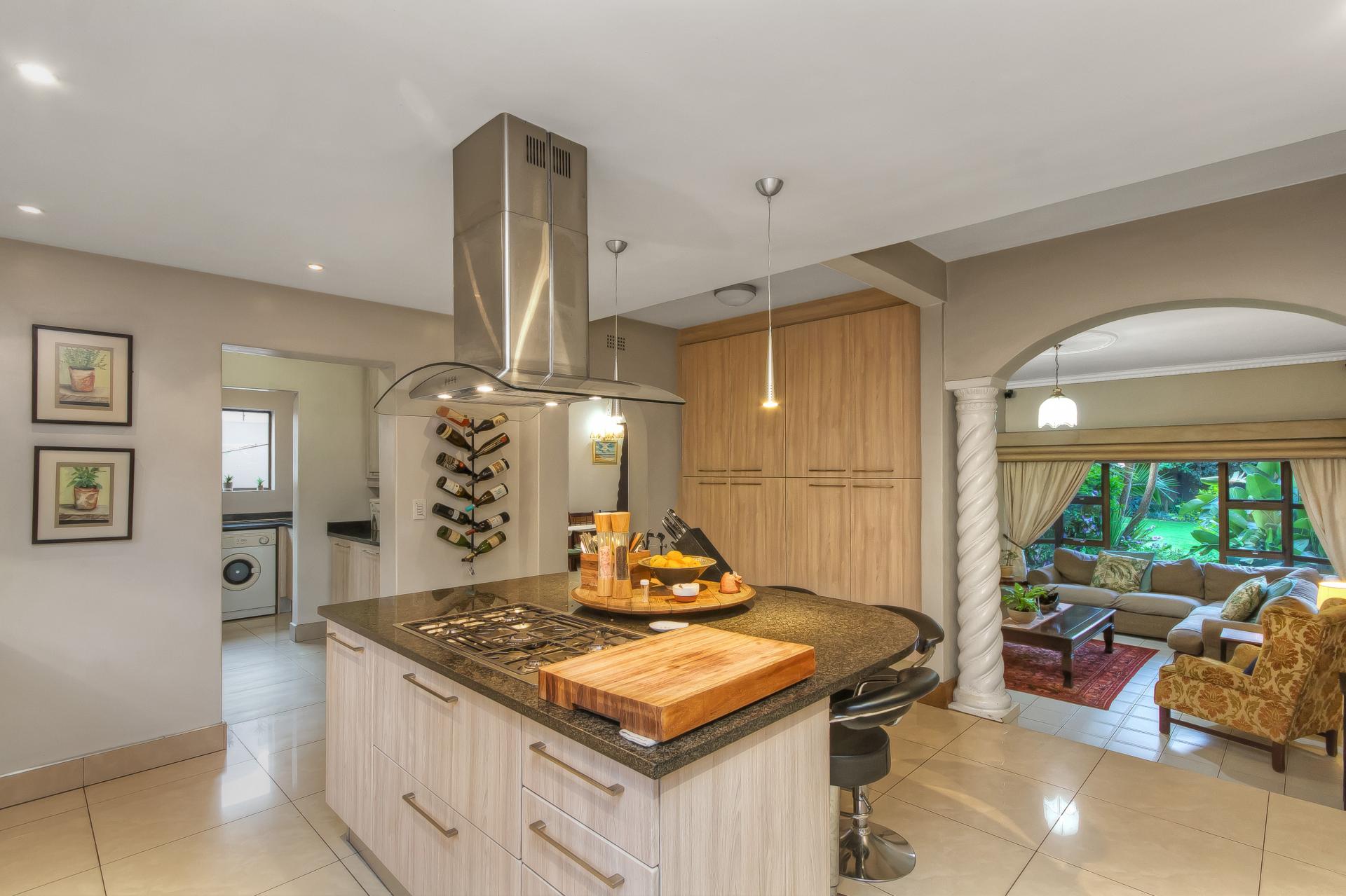 ​Step through the double-volume entrance hall and feel the sense of space and light. To your left, a contemporary open-plan kitchen awaits, ready to be the heart of your home. It’s equipped with all the bells and whistles for a professional chef or a bustling family. A generous center island with a gas hob makes cooking a social affair, while a separate scullery and laundry room keep the mess out of sight. The kitchen flows seamlessly into the dining room and a large, cozy living room, complete with a fireplace and views of the verdant garden.