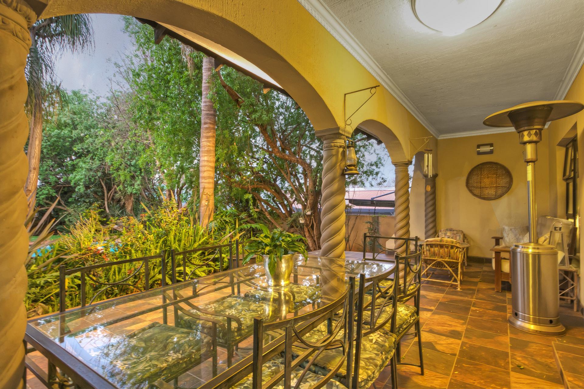 ​Outside, the garden is a true highlight. It's a green and verdant oasis with established trees and an expansive lawn—perfect for children's afternoon games and play. A large swimming pool connects the patio and garden, inviting you to cool down on hot summer days. The property also features a borehole, ensuring the garden stays green and the pool remains full without the high costs.