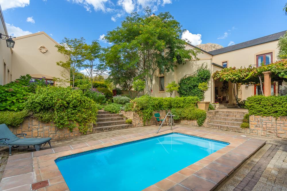 On Exclusive Sole Mandate. Set within a quiet residential corner of Franschhoek, this charming French Provencal-style home showcases an exquisite garden and gorgeous views back towards the Franschhoek mountains.