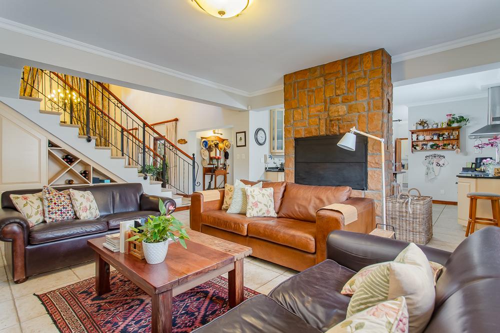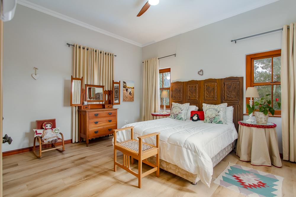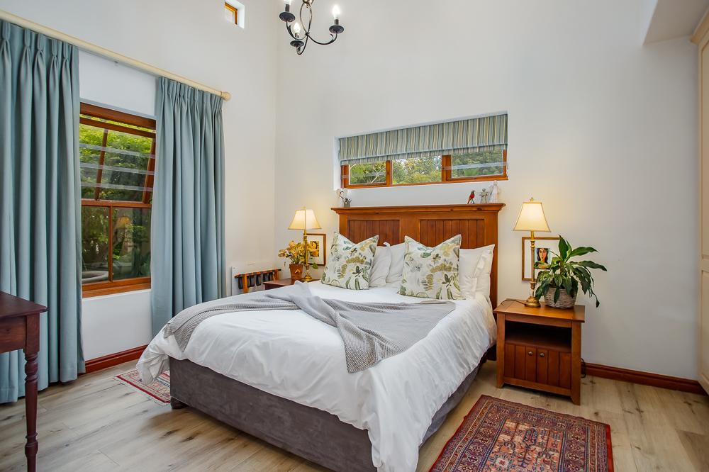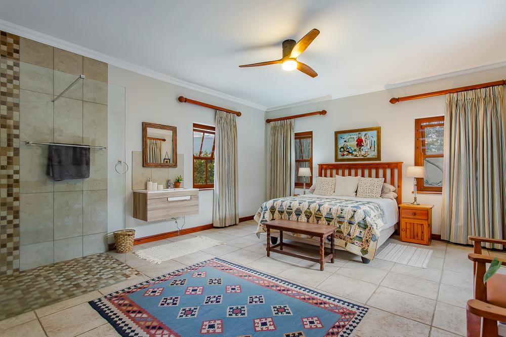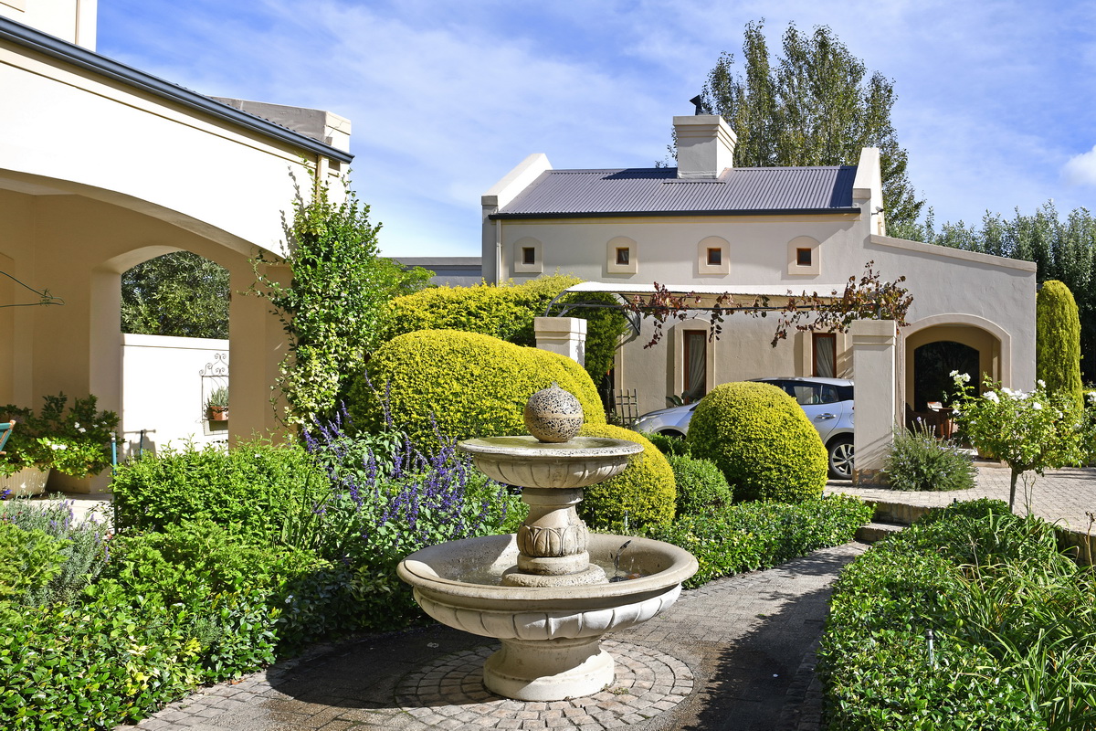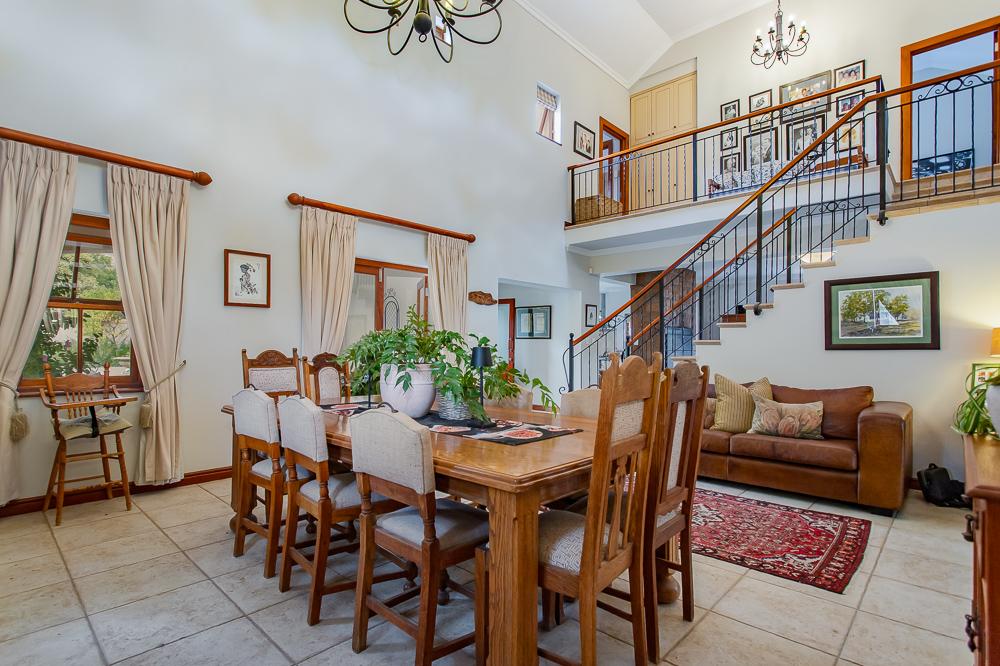 The main residence invites you in through a grand entrance featuring a sweeping central staircase with double-volume living area to one side and an easy flow through to the dining area and well-appointed country kitchen (with separate scullery) and a double-sided fireplace/inside braai. A second family lounge on the ground floor has been adapted as a 4th bedroom with integrated shower and basin and an adjoining separate guest toilet. A spacious vine-covered terrace overlooks a lush, landscaped garden and leads down to a private swimming pool area. Upstairs is the luxurious master bedroom with en-suite bathroom and two further bedrooms sharing a family bathroom. The main house also includes a double garage, workshop, carport, a borehole with irrigation system and a 10kw solar system.