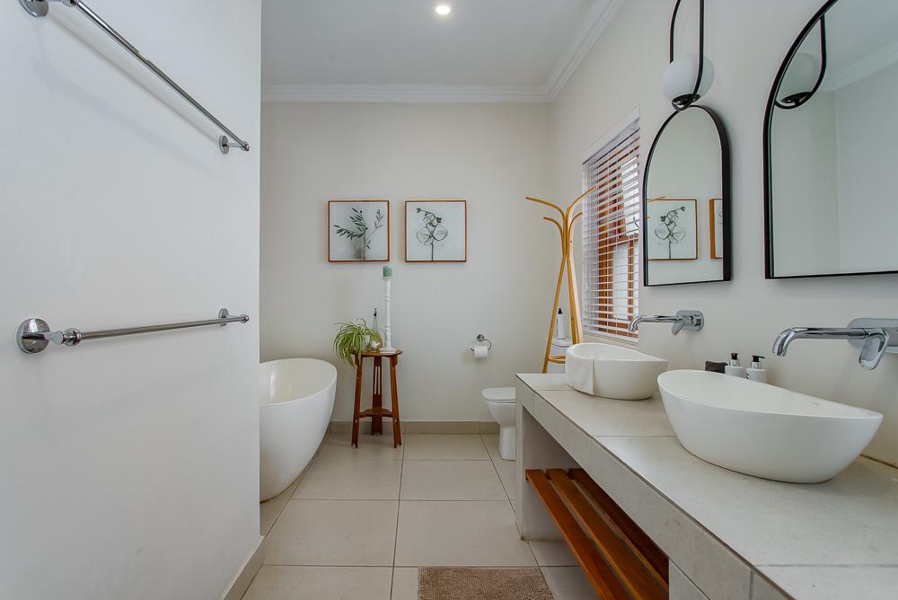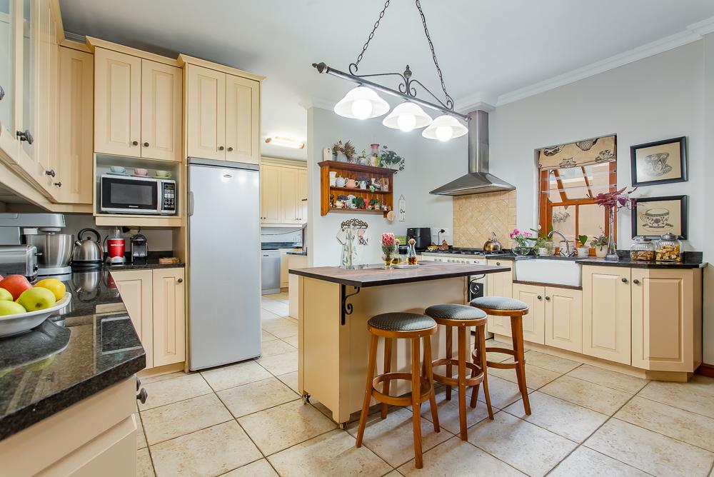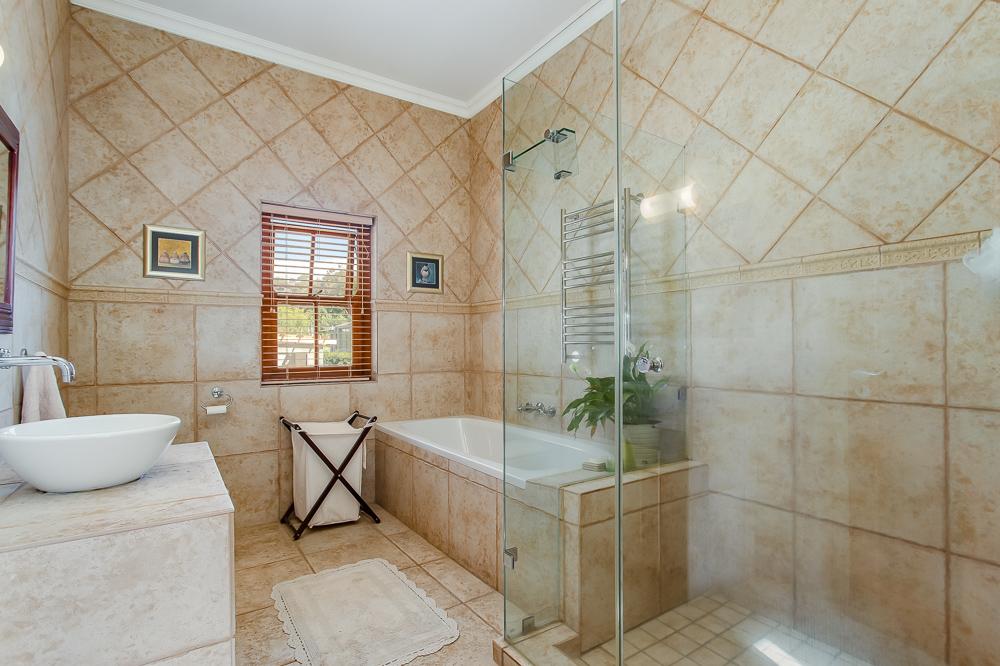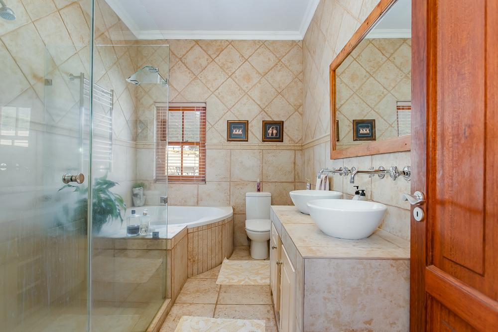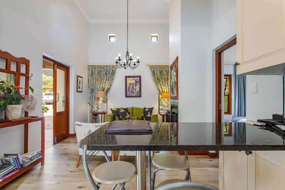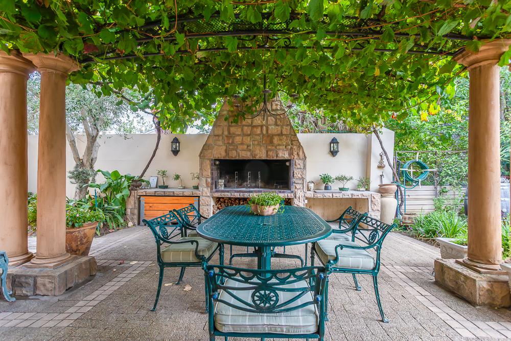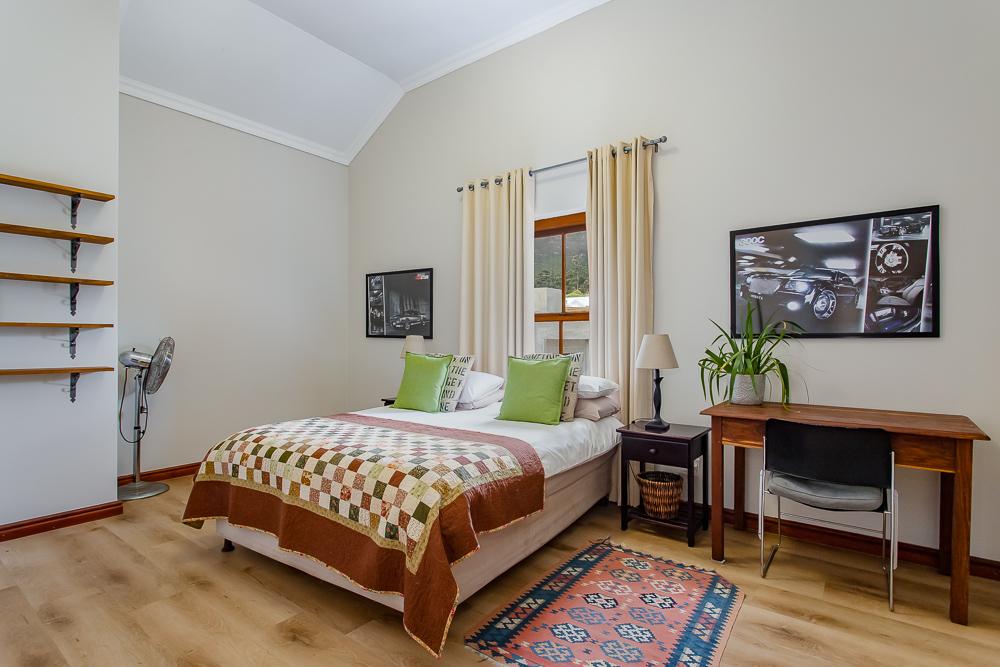 The main residence invites you in through a grand entrance featuring a sweeping central staircase with double-volume living area to one side and an easy flow through to the dining area and well-appointed country kitchen (with separate scullery) and a double-sided fireplace/inside braai. A second family lounge on the ground floor has been adapted as a 4th bedroom with integrated shower and basin and an adjoining separate guest toilet. A spacious vine-covered terrace overlooks a lush, landscaped garden and leads down to a private swimming pool area. Upstairs is the luxurious master bedroom with en-suite bathroom and two further bedrooms sharing a family bathroom. The main house also includes a double garage, workshop, carport, a borehole with irrigation system and a 10kw solar system.
