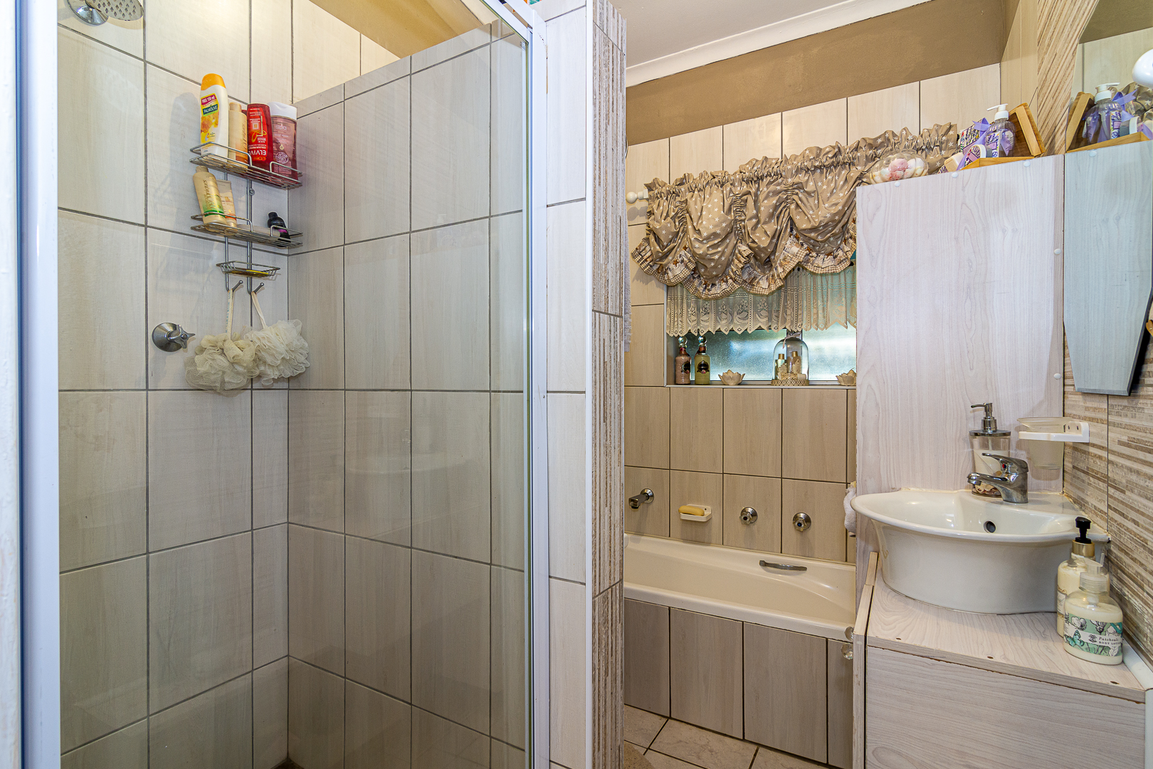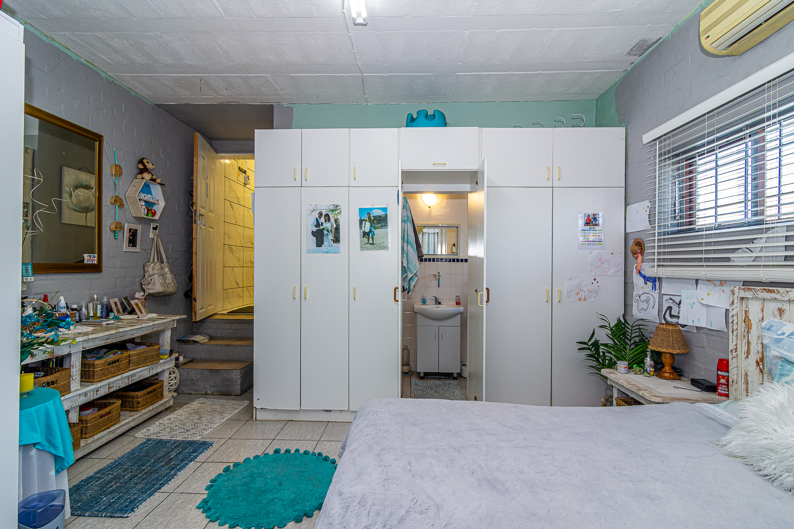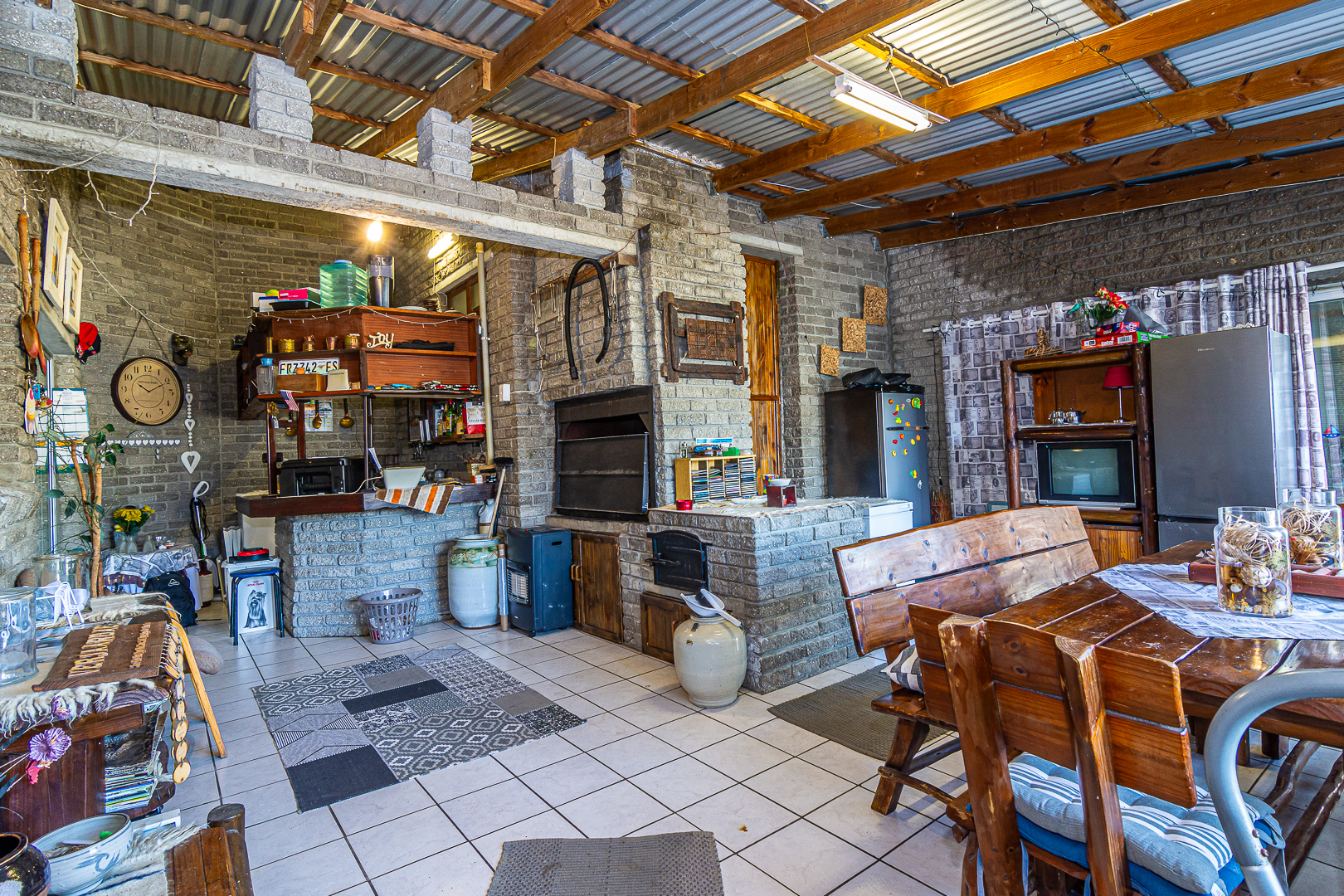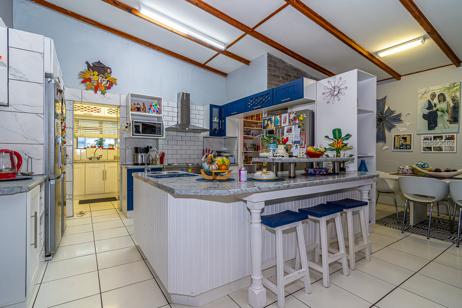 The main house consists of four bedrooms (two with en-suites), three bathrooms, an open plan kitchen/living/dining area, scullery, pantry, laundry, entertainment room with built-in braai as well as bar and an enclosed patio. Stairs lead to the upper level, consisting of a bachelor’s flat – spacious bedroom, light and bright, bathroom and kitchenette. There is a single garage, store room, two carports, JOJO tank and small kiddies pool/fish pond.