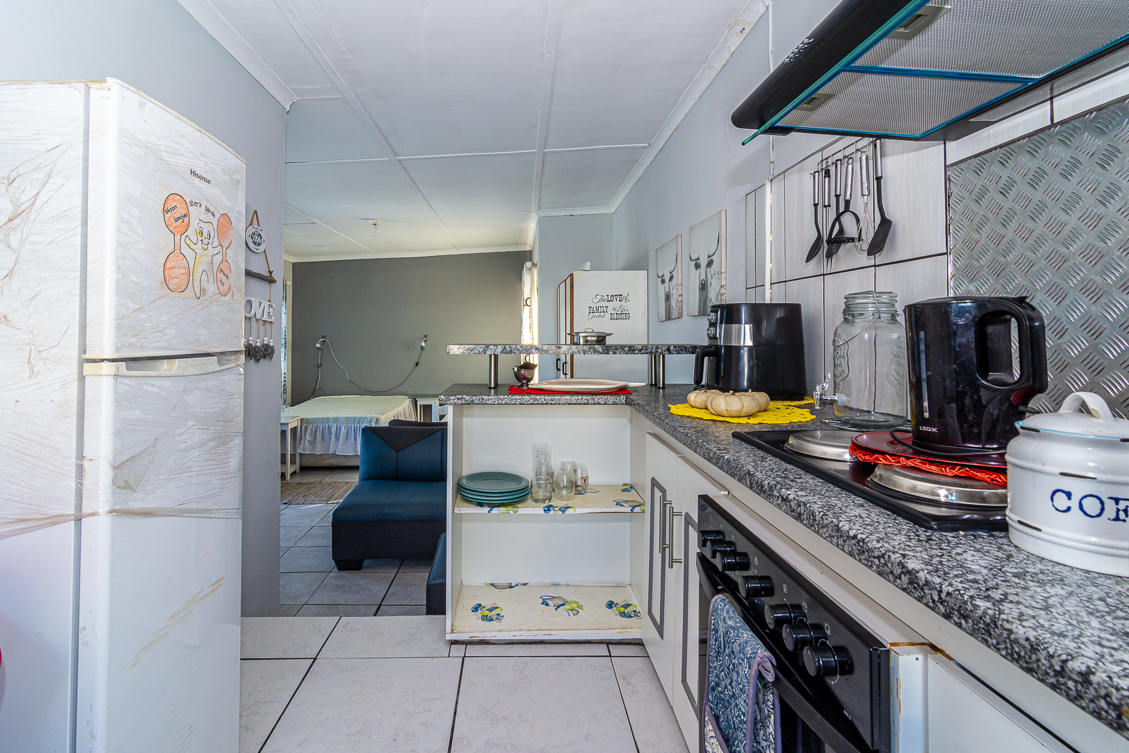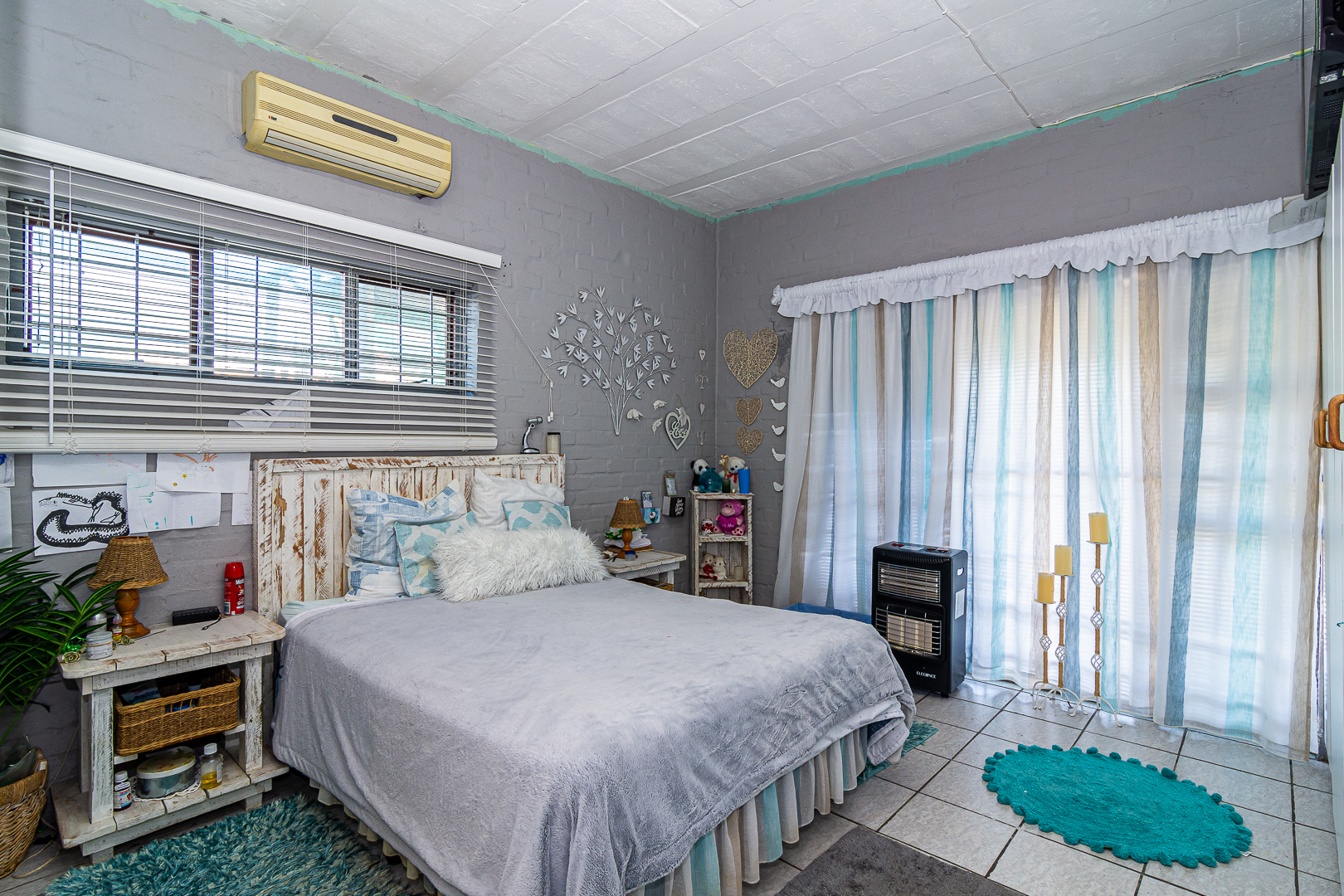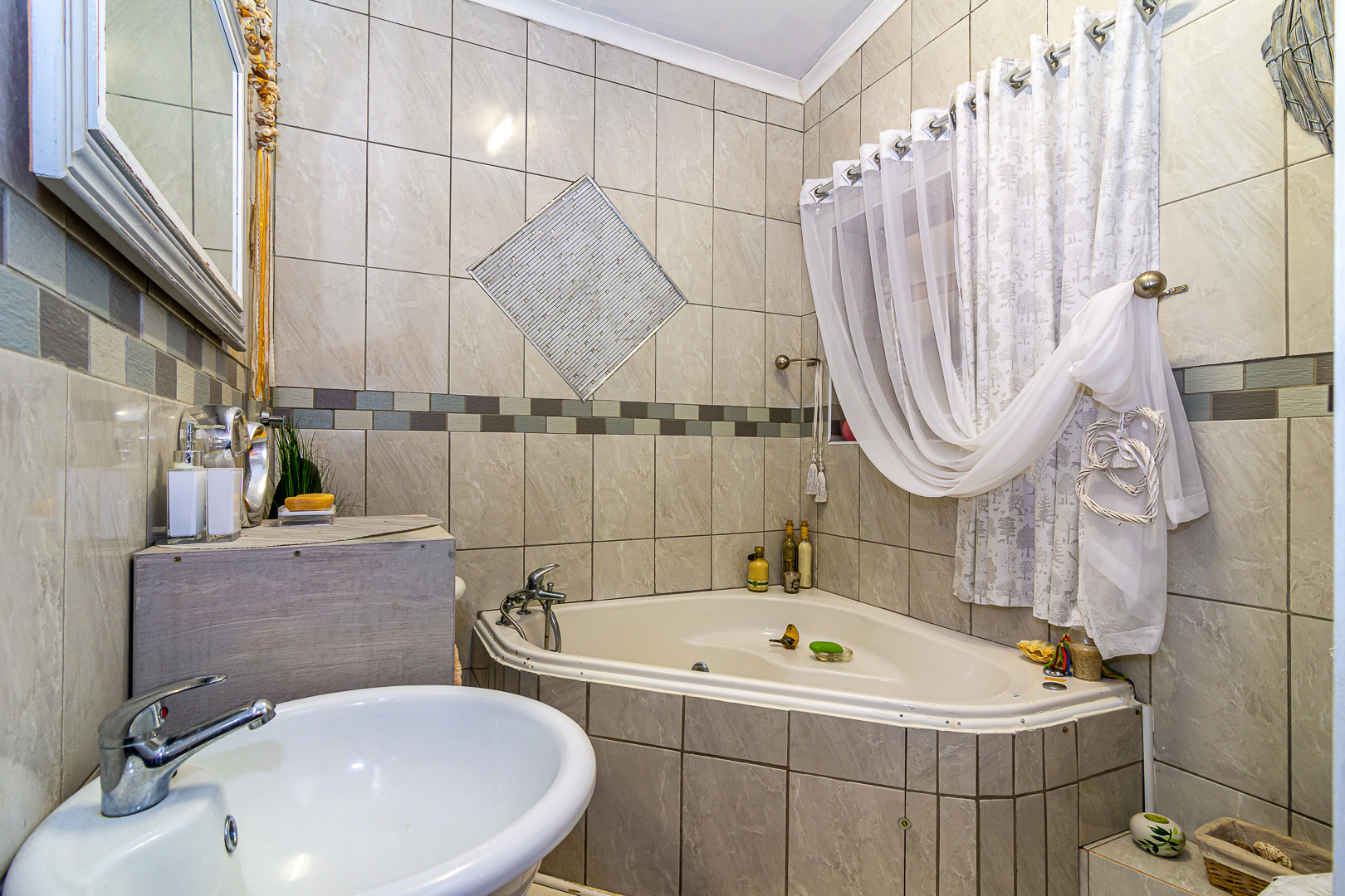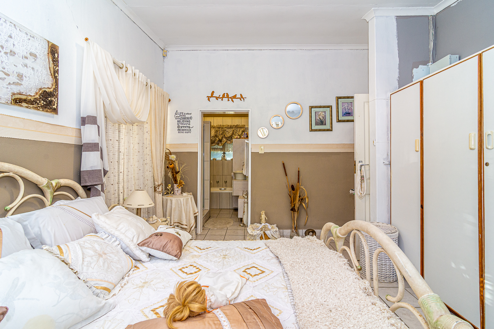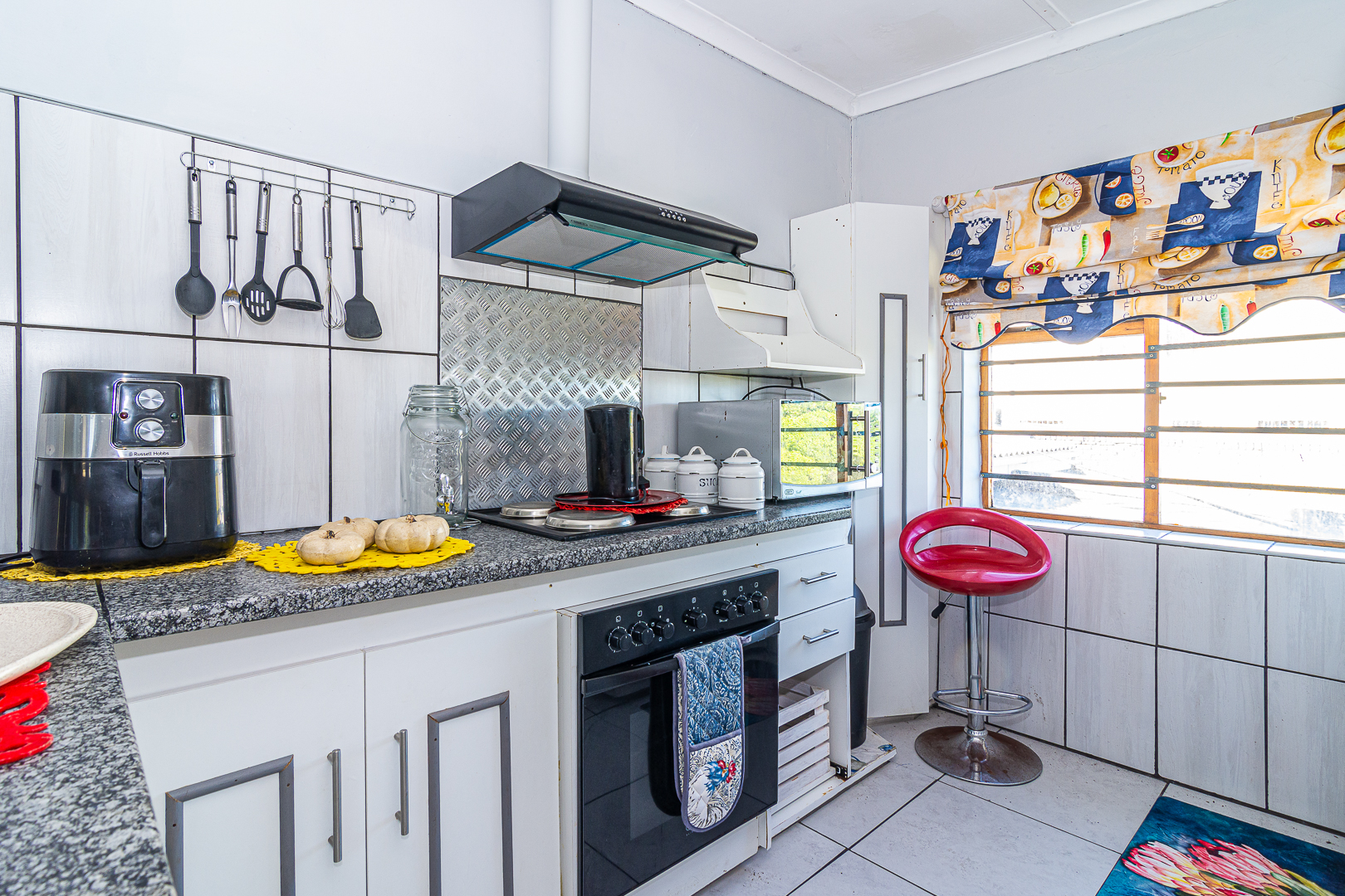 The main house consists of four bedrooms (two with en-suites), three bathrooms, an open plan kitchen/living/dining area, scullery, pantry, laundry, entertainment room with built-in braai as well as bar and an enclosed patio. Stairs lead to the upper level, consisting of a bachelor’s flat – spacious bedroom, light and bright, bathroom and kitchenette. There is a single garage, store room, two carports, JOJO tank and small kiddies pool/fish pond.