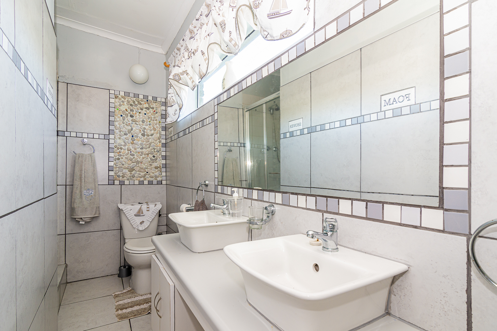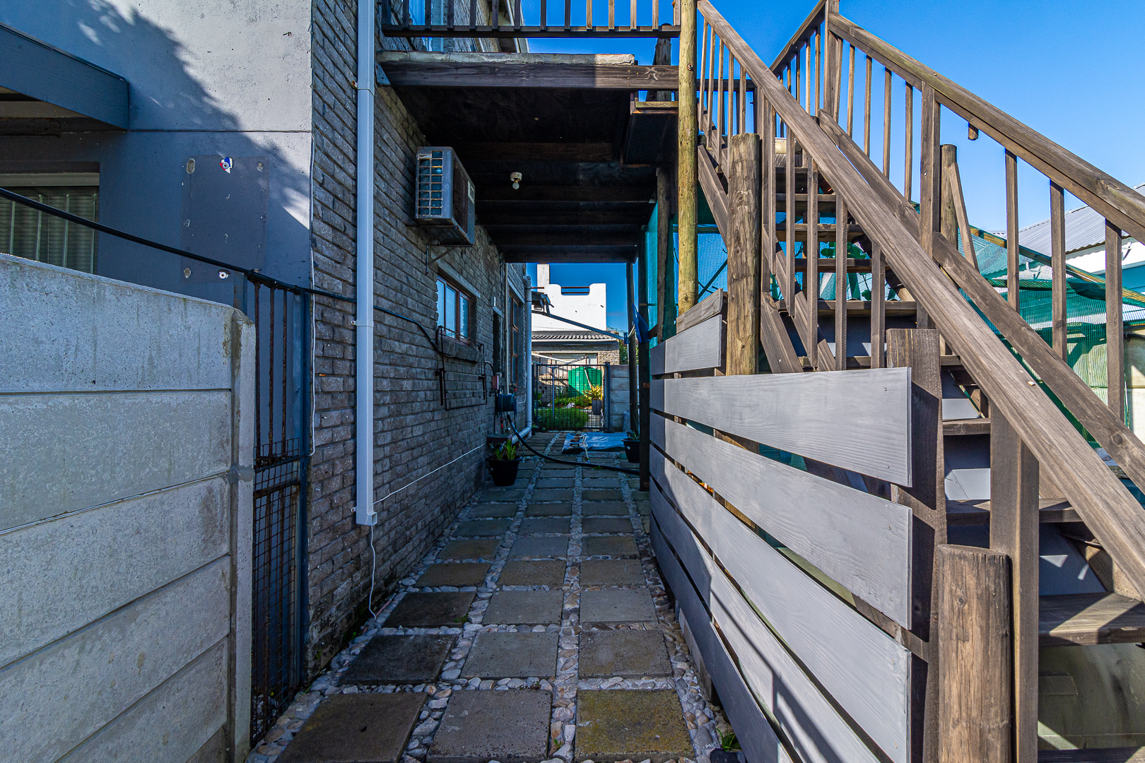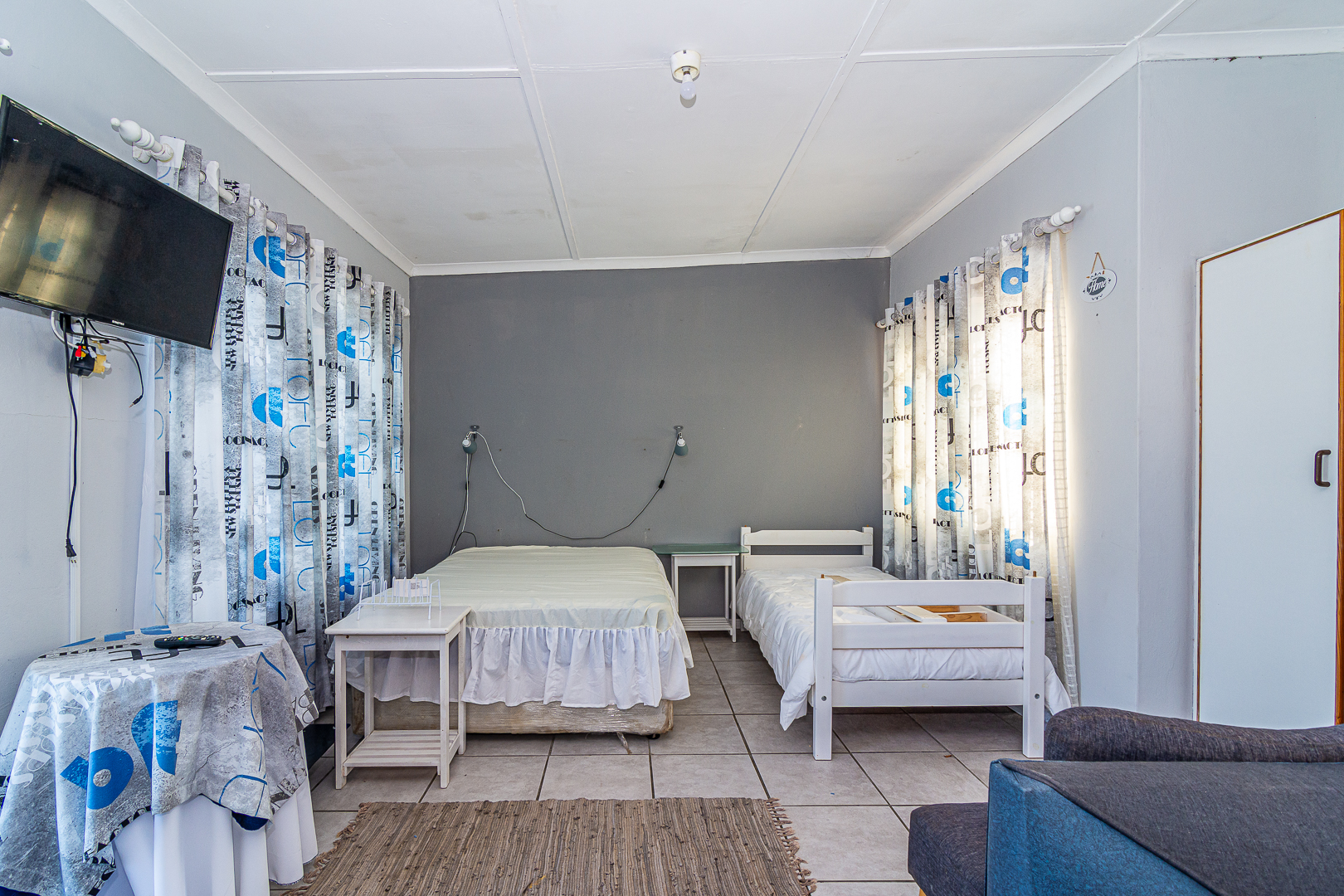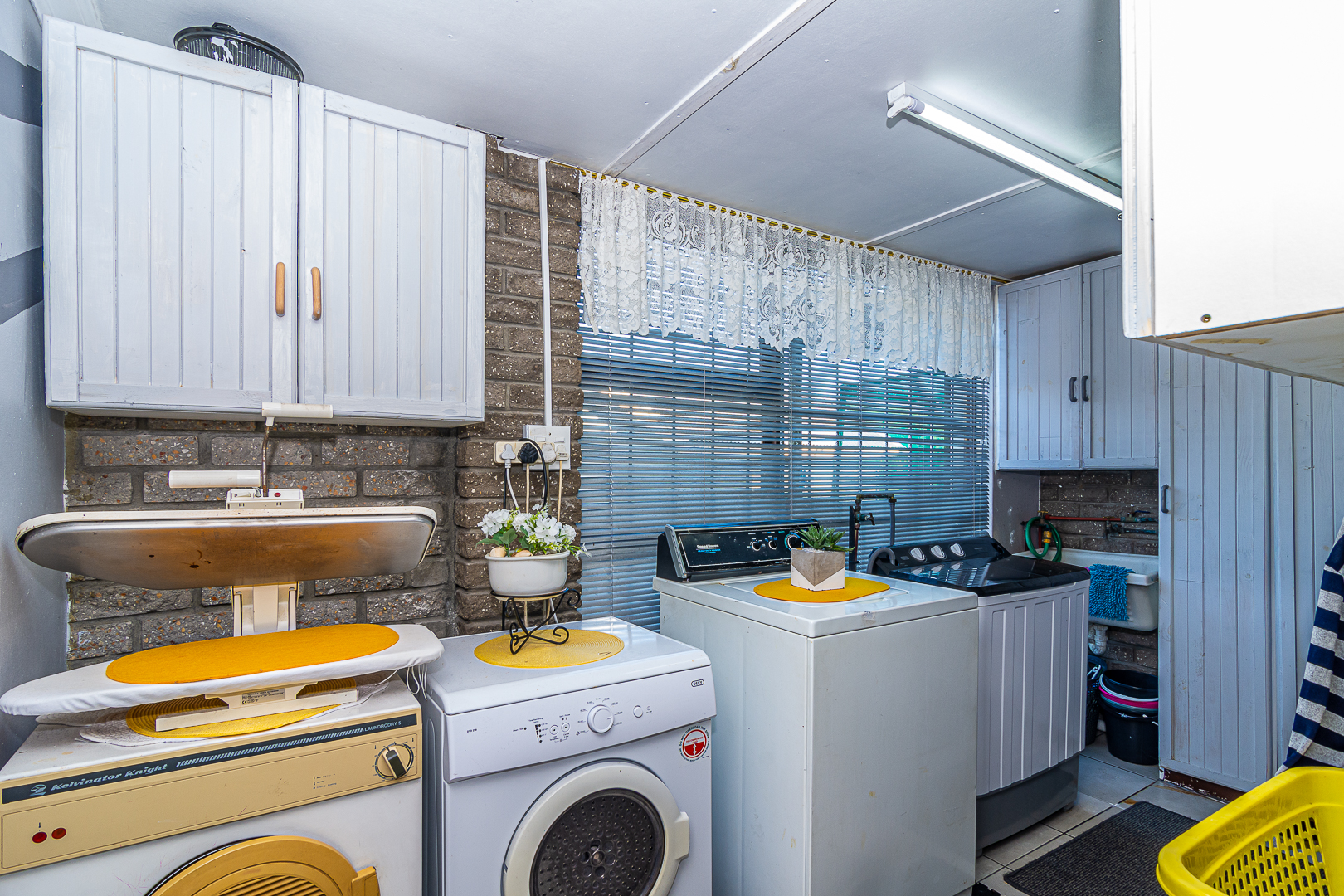 The main house consists of four bedrooms (two with en-suites), three bathrooms, an open plan kitchen/living/dining area, scullery, pantry, laundry, entertainment room with built-in braai as well as bar and an enclosed patio. Stairs lead to the upper level, consisting of a bachelor’s flat – spacious bedroom, light and bright, bathroom and kitchenette. There is a single garage, store room, two carports, JOJO tank and small kiddies pool/fish pond.