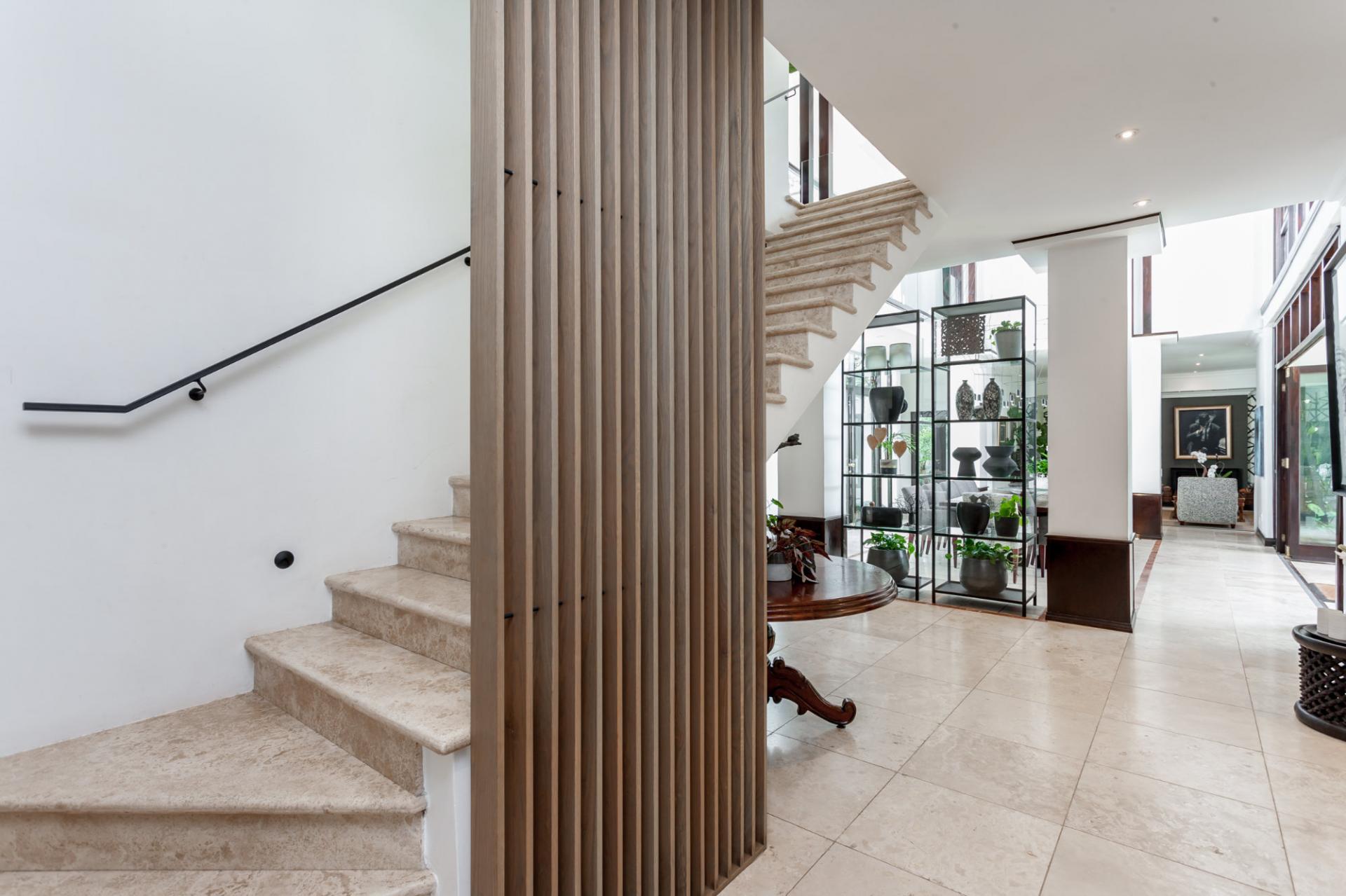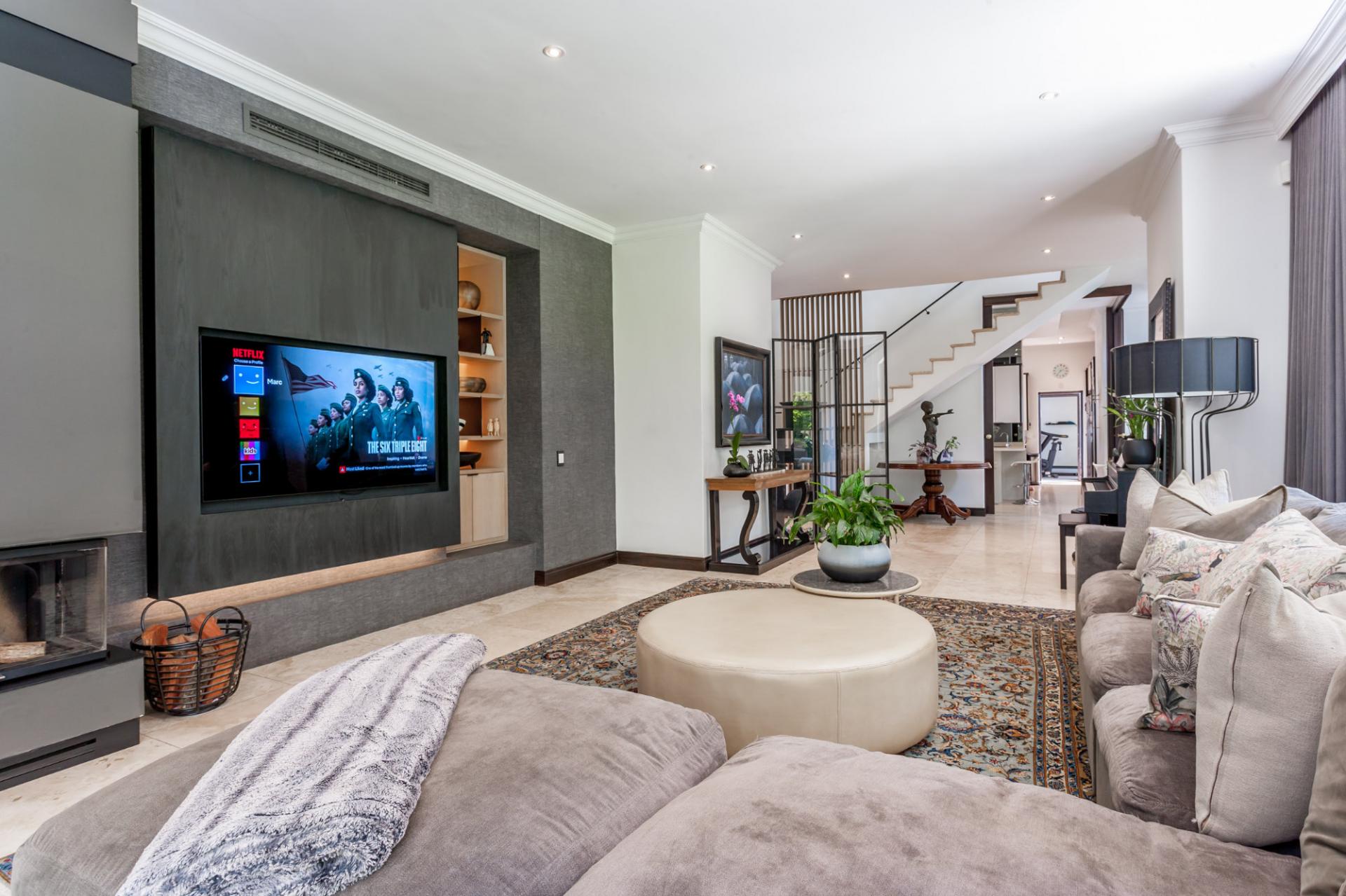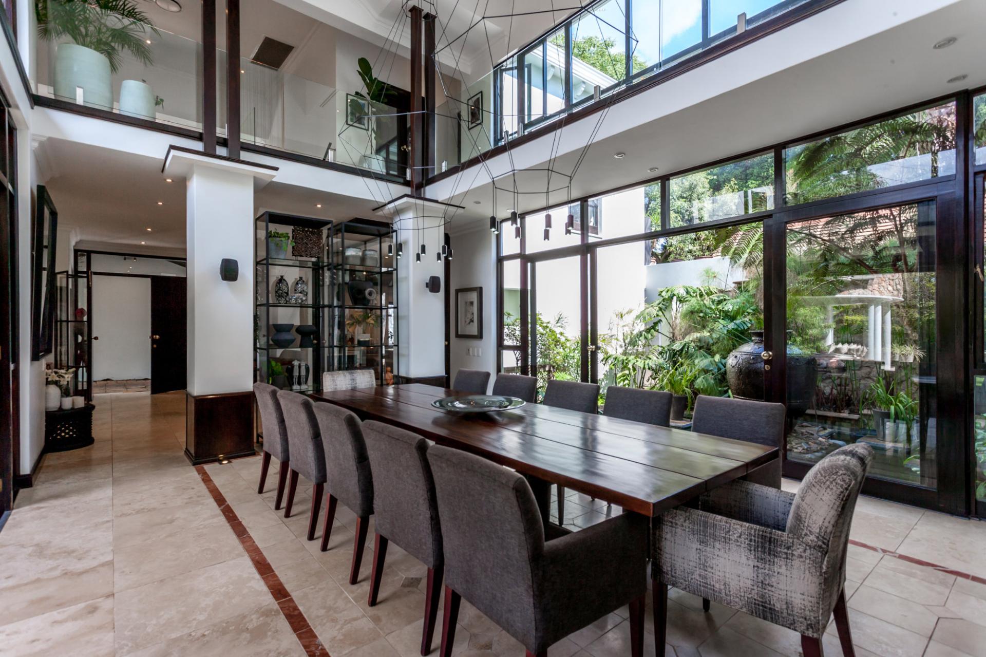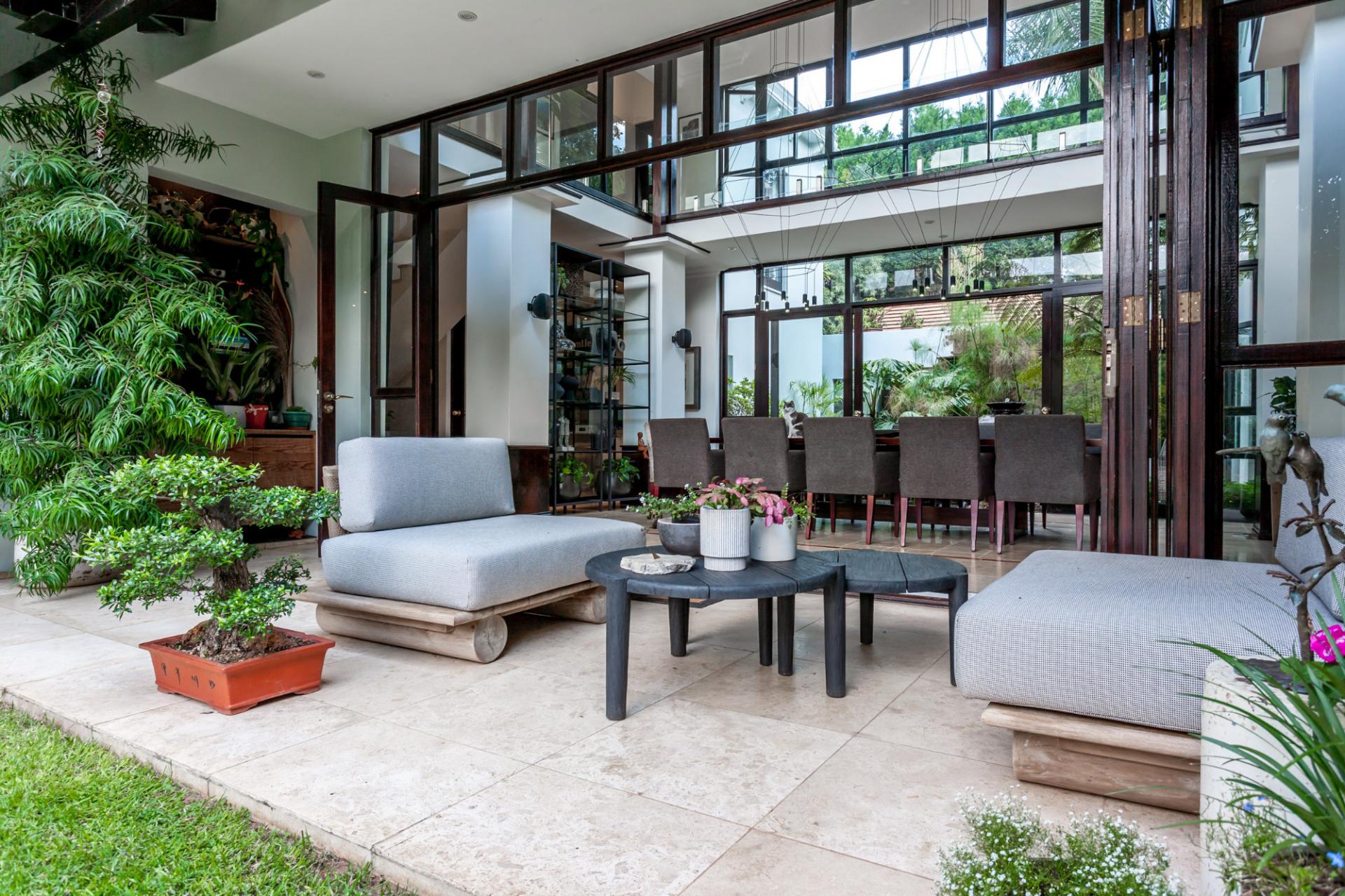 An oasis of trees and shrubbery welcomes you to a home that has been set cleverly on the land, maximising the north garden. With an elegant drive through entrance, you are lead directly into the gracious double volume entrance hall. This home grabs you immediately as you walk into it to a wonderful open plan living and dining downstairs with a central courtyard and water feature with koi pond. The home opens to the garden through french doors and glass retractable doors. The connection between the garden and home is seamless and flowing. The separate tv/family room room opens out through retractable doors onto a wonderfully large covered patio with a built in braai. The patio has casual seating as well as a dining area.