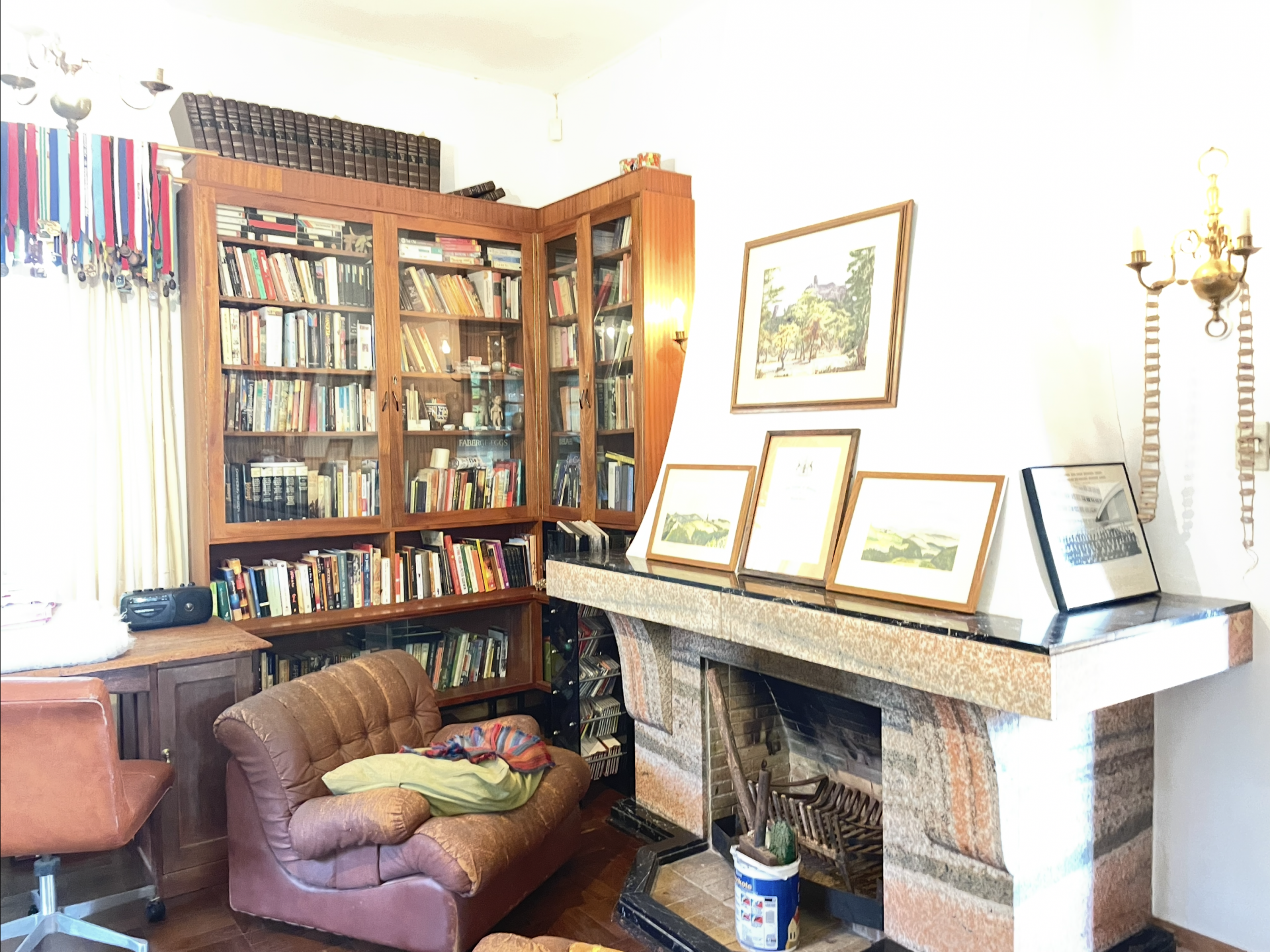 For those who work from home, the study is a wood-panelled haven, complete with its own fireplace and doors leading out to a covered terrace. Here, you can enjoy views of the established trees, garden, and pool – an ideal spot for relaxation or entertaining.