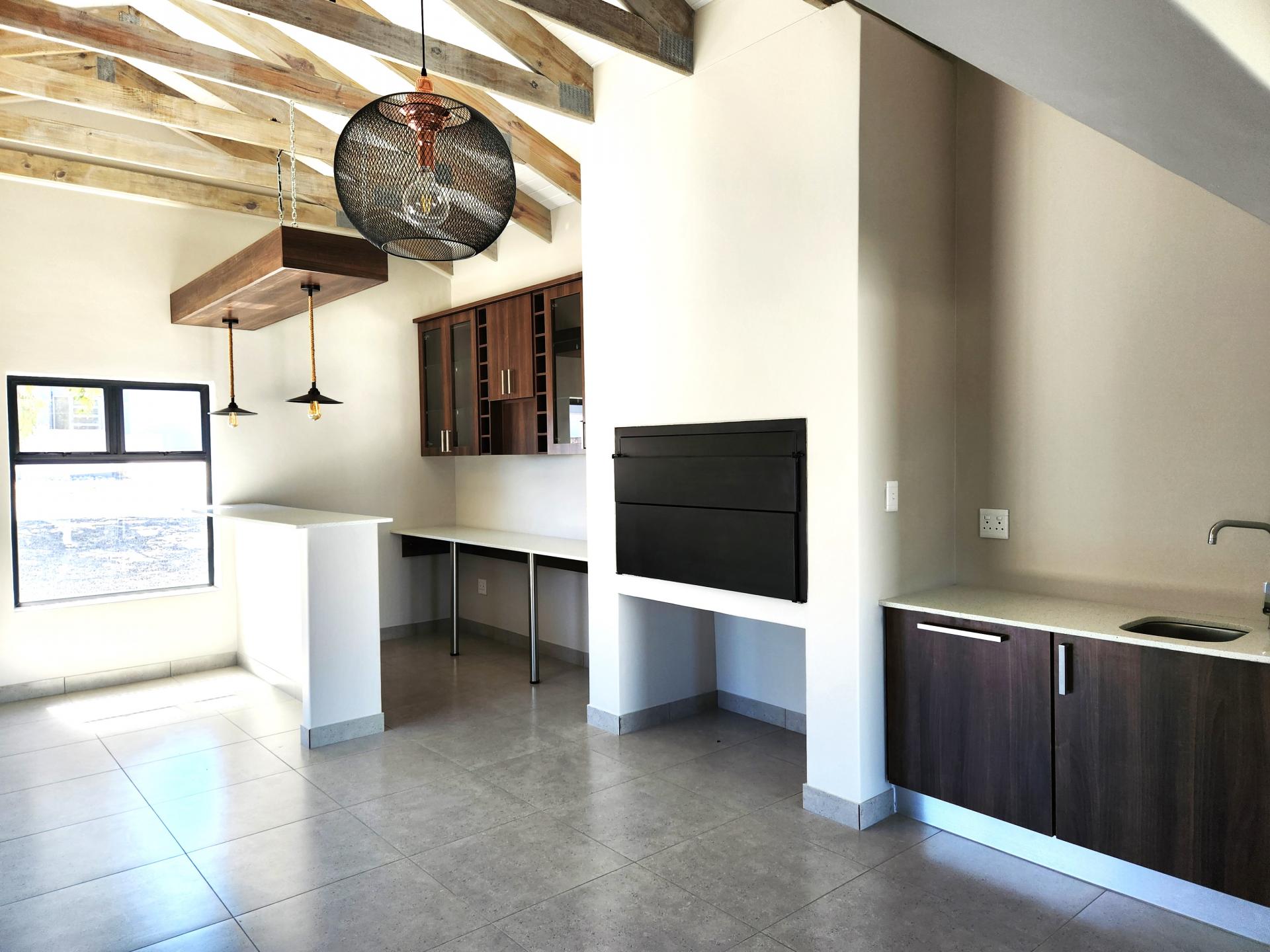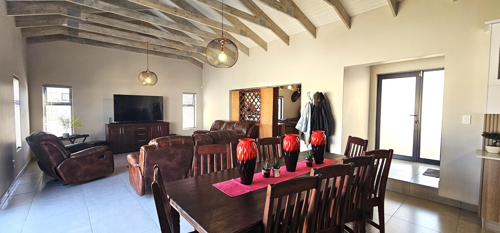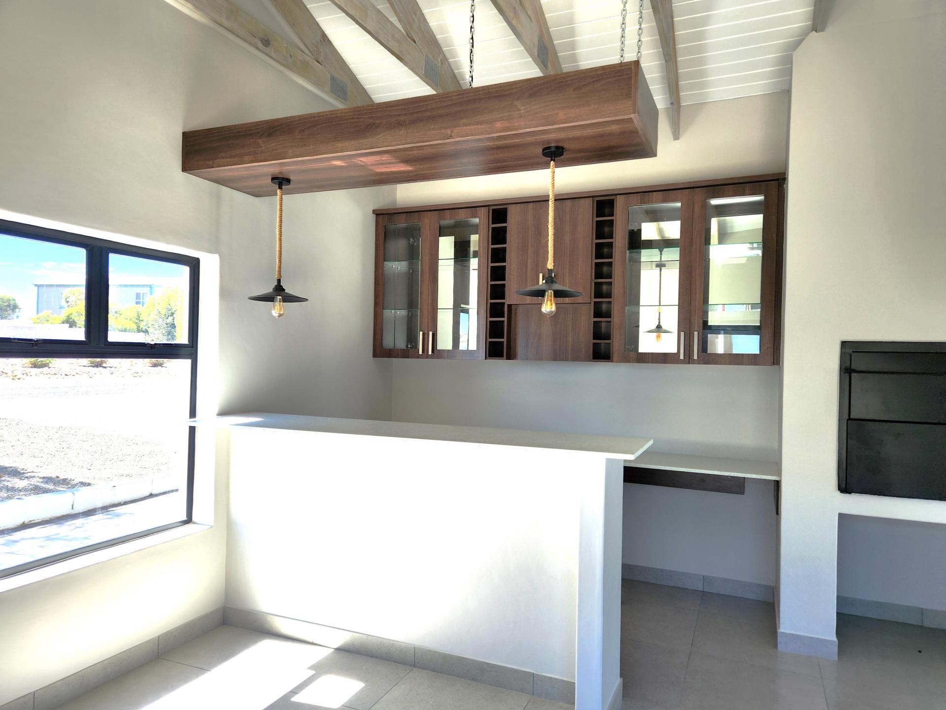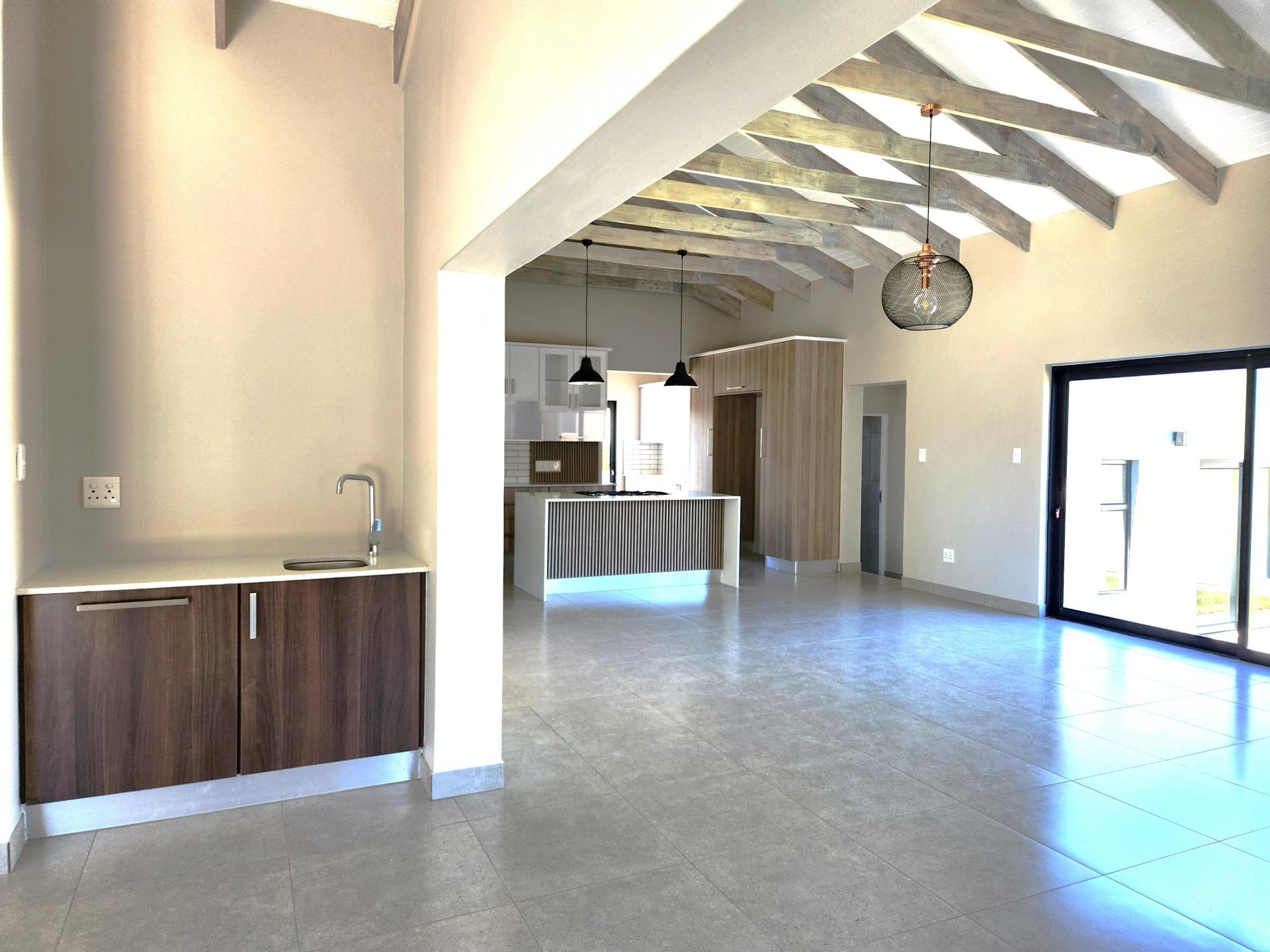 The dining area, also part of the open plan layout, features large sliding doors that flood the space with natural light and offer access to the outdoor entertainment area. The lounge area flows seamlessly into the braai/entertainment area, complete with a built-in braai and a beautifully designed built-in bar, ideal for hosting gatherings and creating unforgettable memories with friends and family. Additionally, there's a kitchenette with a prep bowl for added convenience, and a guest toilet for the comfort of your guests.
