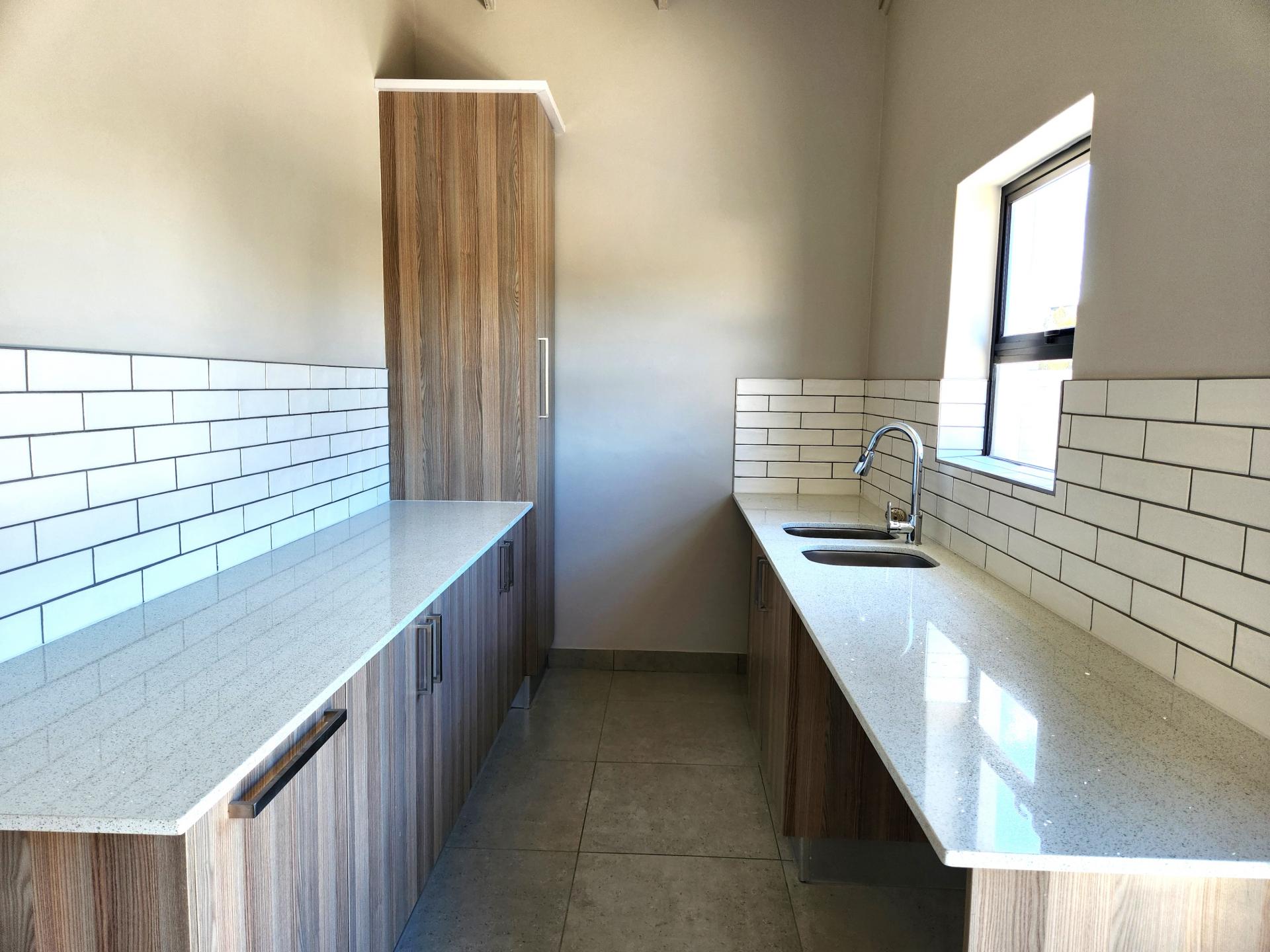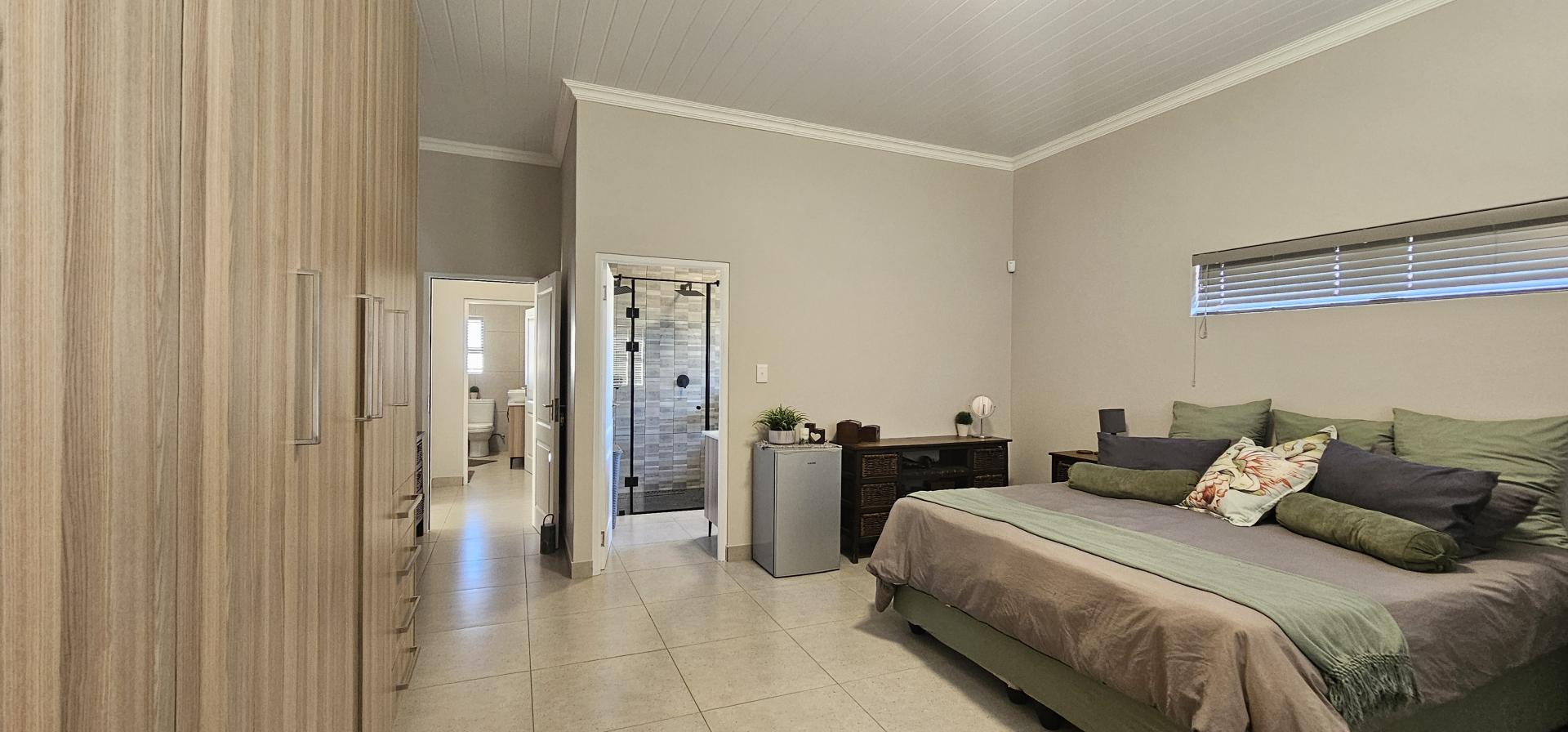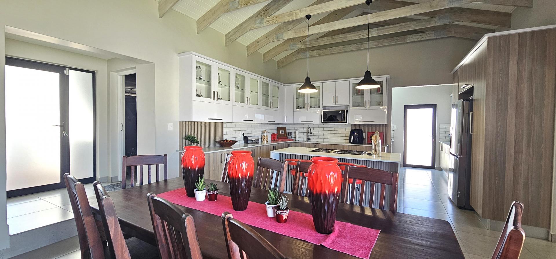 The dining area, also part of the open plan layout, features large sliding doors that flood the space with natural light and offer access to the outdoor entertainment area. The lounge area flows seamlessly into the braai/entertainment area, complete with a built-in braai and a beautifully designed built-in bar, ideal for hosting gatherings and creating unforgettable memories with friends and family. Additionally, there's a kitchenette with a prep bowl for added convenience, and a guest toilet for the comfort of your guests.