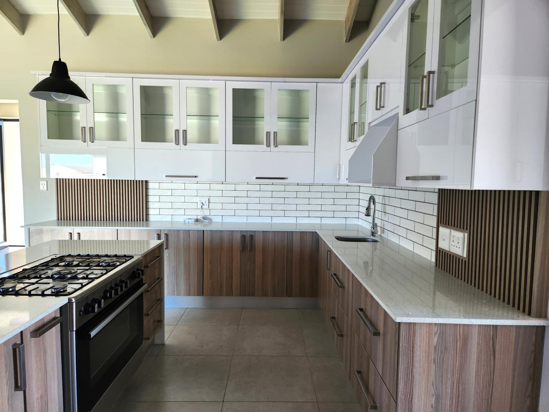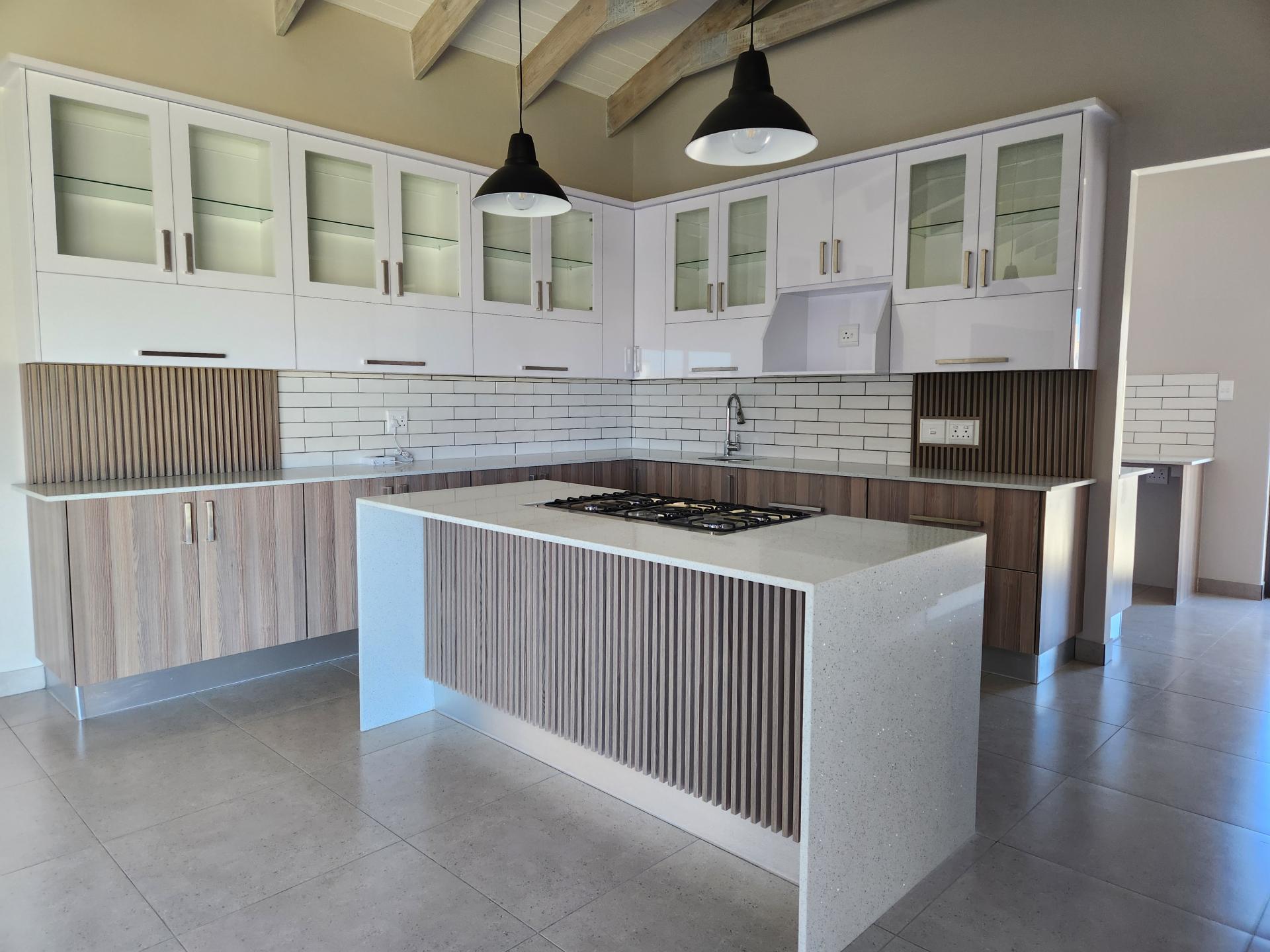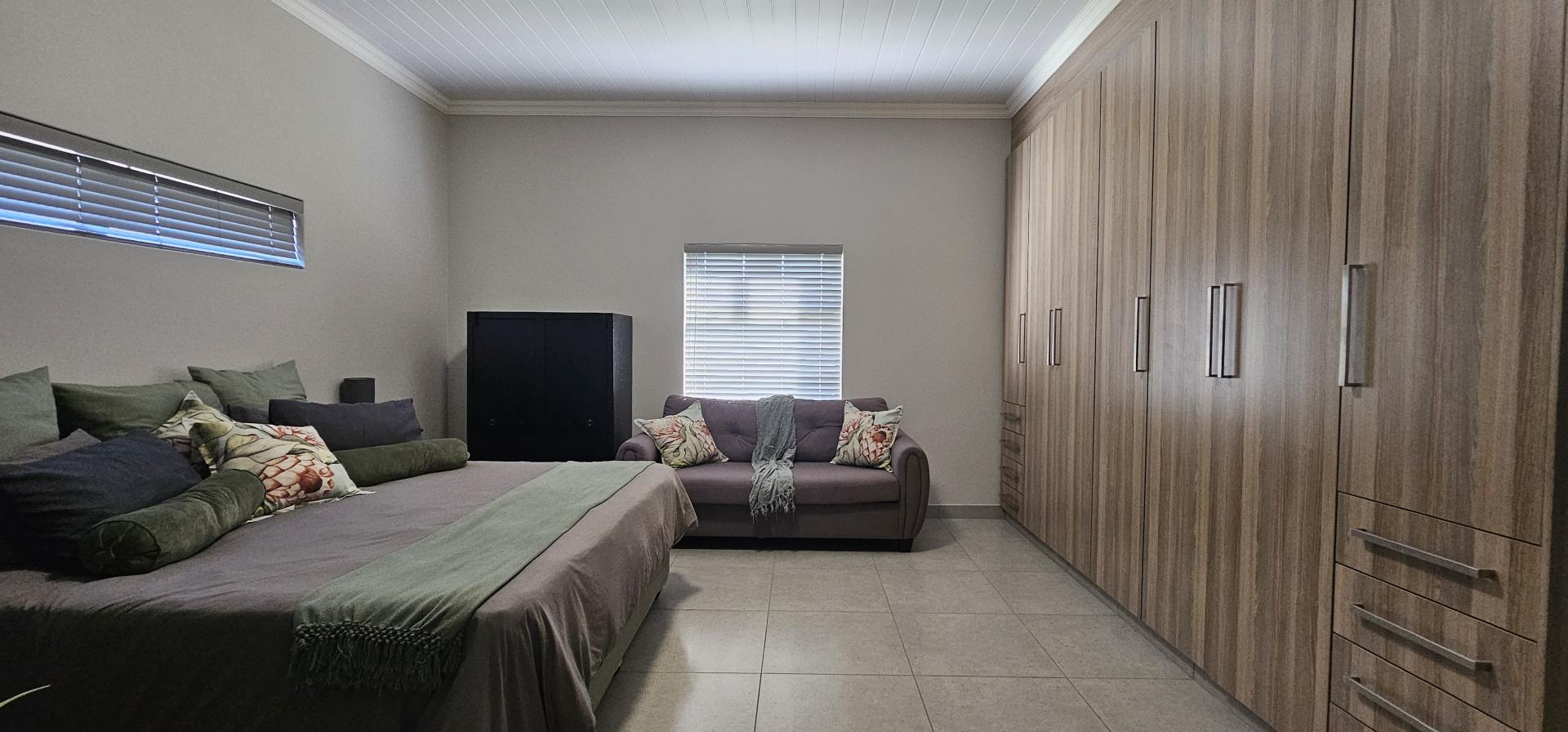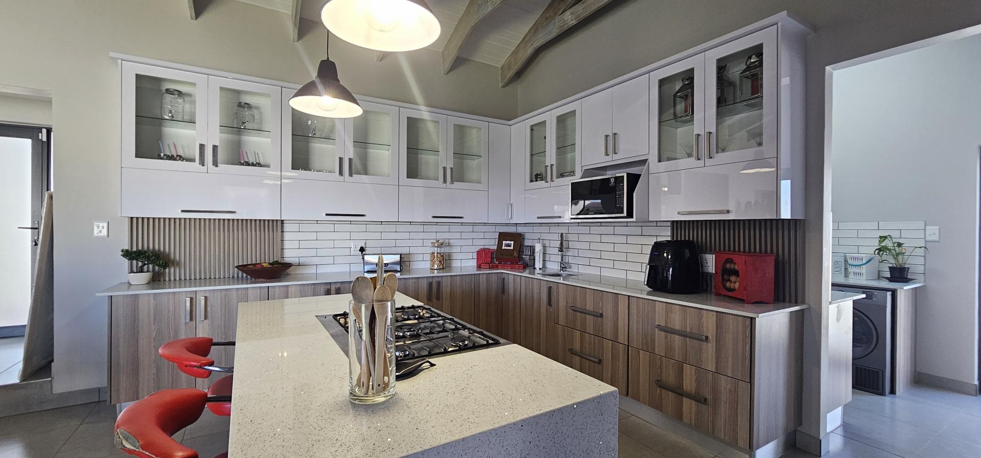 The heart of the home is the open plan kitchen, boasting an abundance of built-in cupboards, granite tops, a 5-burner gas stove, and luxurious Caesar stone tops. A convenient breakfast island adds both functionality and style to the space, perfect for casual meals or entertaining guests. Adjacent to the kitchen is a separate scullery, providing ample space for all your appliances and keeping the main kitchen area clutter-free.