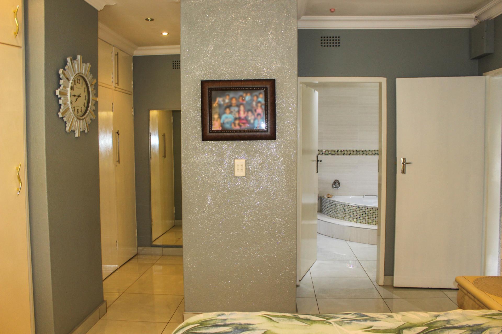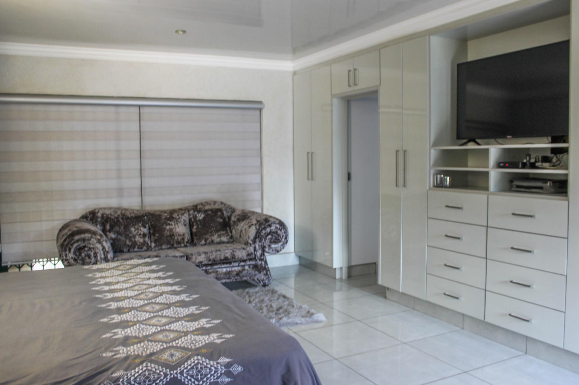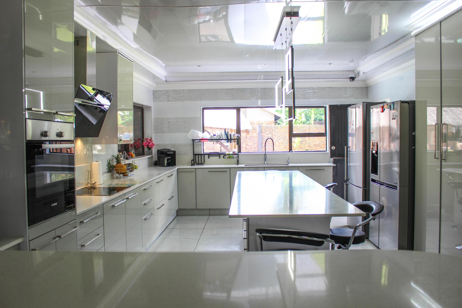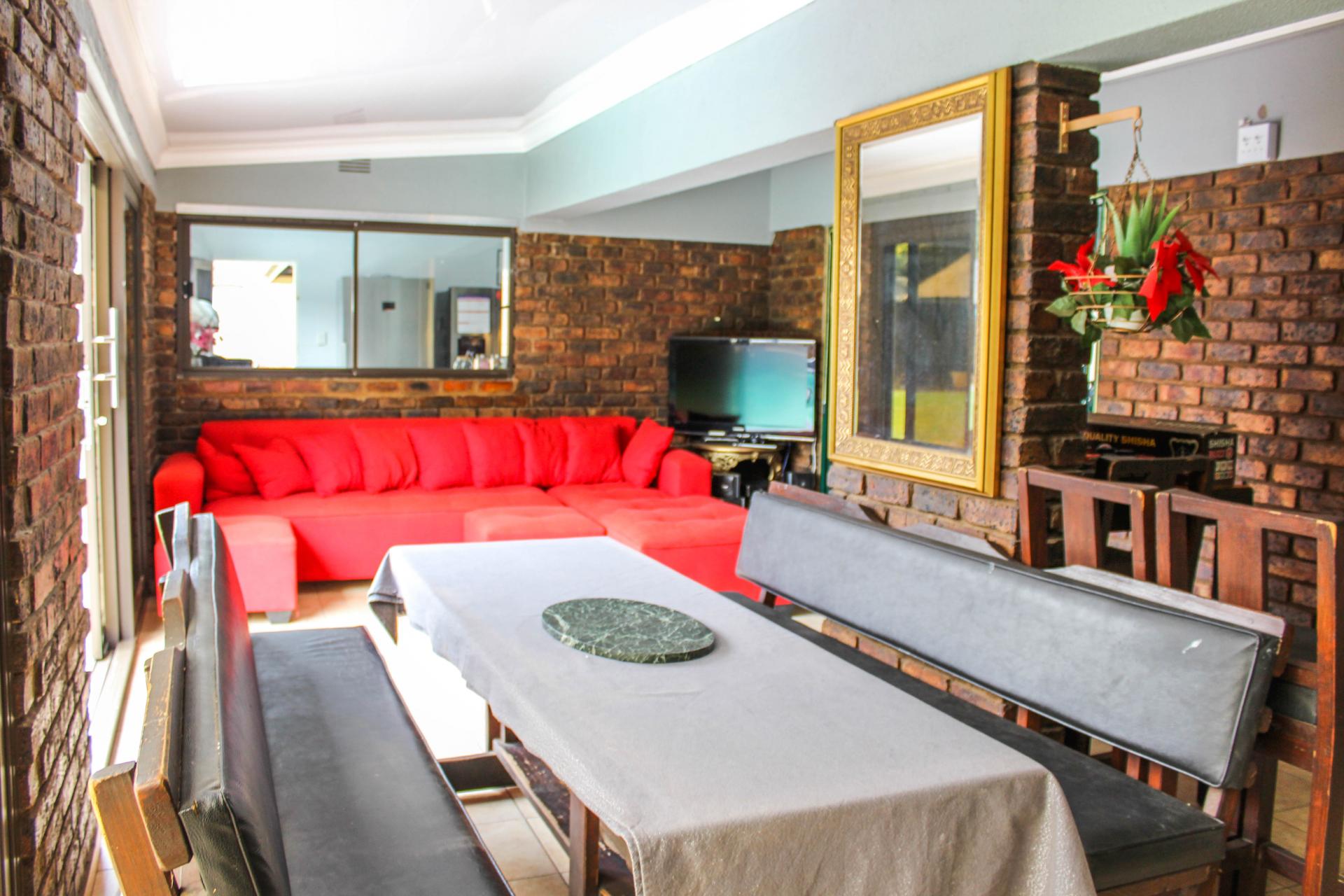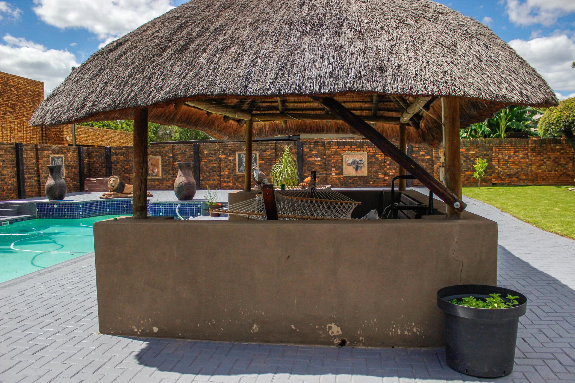 Entertain in style in the spacious entertainment area, equipped with a built-in braai, double sliding doors opening to the outdoor oasis with a large swimming pool, a lapa for lounging, and a sprawling garden.