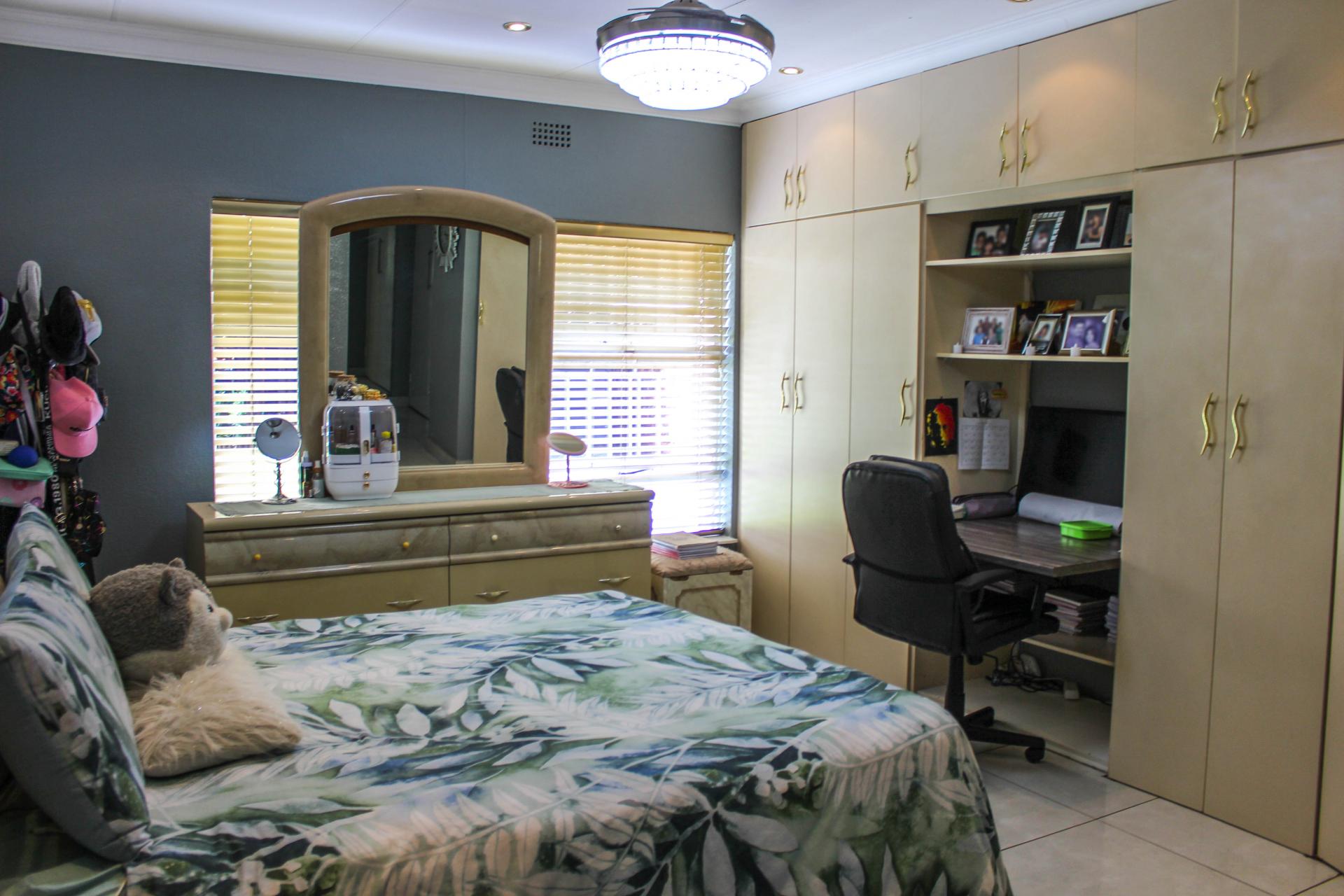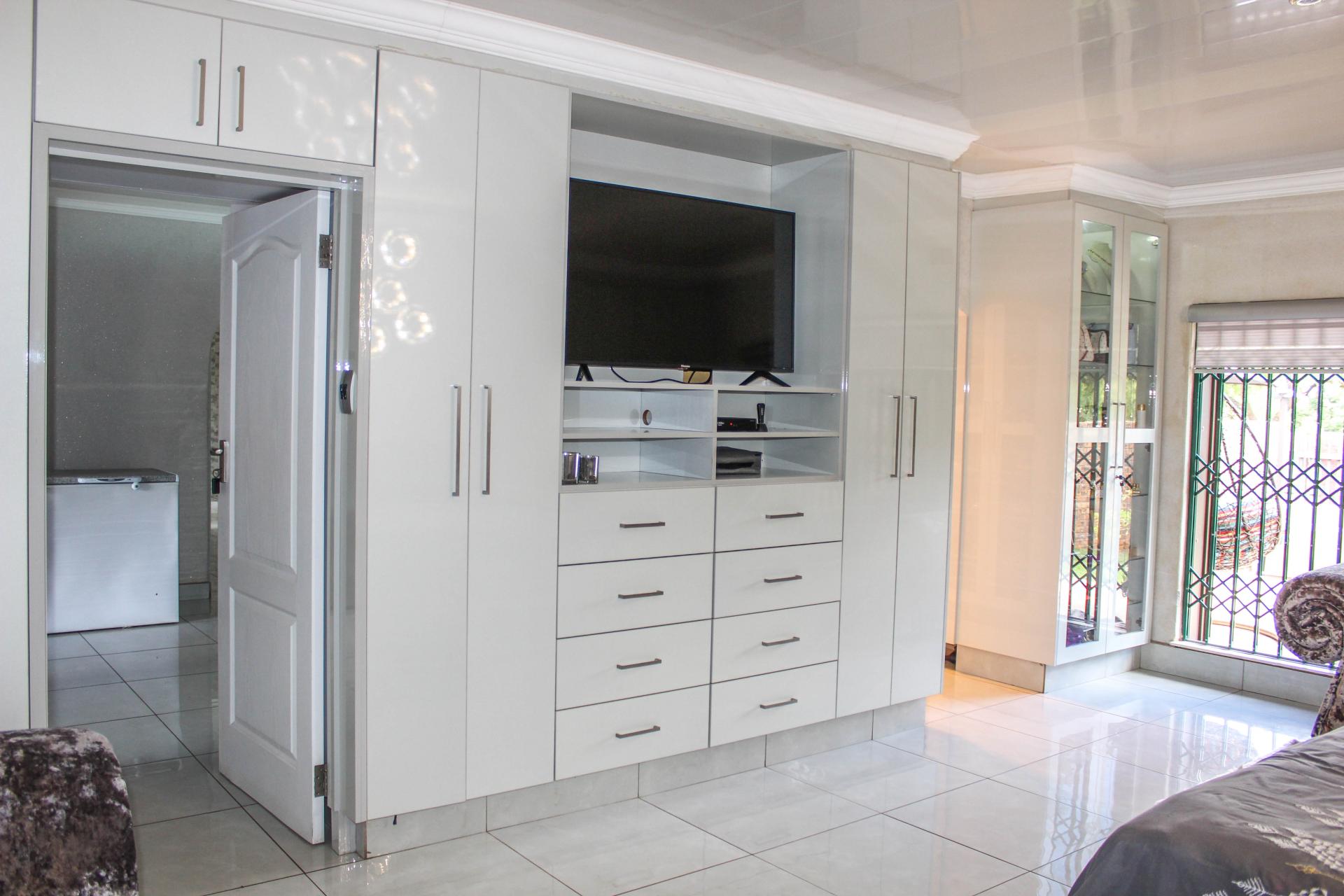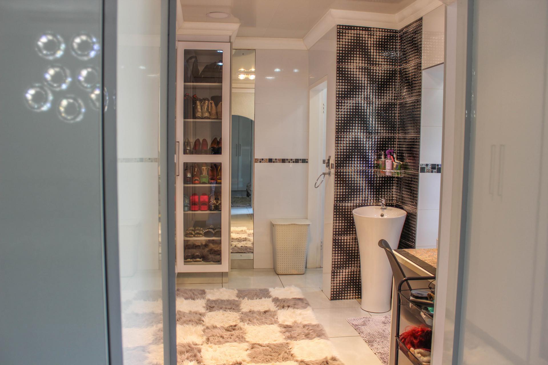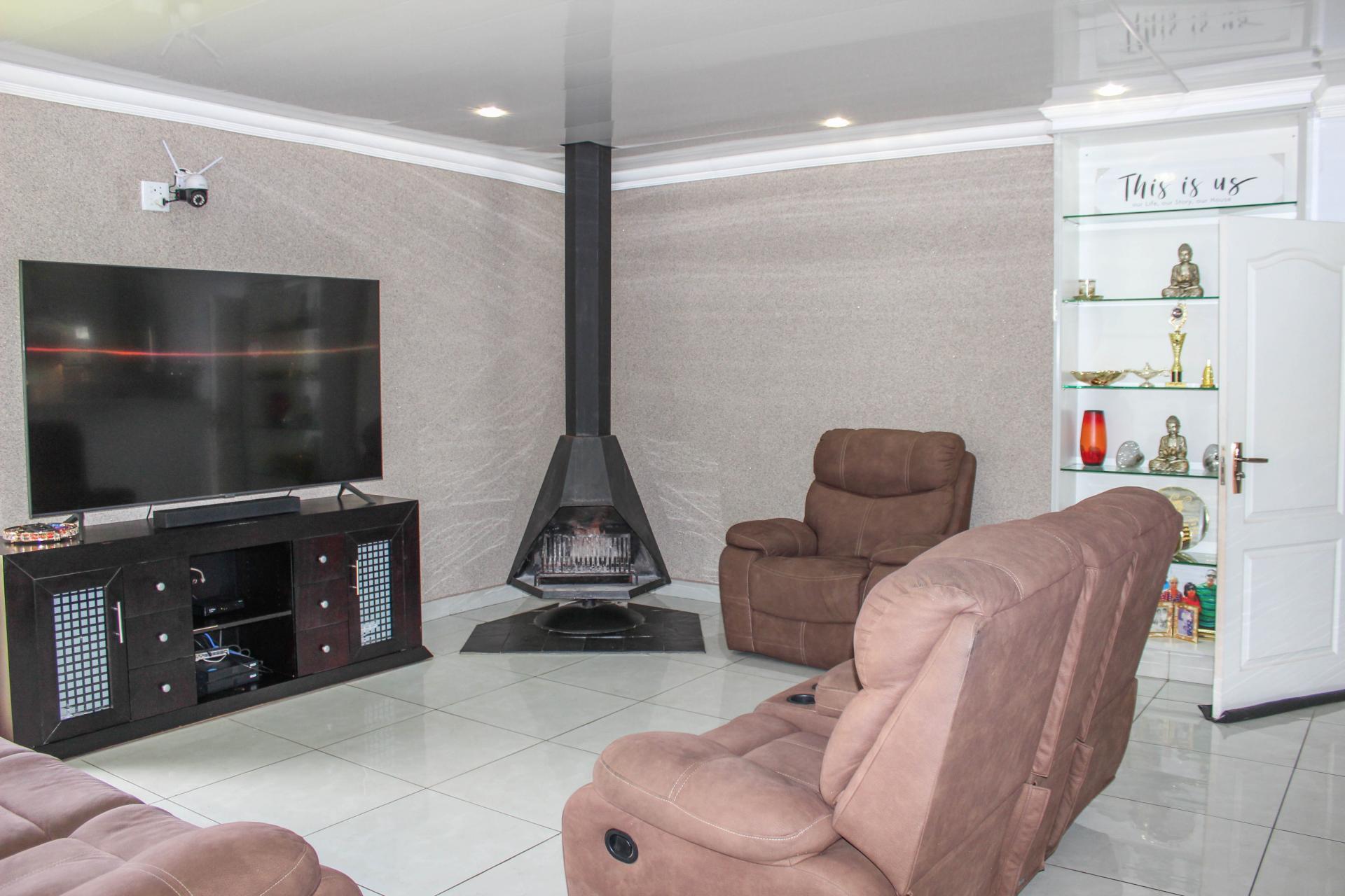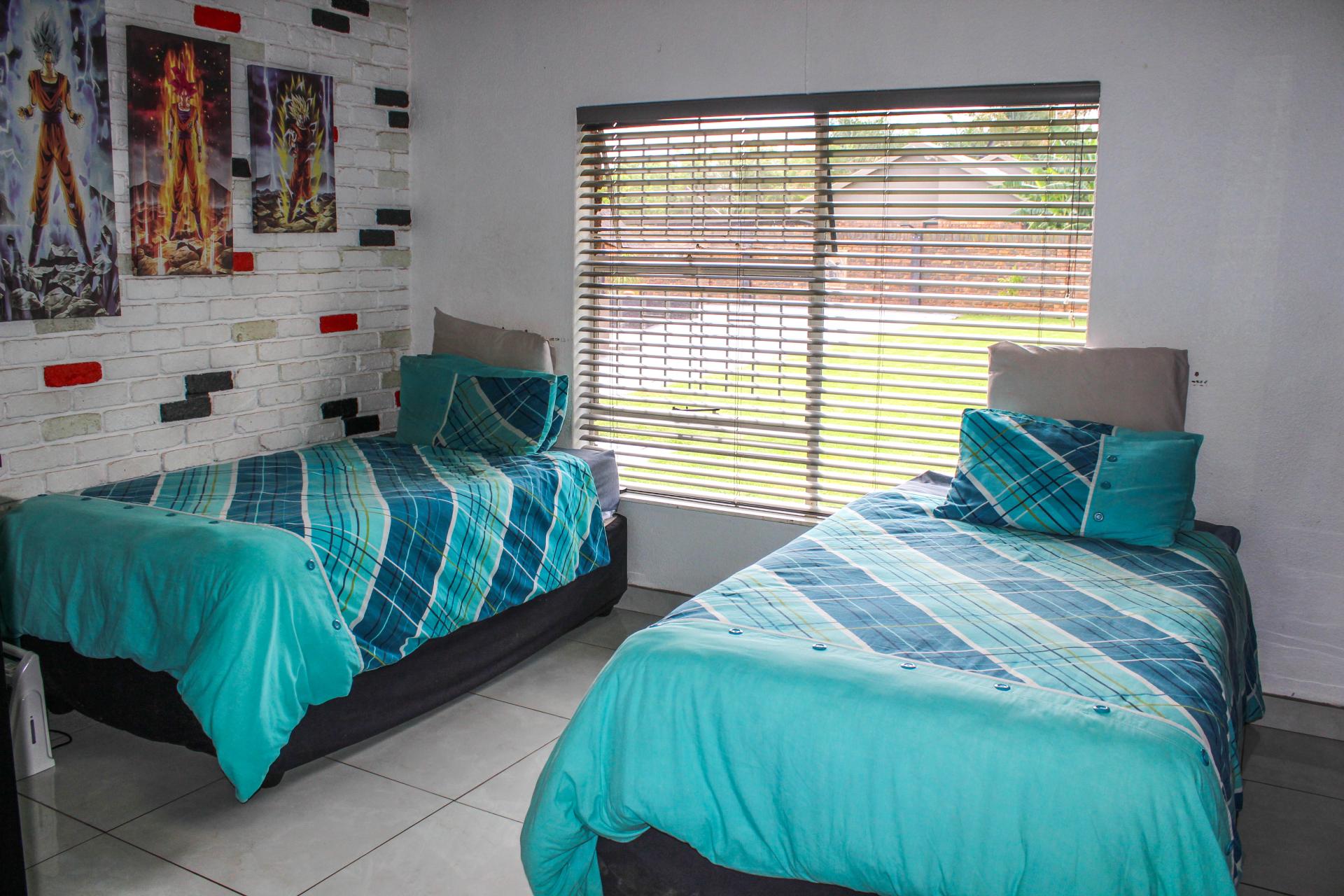 Entertain in style in the spacious entertainment area, equipped with a built-in braai, double sliding doors opening to the outdoor oasis with a large swimming pool, a lapa for lounging, and a sprawling garden.