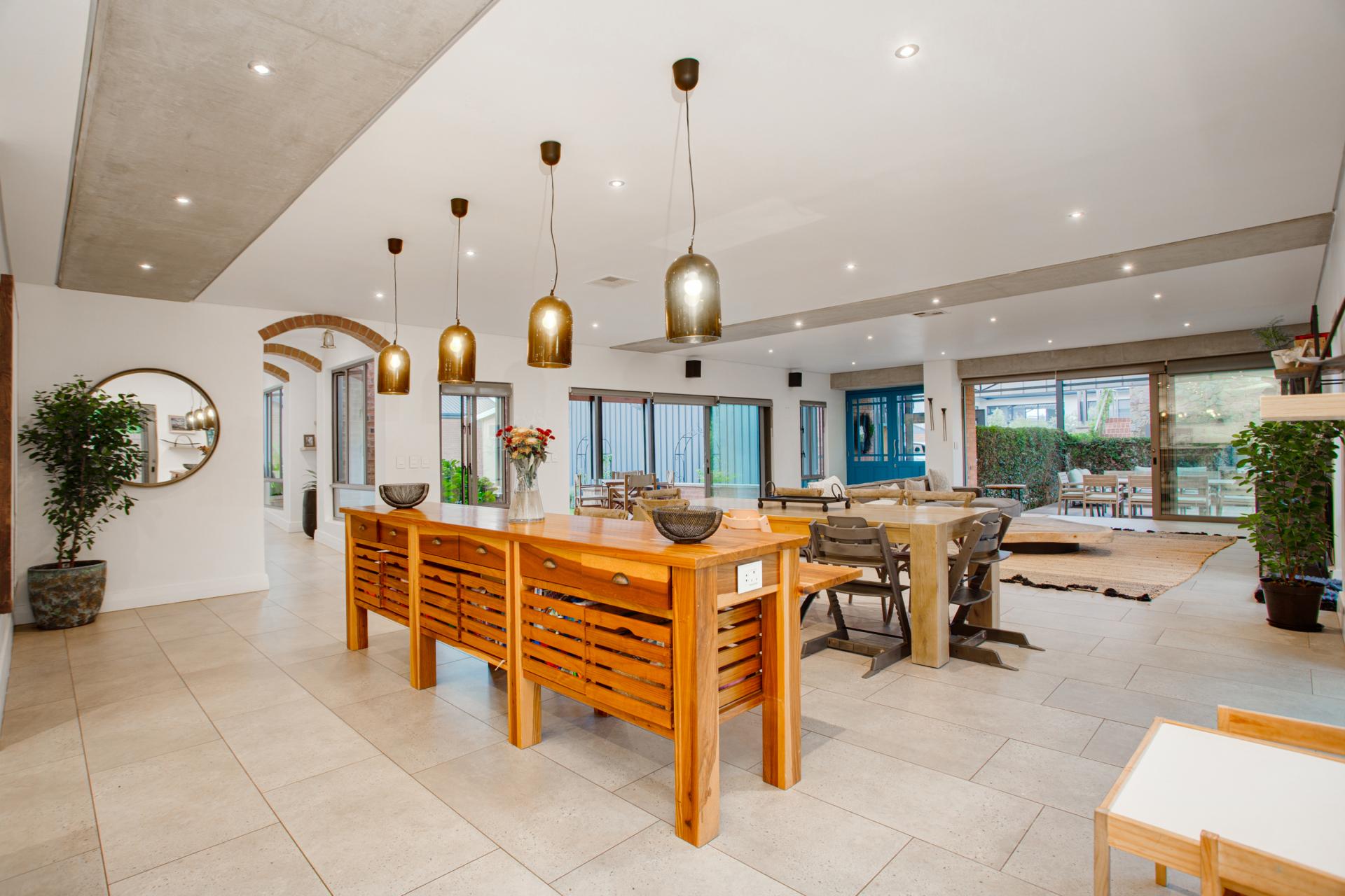Externally, the property features rainwater collection tanks for both irrigation and indoor use, along with an oversized three-car garage with ample storage, including a mezzanine level. A solar
