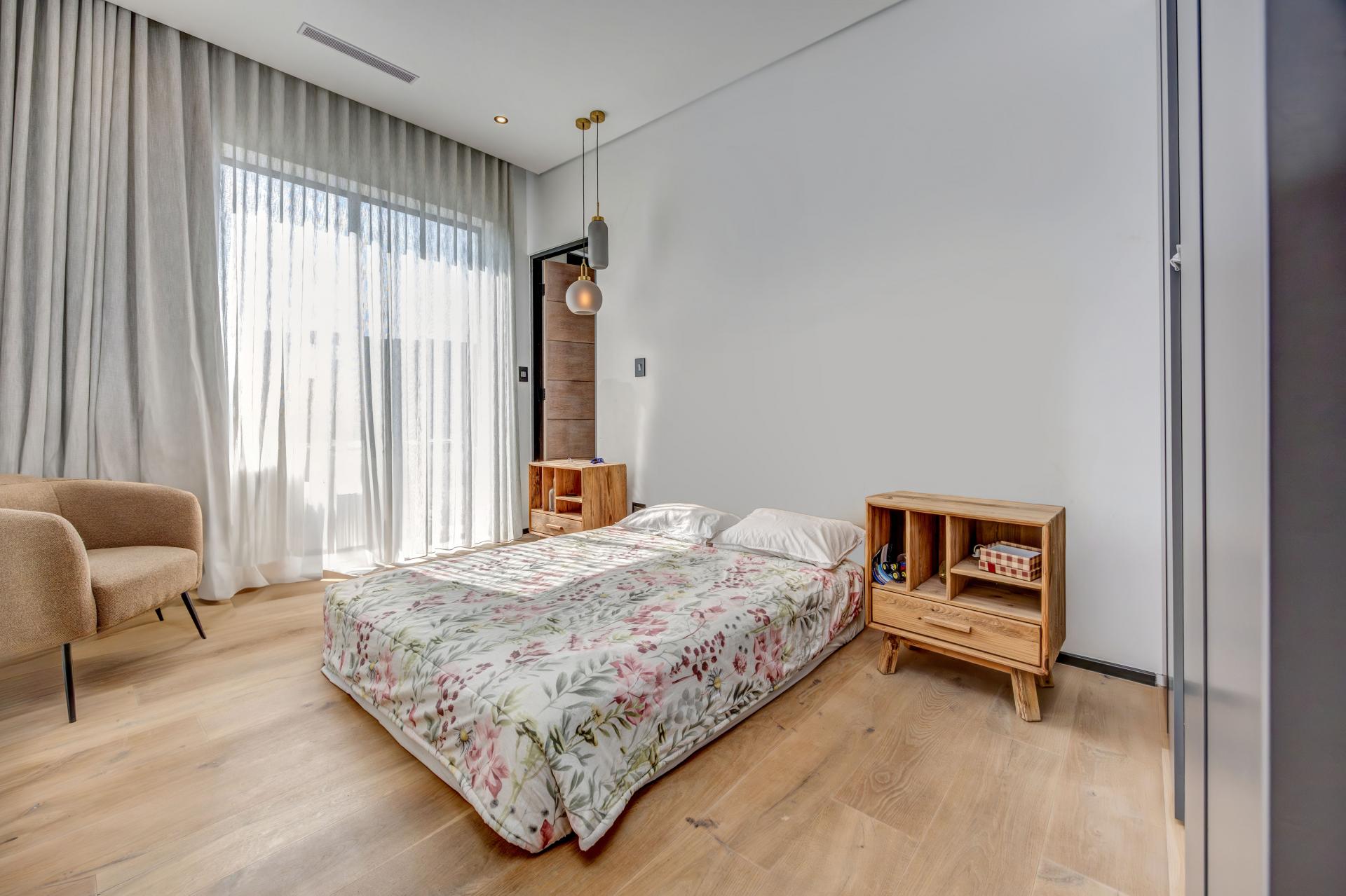 Boasting four luxurious en-suite bedrooms, the home is finished to the highest standards with standout features such as solid wood herringbone flooring and contemporary detailing throughout. An inviting upstairs pyjama lounge provides a peaceful retreat, while the large covered patio—with a built-in bar, timber decking, and a glistening swimming pool—creates the perfect setting for relaxed outdoor living.