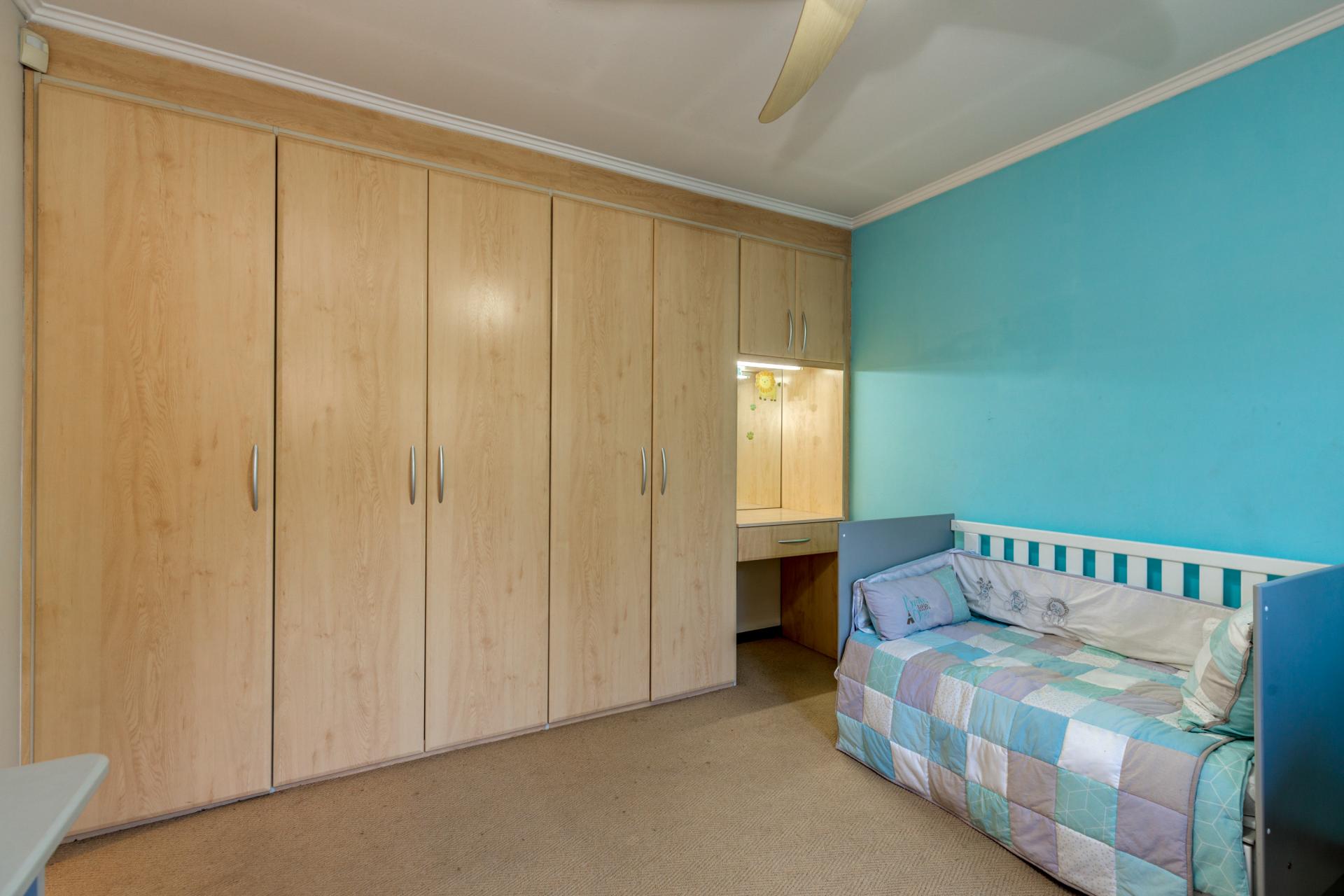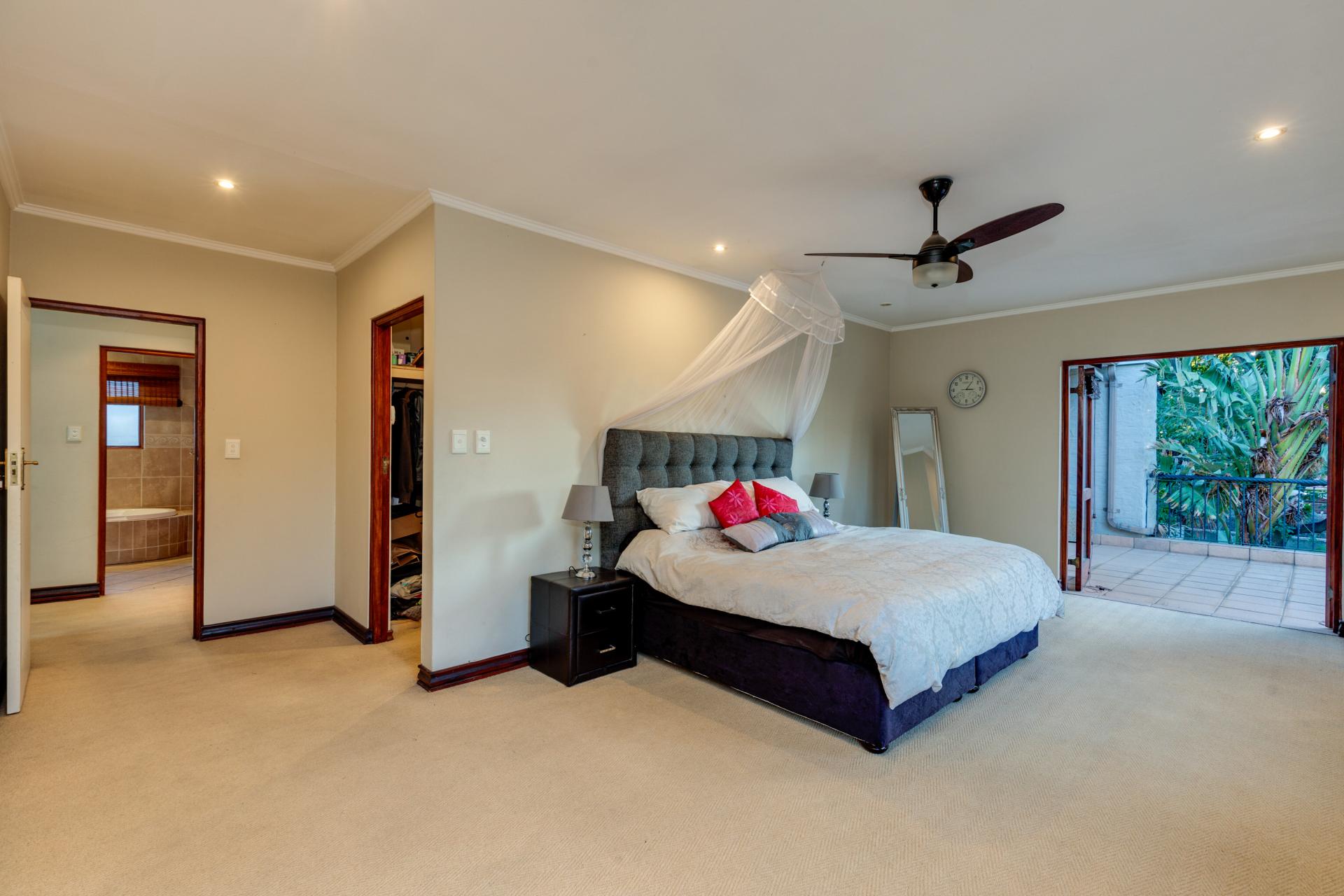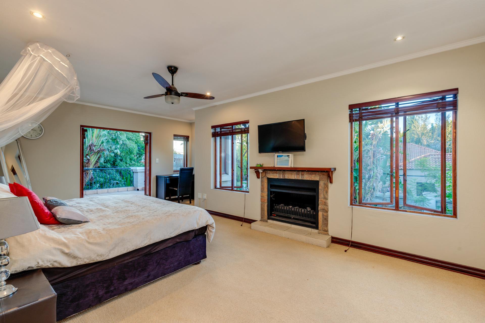 Upstairs, the main suite features double-volume ceilings, a gas fireplace, and doors that lead to an open balcony overlooking the garden. The suite includes a large walk-in closet and a full bathroom with a double vanity. Bedroom two is spacious with ample cupboard space and high ceilings, while bedroom three is generously sized with a ceiling fan, plenty of storage, and balcony access. These two bedrooms share a full bathroom.