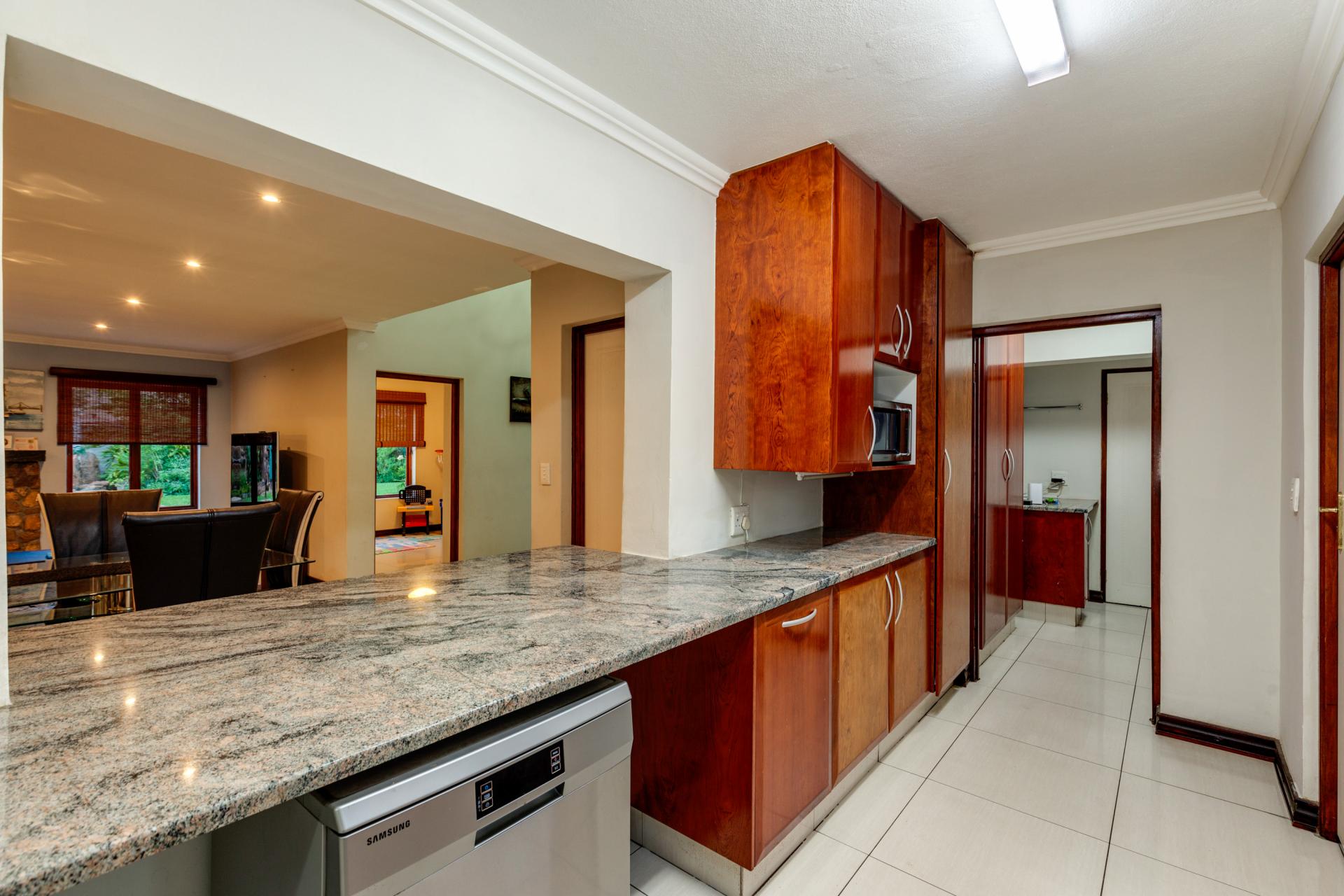The large wooden kitchen has a gas top, built-in Whirlpool oven and microwave, scullery, pantry, and space for a large fridge and three appliances, with direct access to the garage.