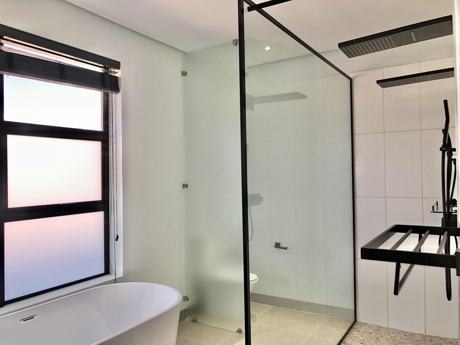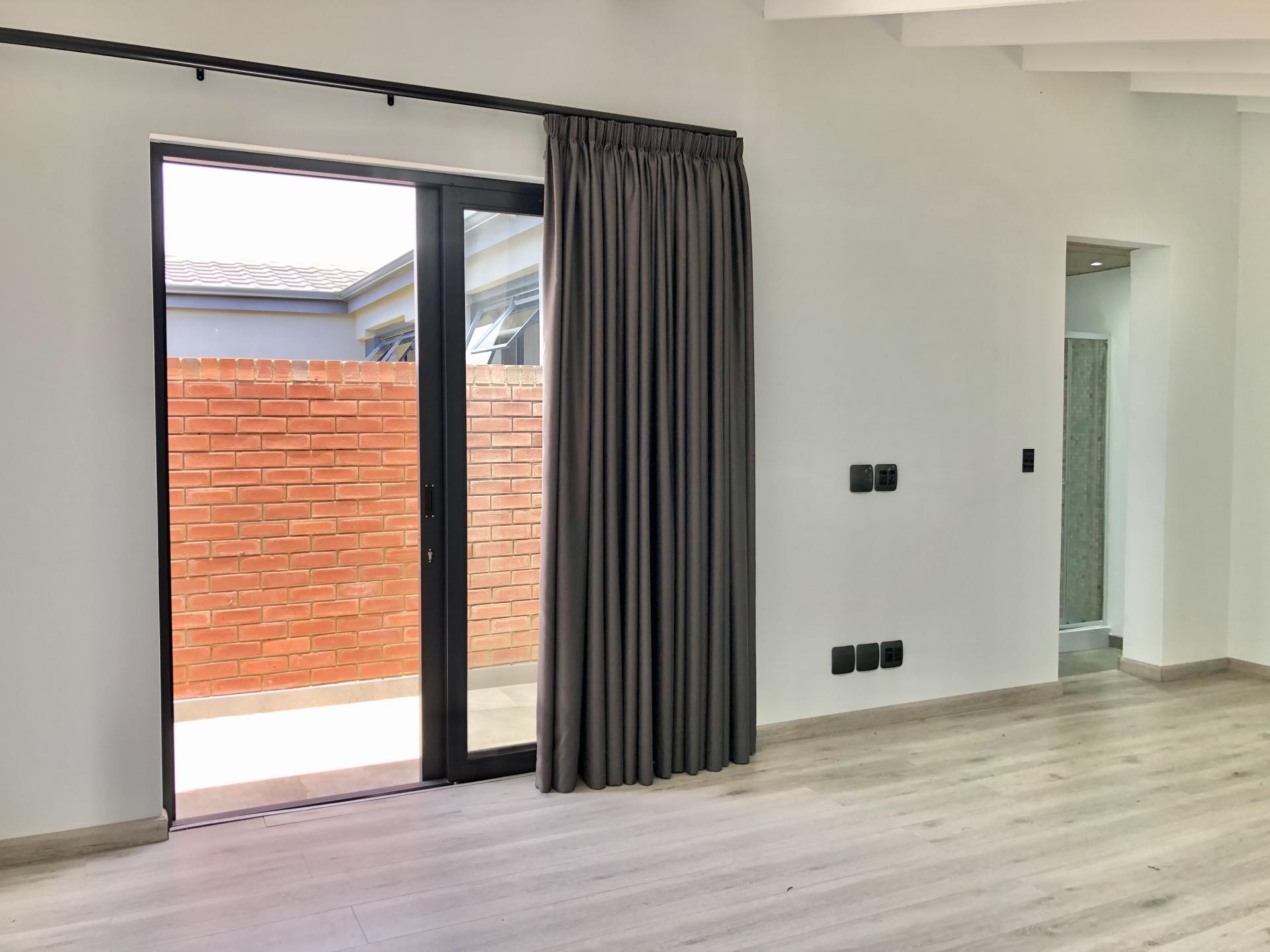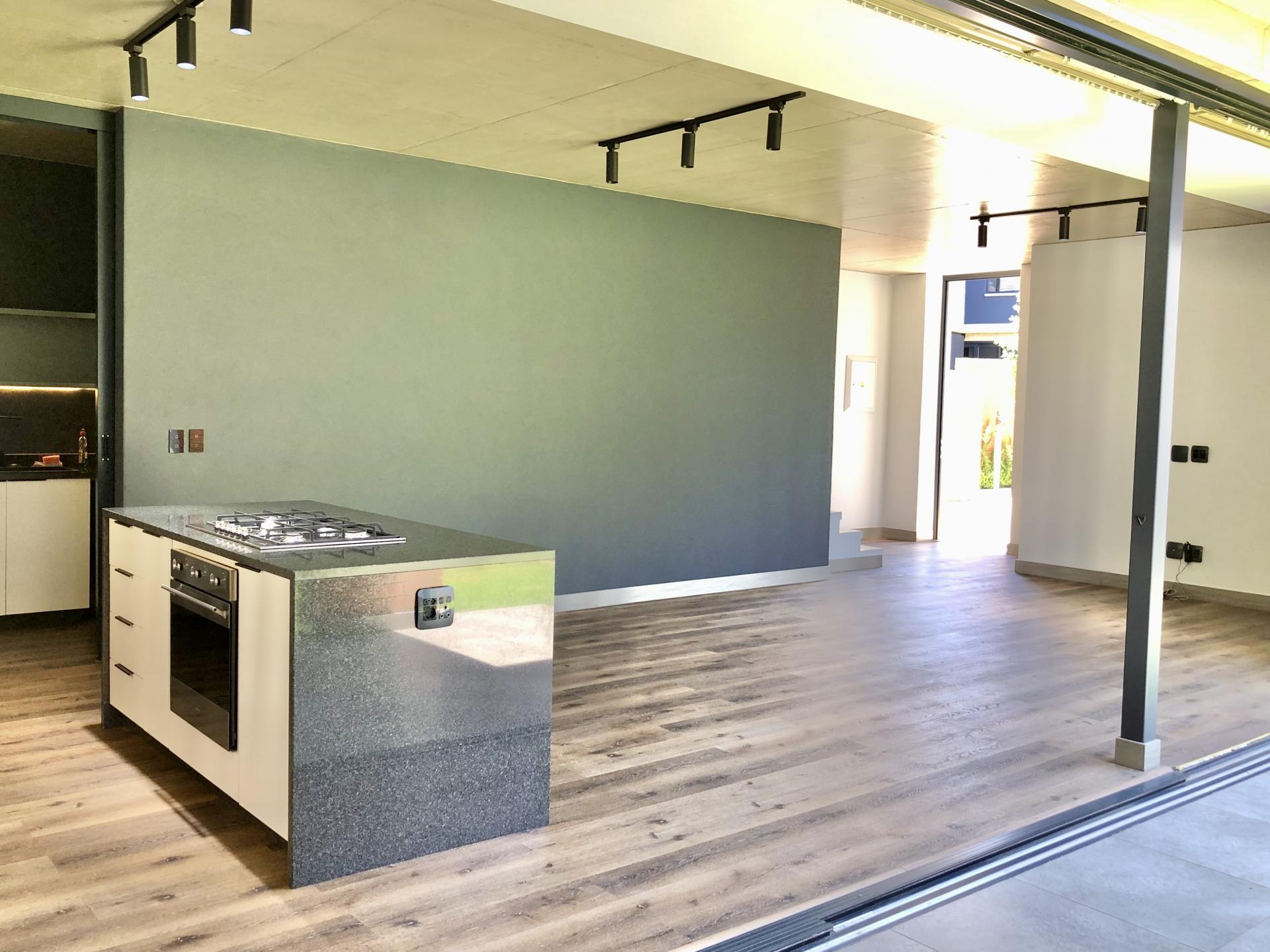 The open-plan layout greets you with a modern living area that flows seamlessly into a dining space and lounge, perfect for entertaining. The double aluminum glass sliding doors open onto the patio and braai area offering a relaxing outdoor dining experience.