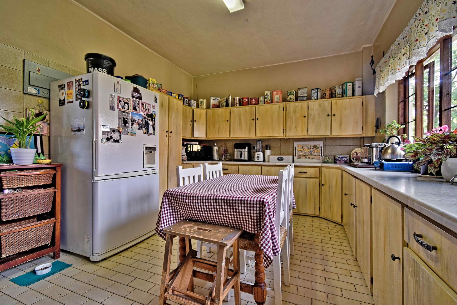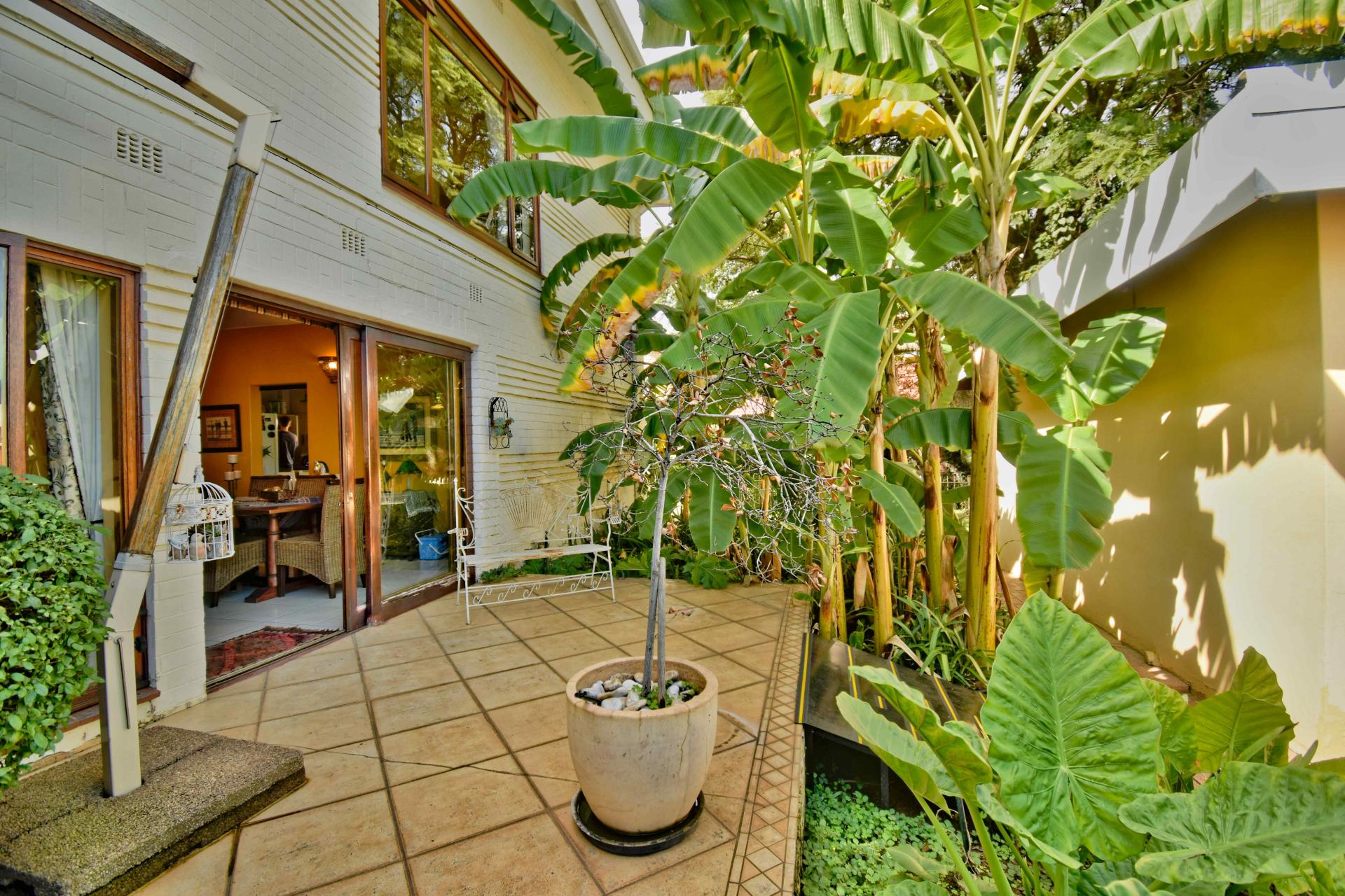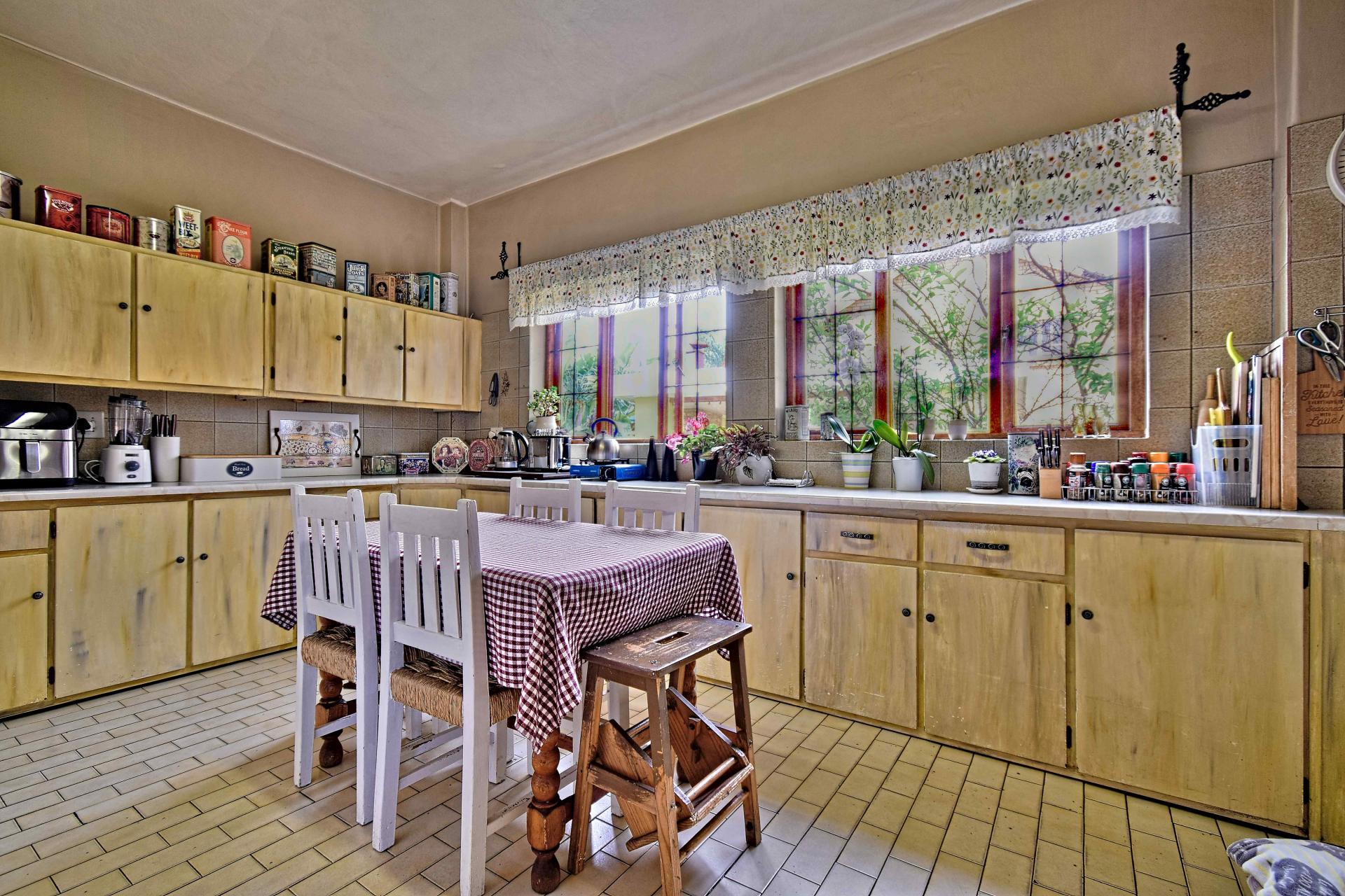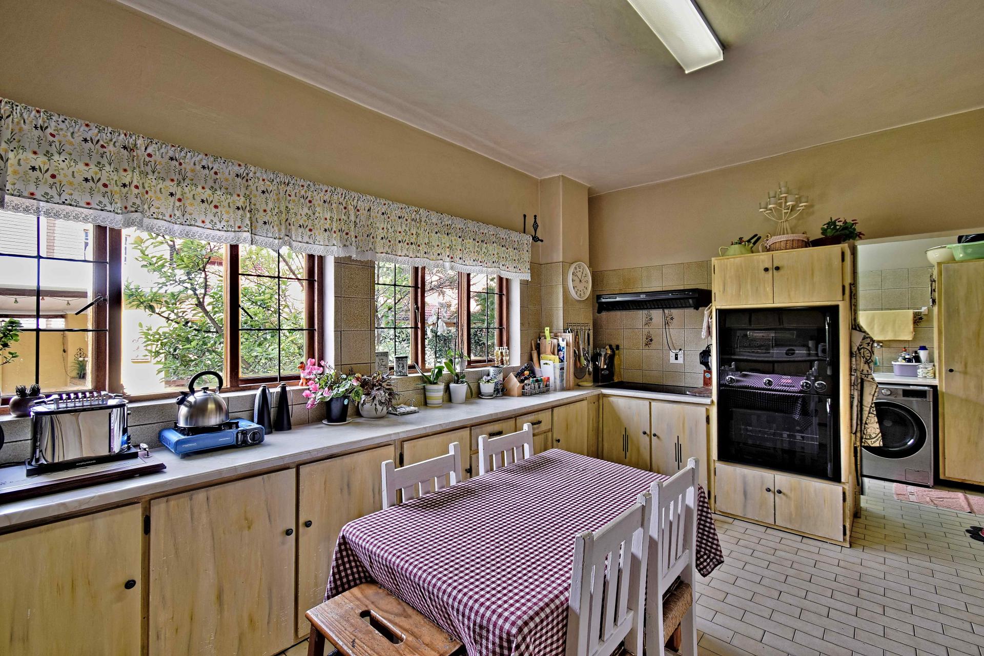 The tiled dining room flows seamlessly onto another patio overlooking the lush back garden, while the sunlit kitchen features ample cupboard space, large windows, and a separate scullery and wash-up area – functional and family-friendly.