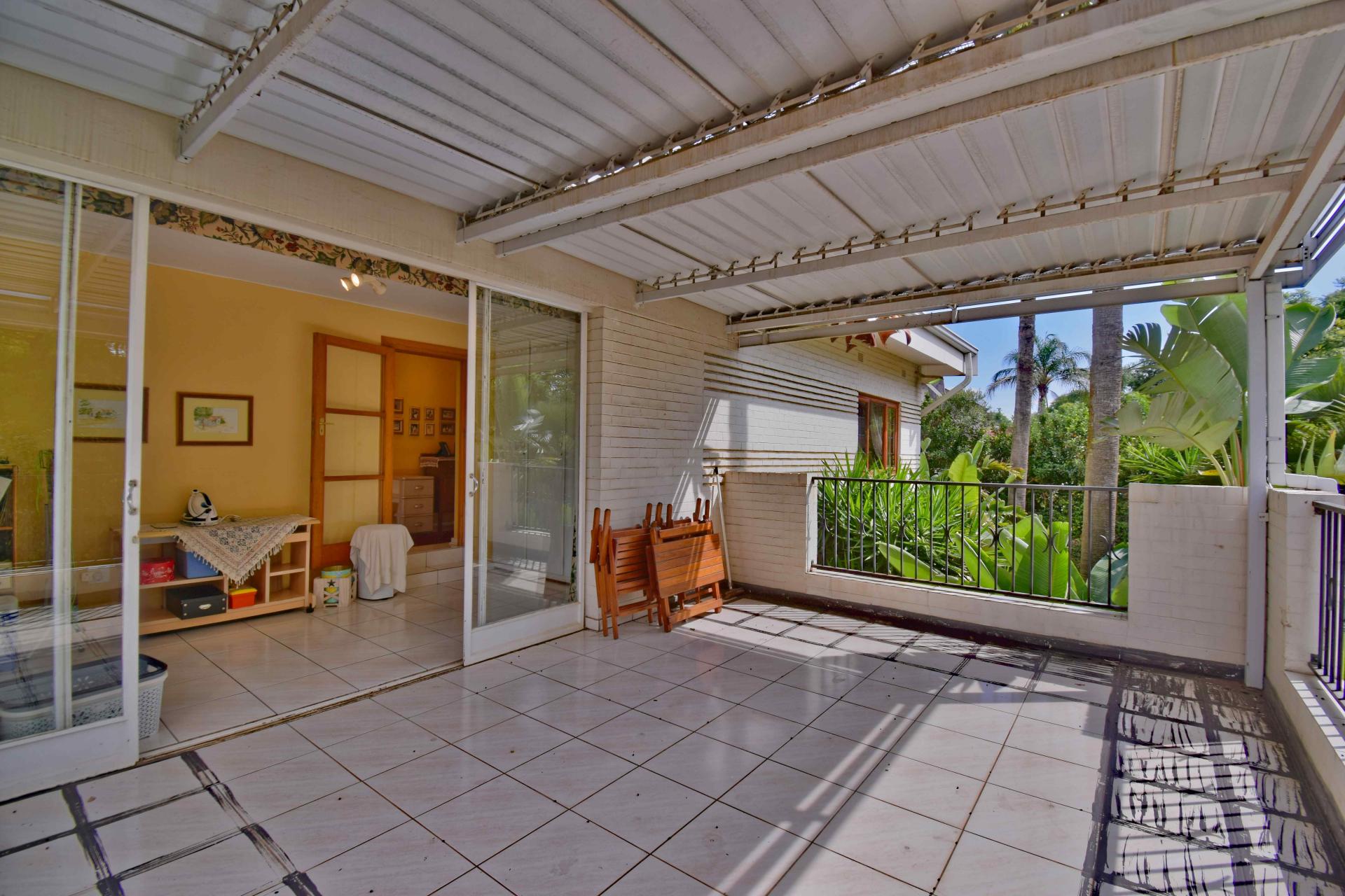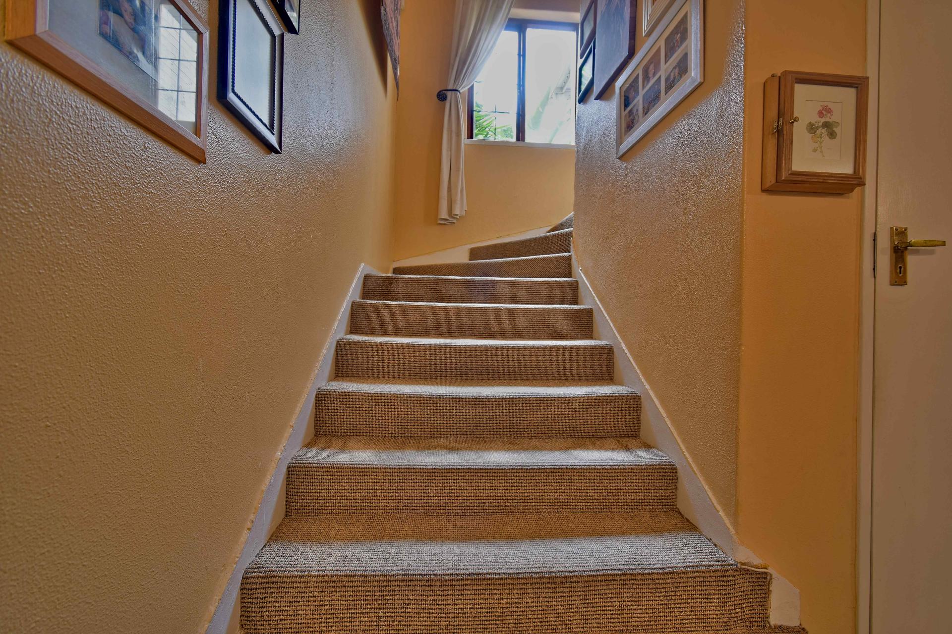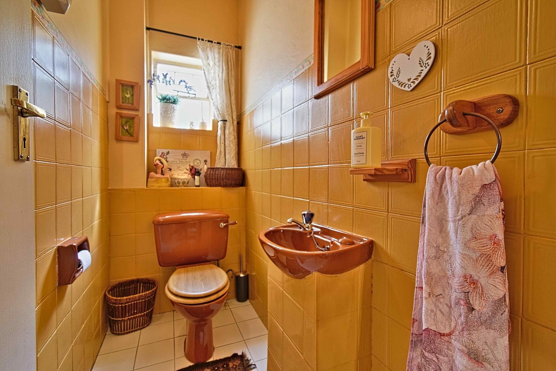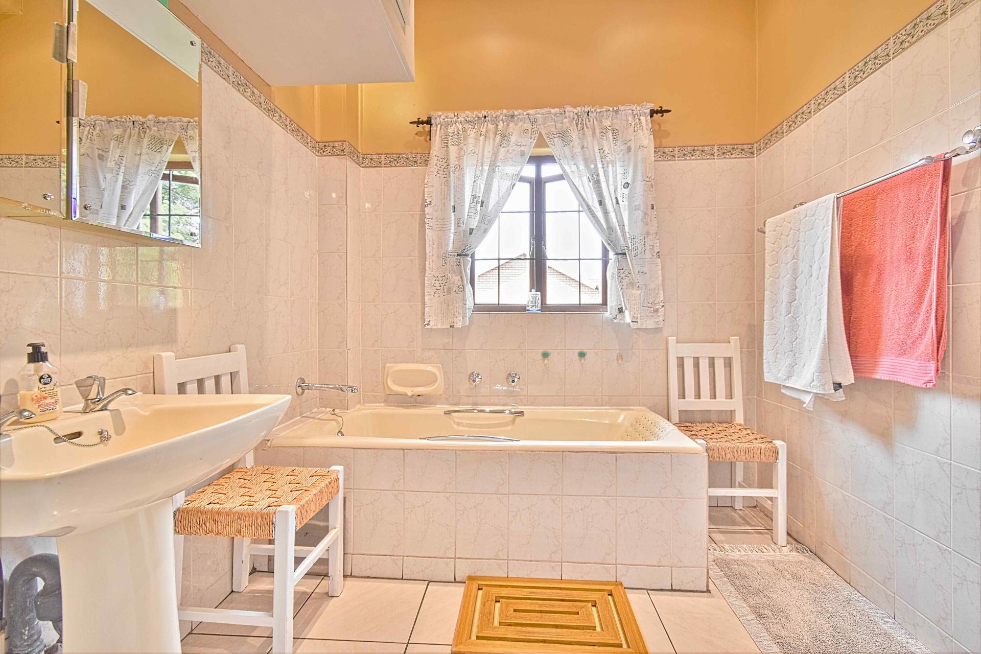 The tiled dining room flows seamlessly onto another patio overlooking the lush back garden, while the sunlit kitchen features ample cupboard space, large windows, and a separate scullery and wash-up area – functional and family-friendly.