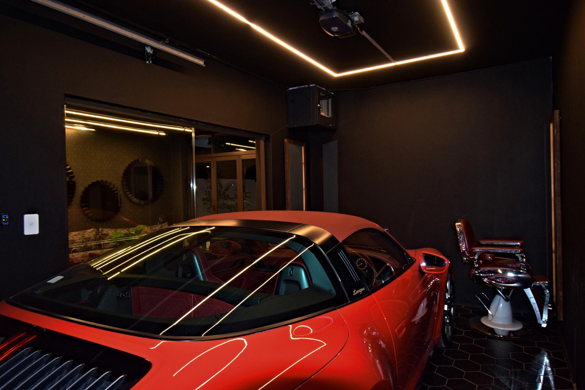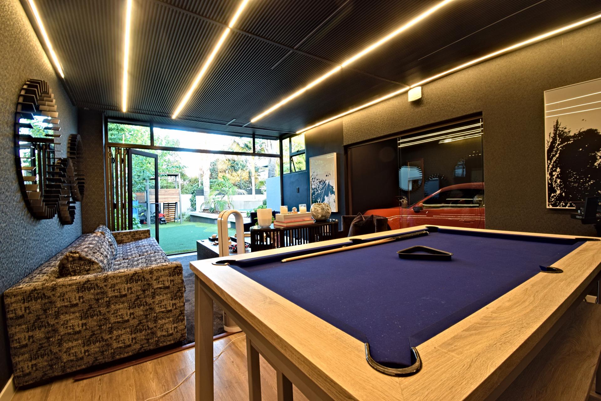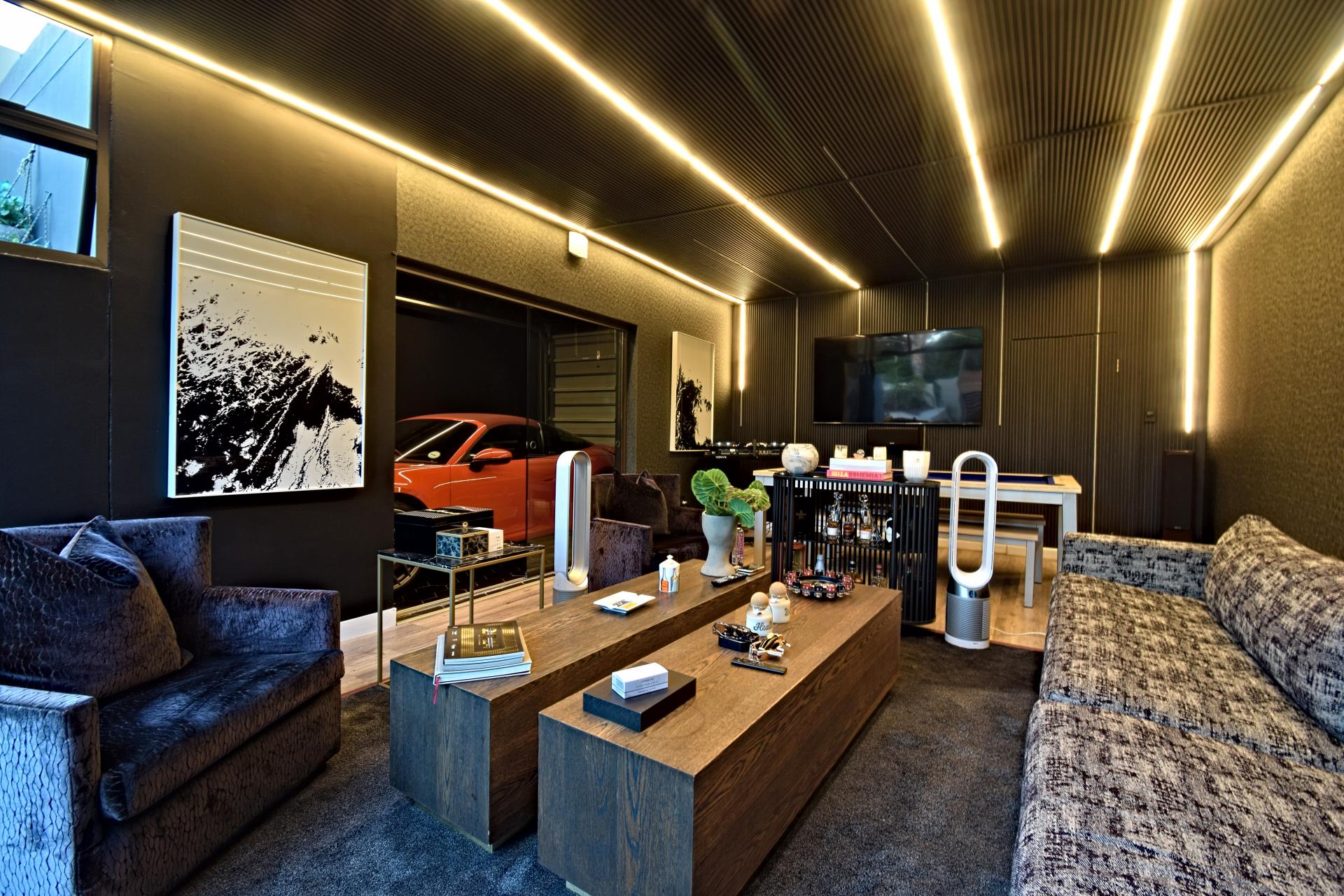 -A private entertainment room with a glass partition showcasing the fourth garage—an architectural statement.