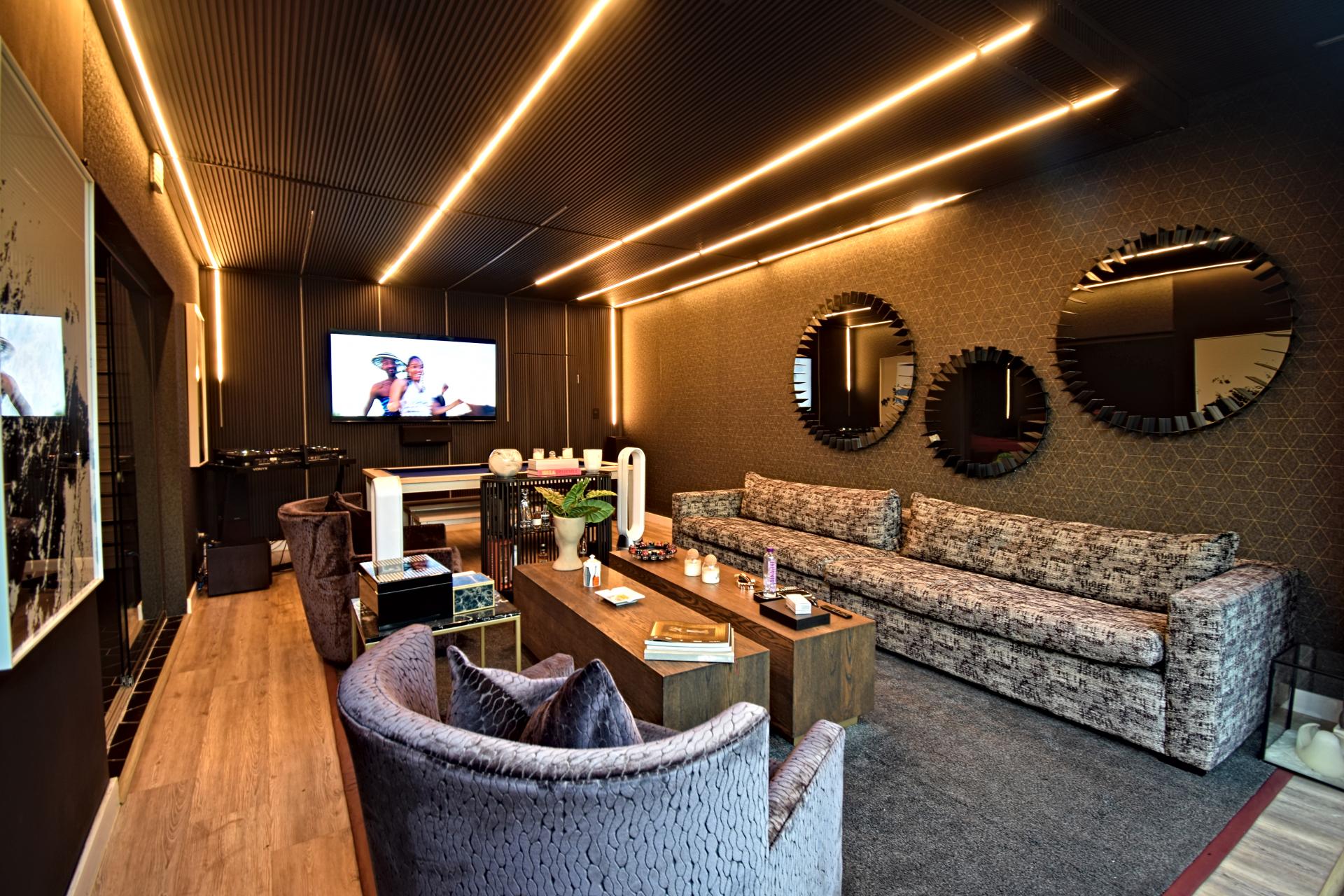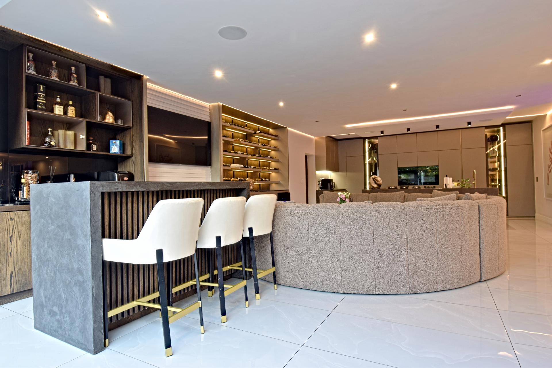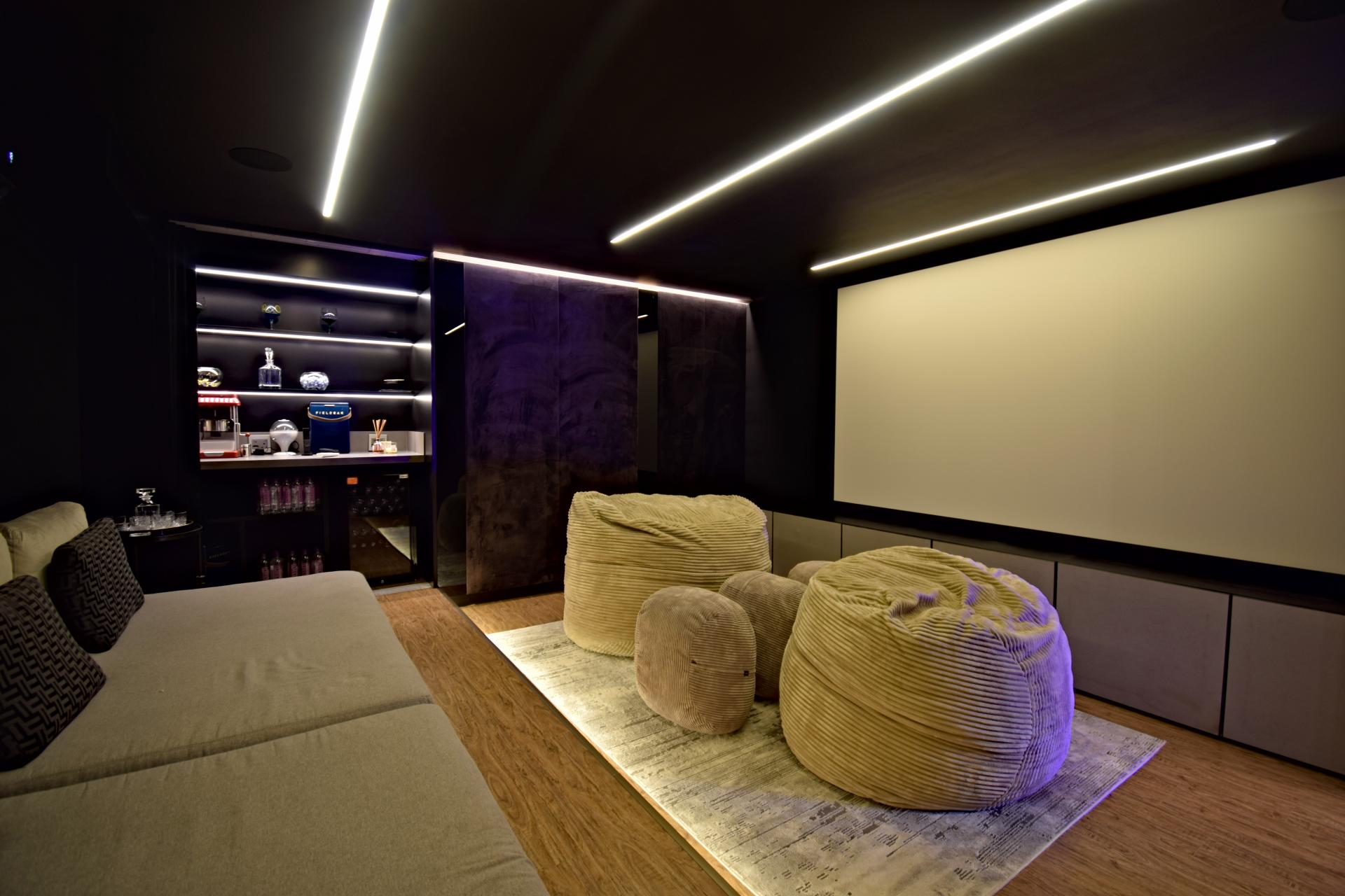 Cinema Room: Dark walls, luxurious finishes, and a built-in bar set the stage for private screenings.