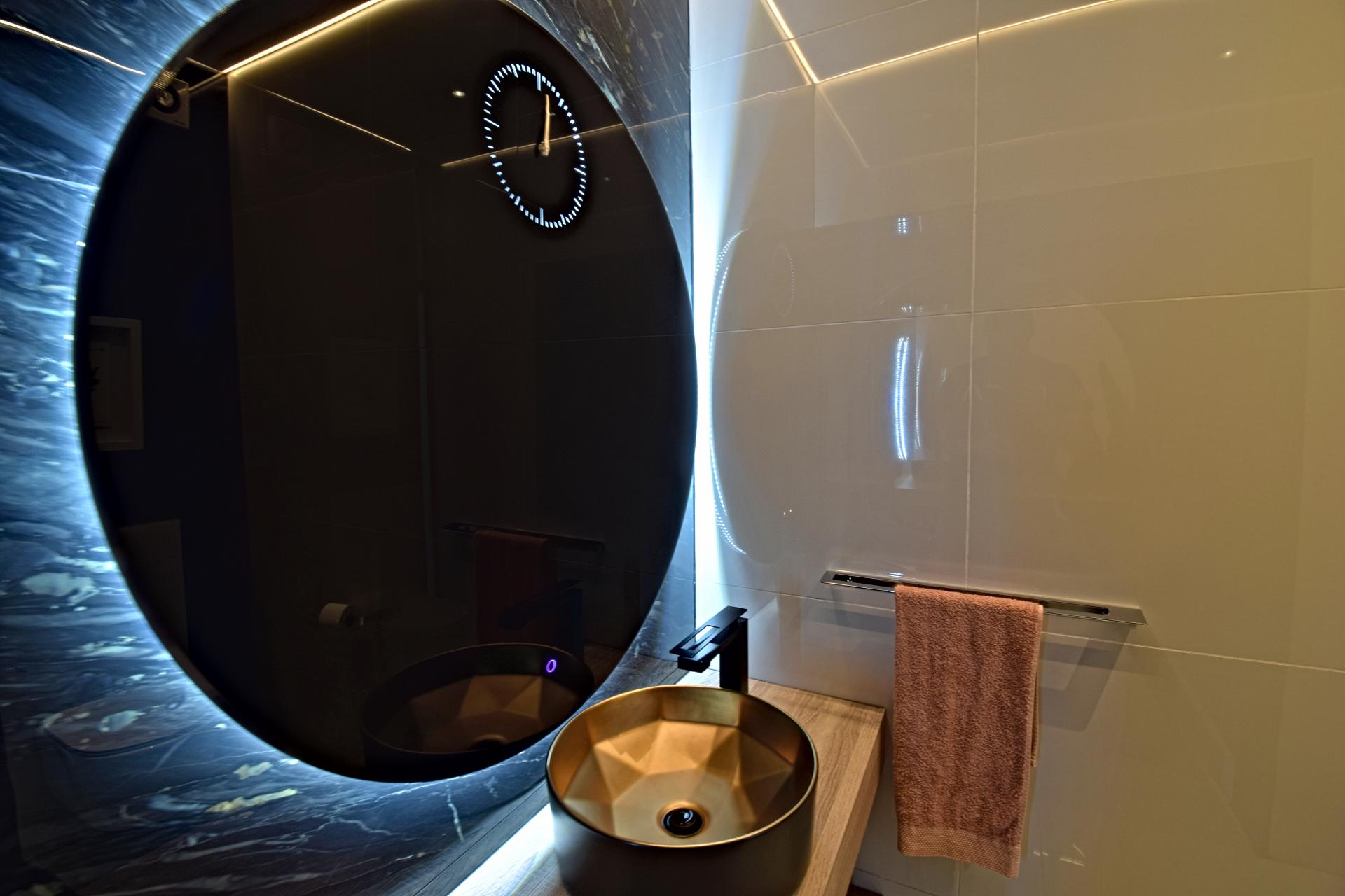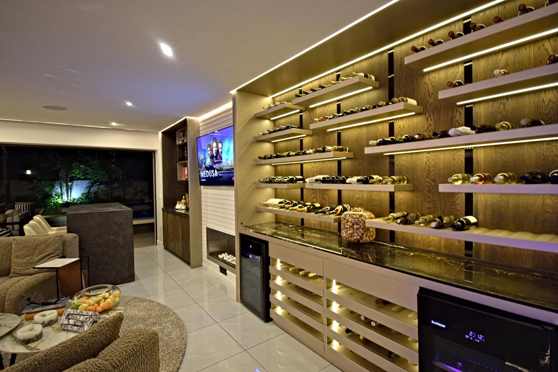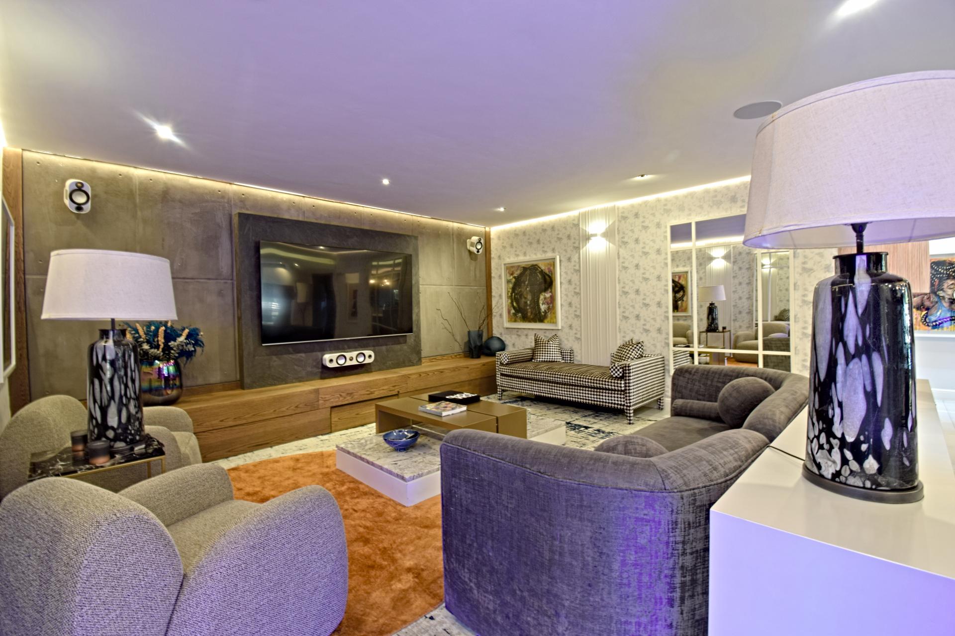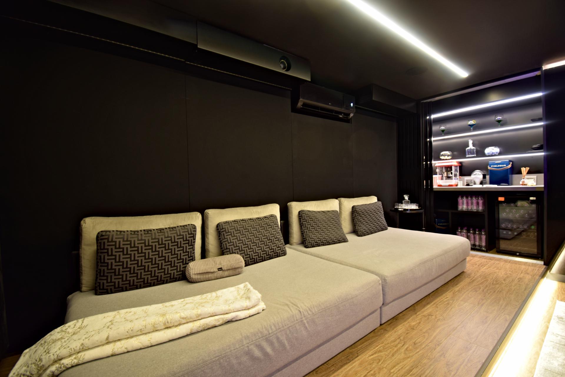 Cinema Room: Dark walls, luxurious finishes, and a built-in bar set the stage for private screenings.