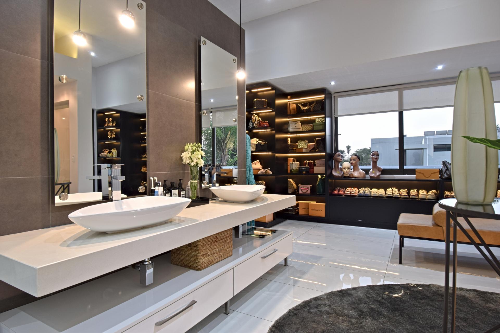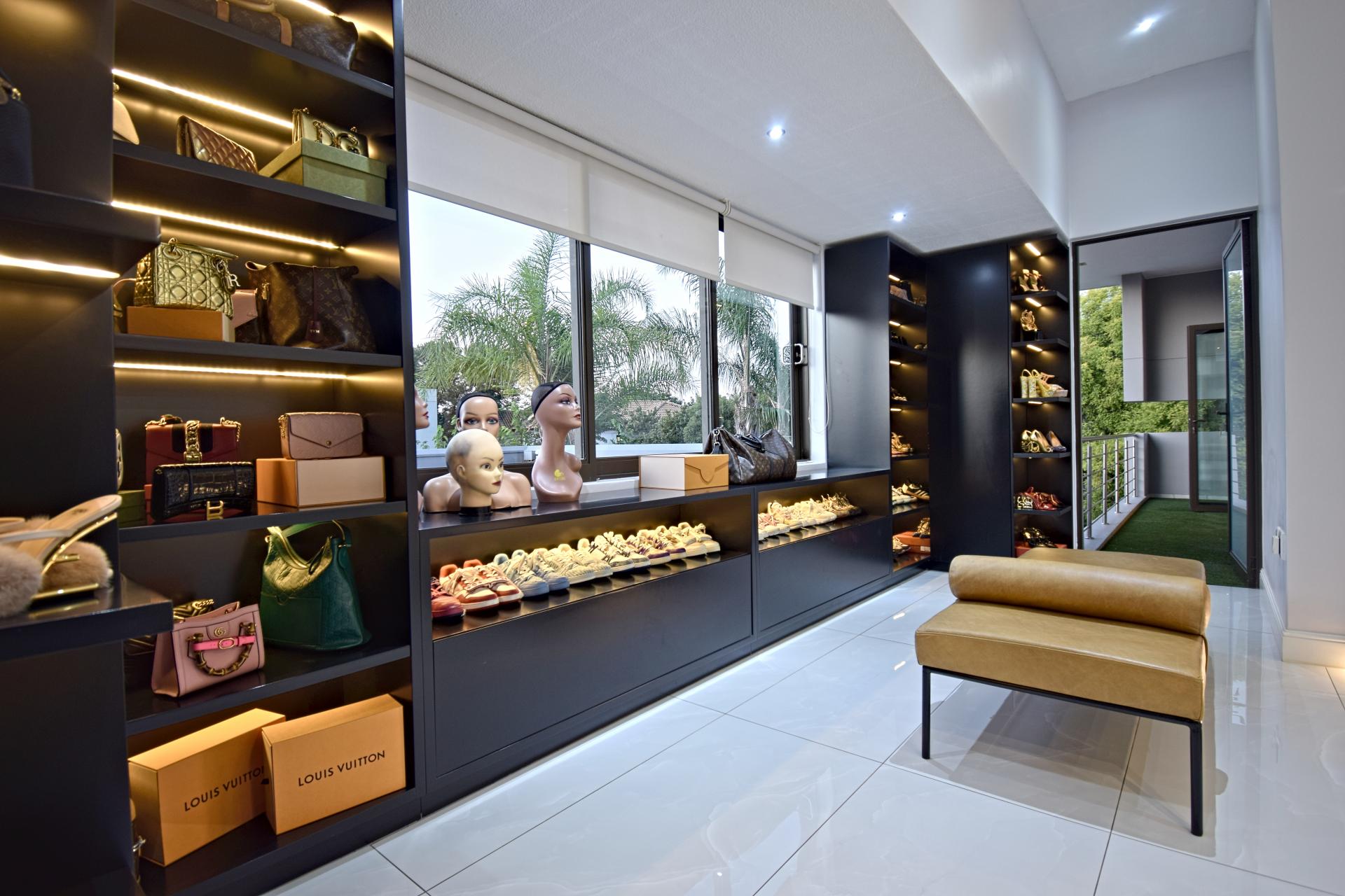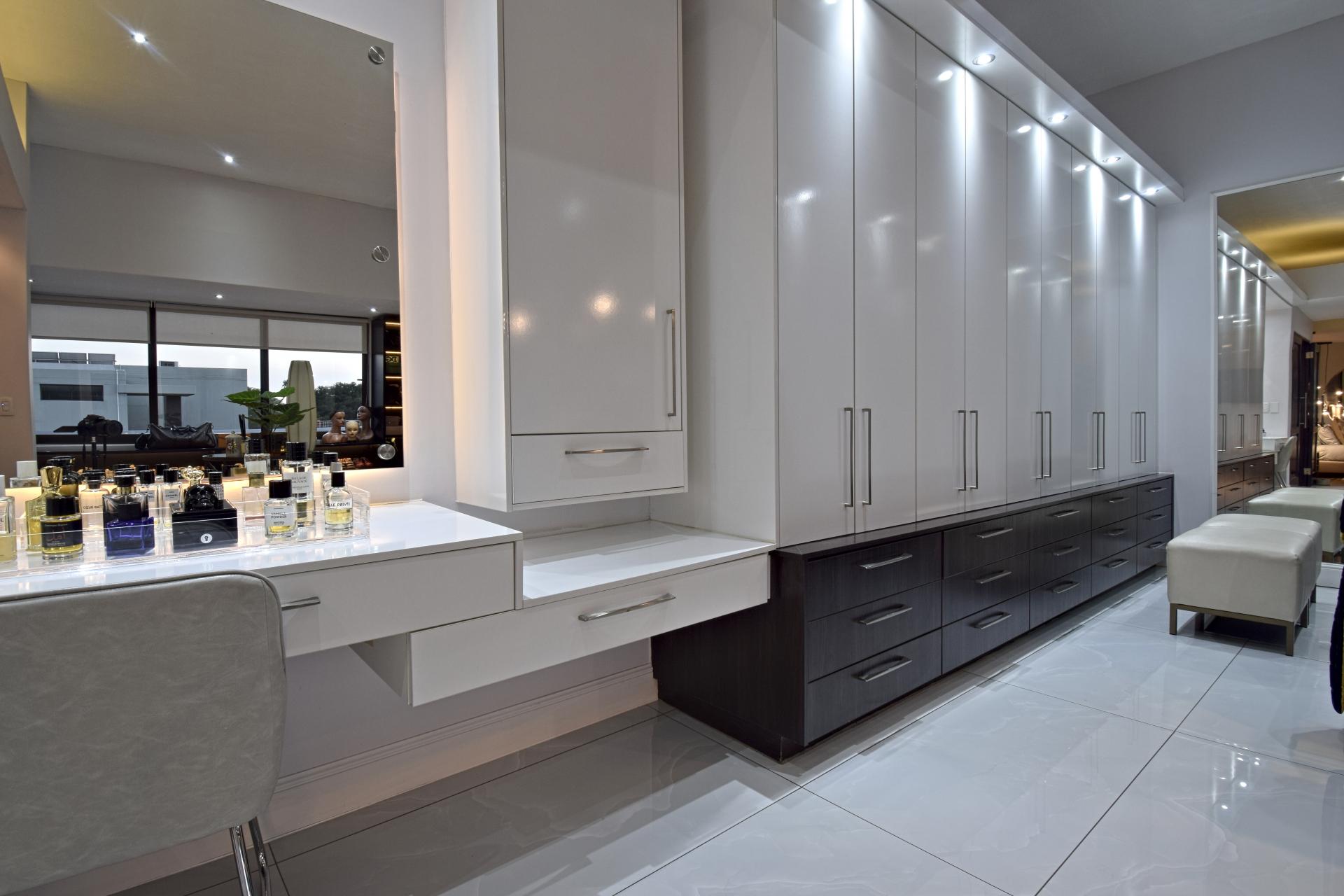 Custom-designed dressing room with sleek cabinetry and open shelving