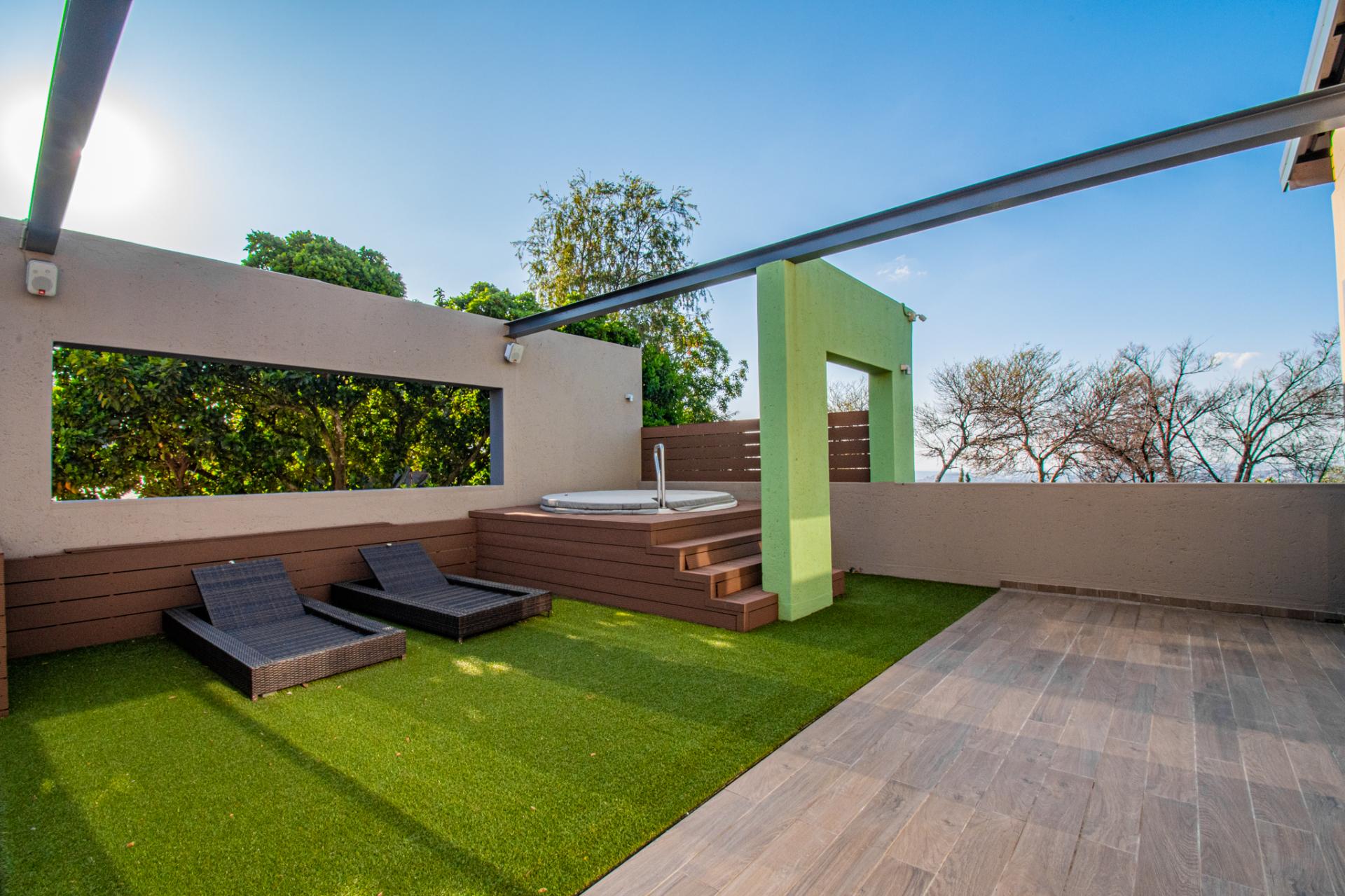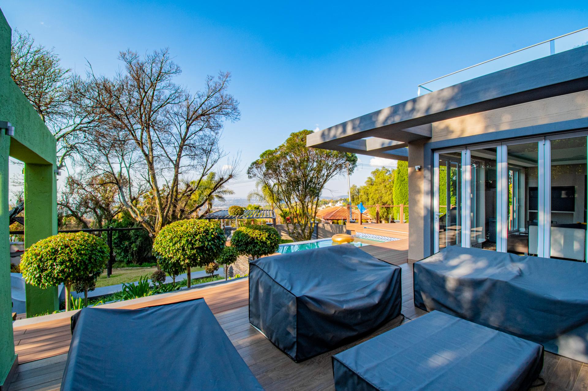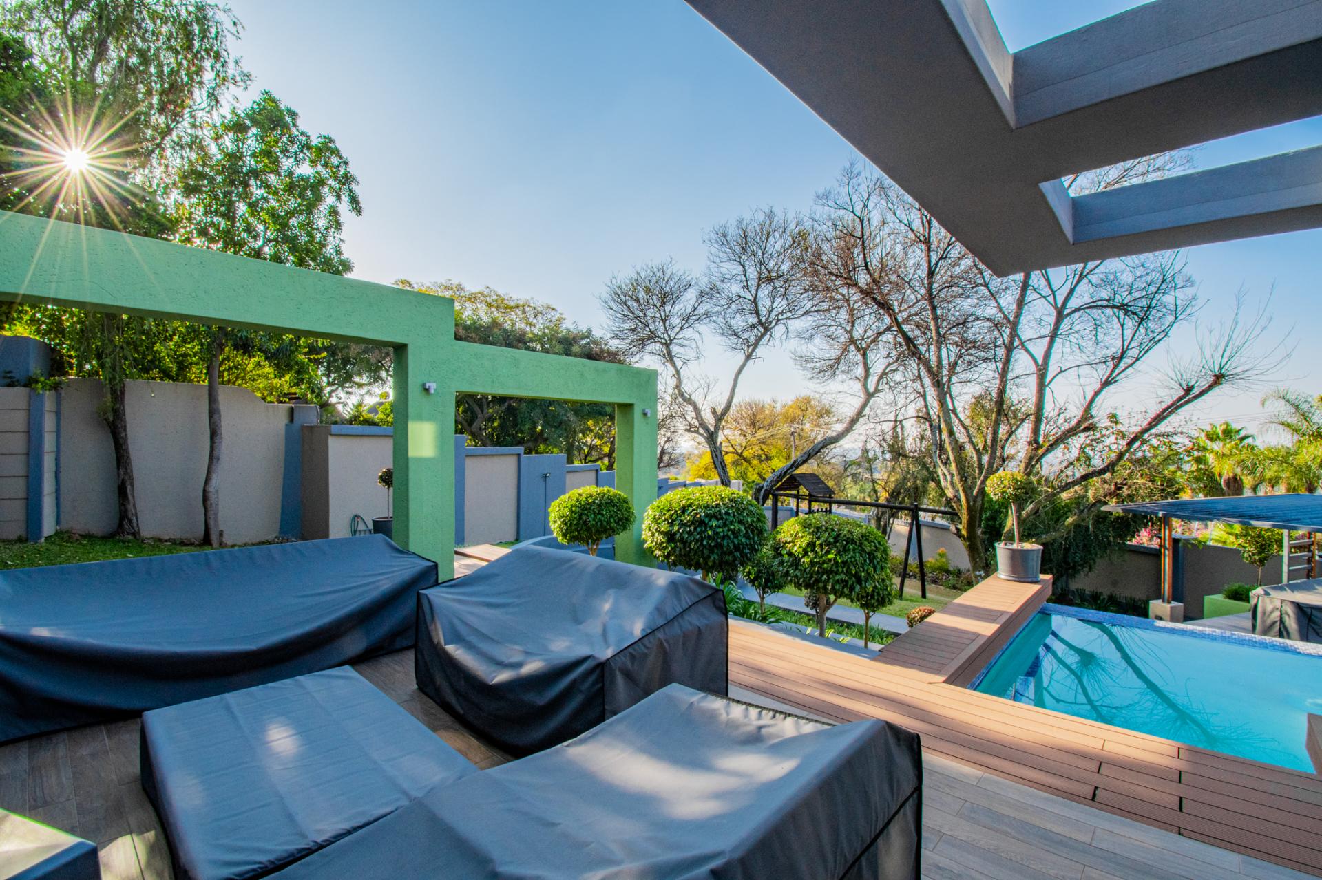 The outdoor living spaces are an extension of the home's artful design, offering multiple terraces, a state-of-the-art infinity pool, and meticulously manicured gardens. Whether you're lounging by the pool or hosting gatherings on the spacious patio, the backdrop of Pretoria East's natural beauty sets an enchanting stage for every occasion.