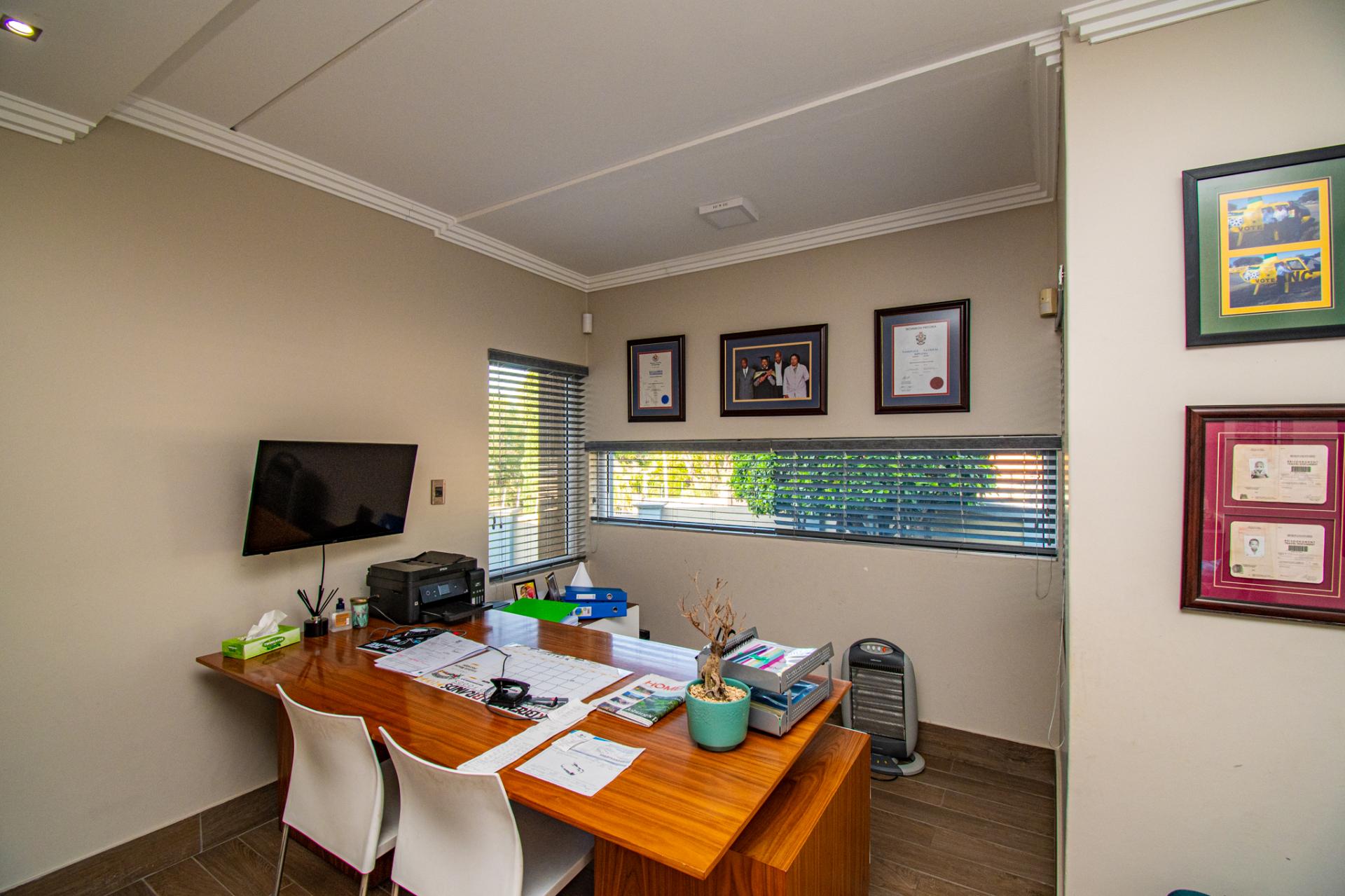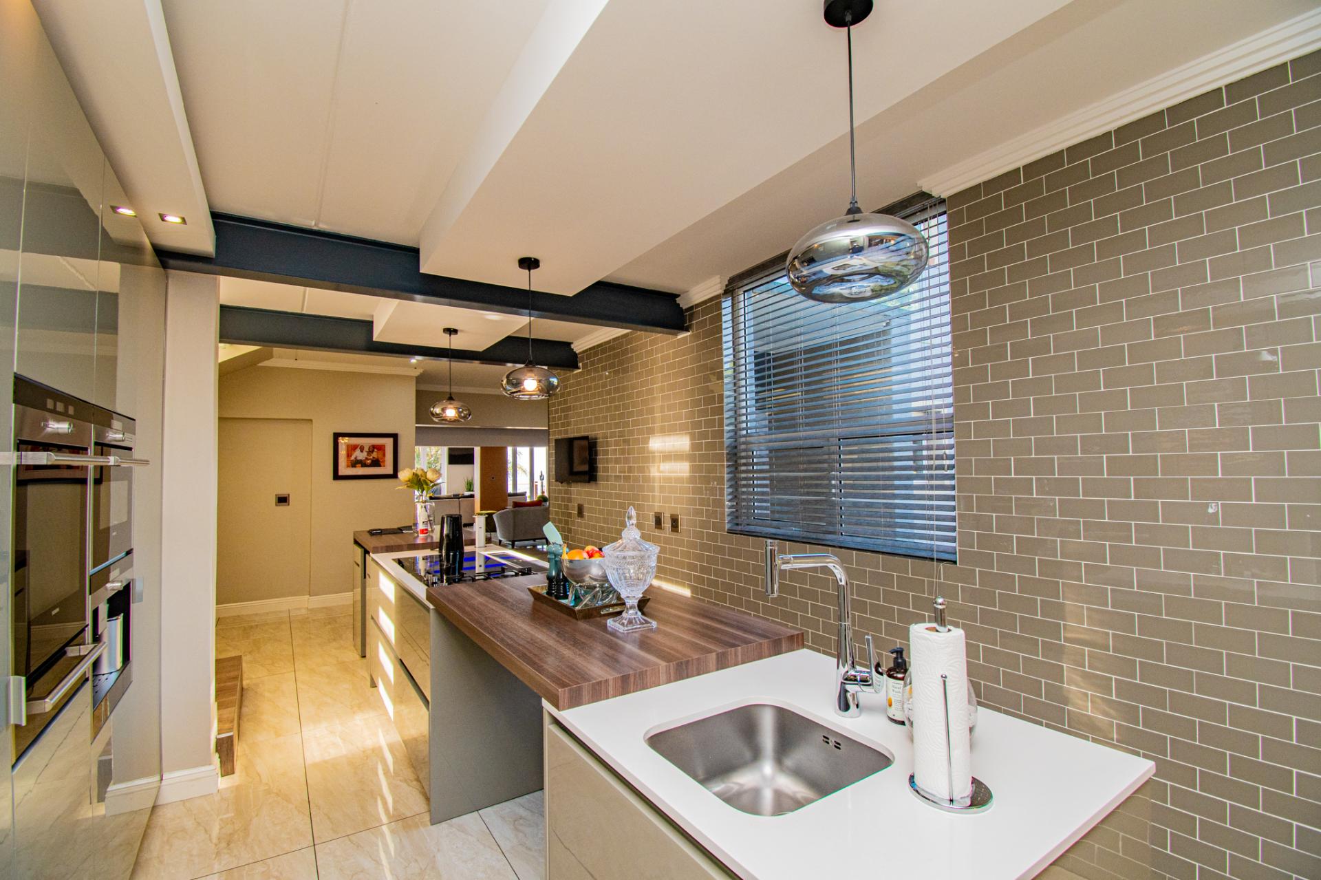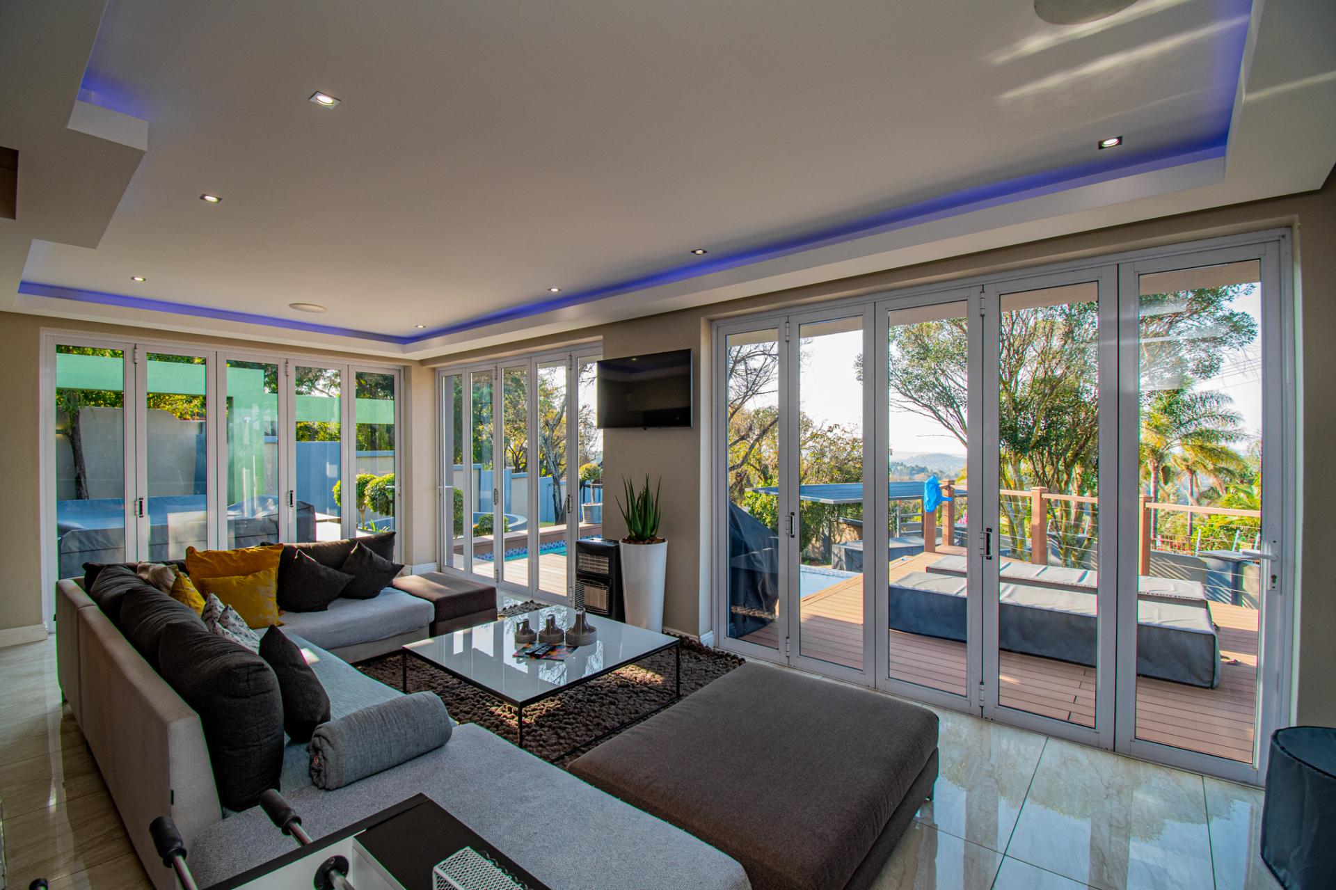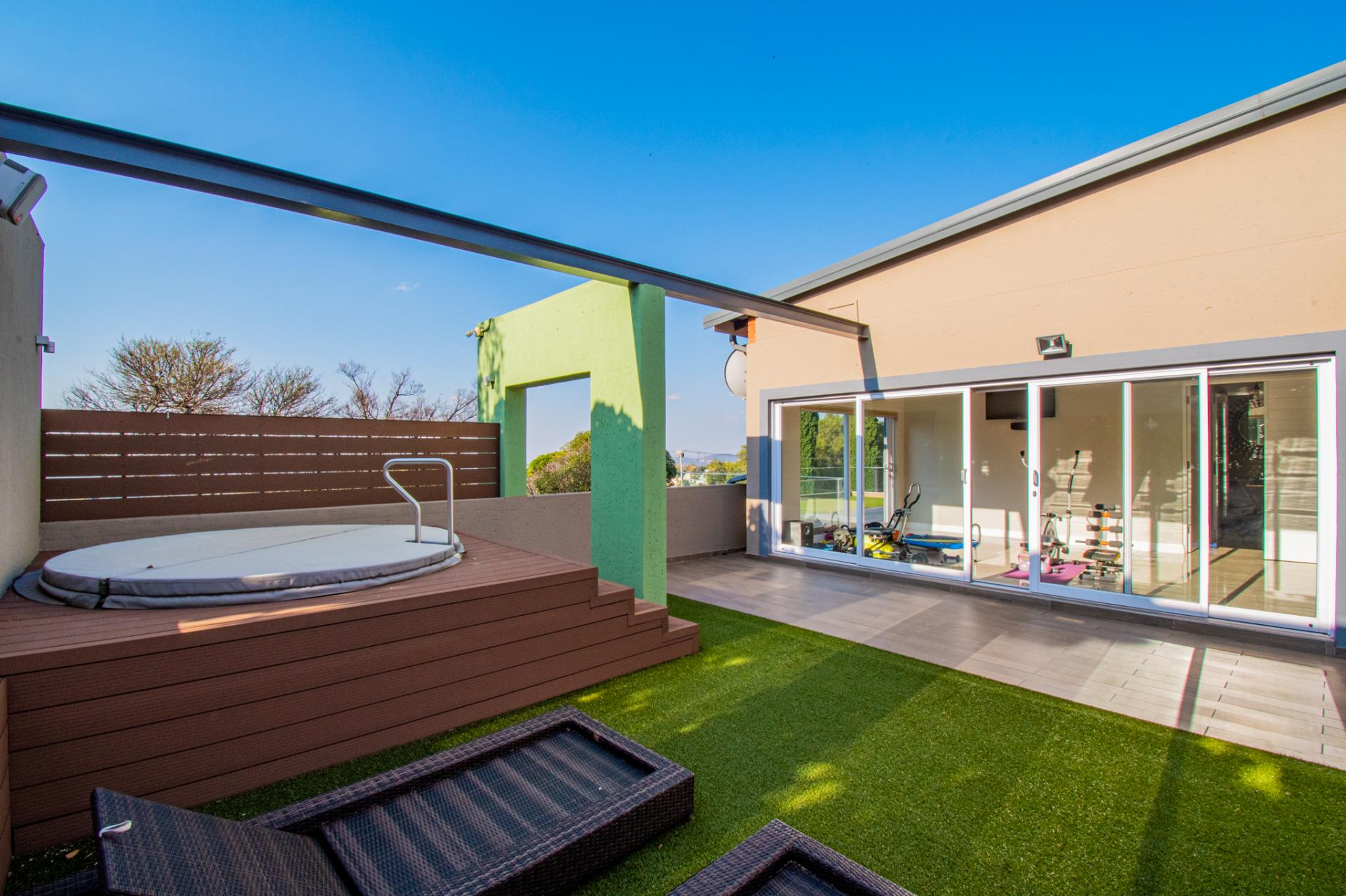 The outdoor living spaces are an extension of the home's artful design, offering multiple terraces, a state-of-the-art infinity pool, and meticulously manicured gardens. Whether you're lounging by the pool or hosting gatherings on the spacious patio, the backdrop of Pretoria East's natural beauty sets an enchanting stage for every occasion.