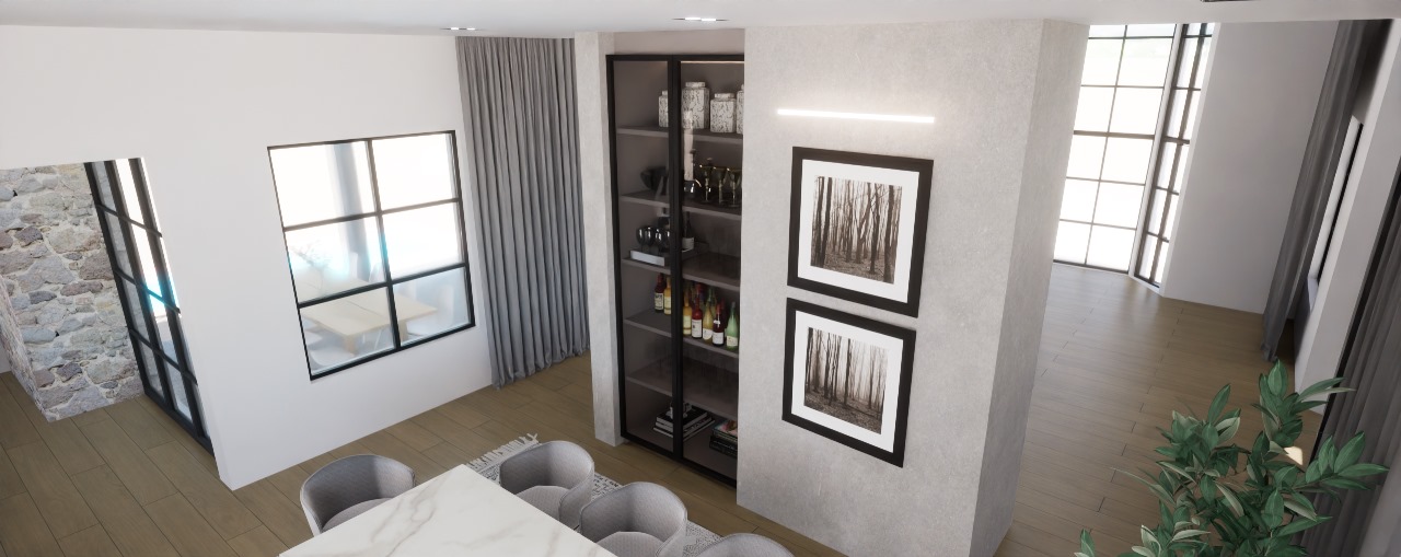 A modern kitchen with a walk-in pantry and an integrated fridge.