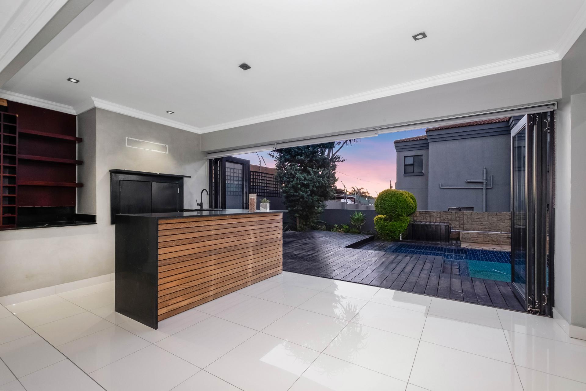 Step outside to a neatly decked area that overlooks the sparkling pool that offers a tranquil water feature for added ambiance. The indoor bar is perfect for hosting, complete with an enclosed braai, sink, and built-in wine rack.